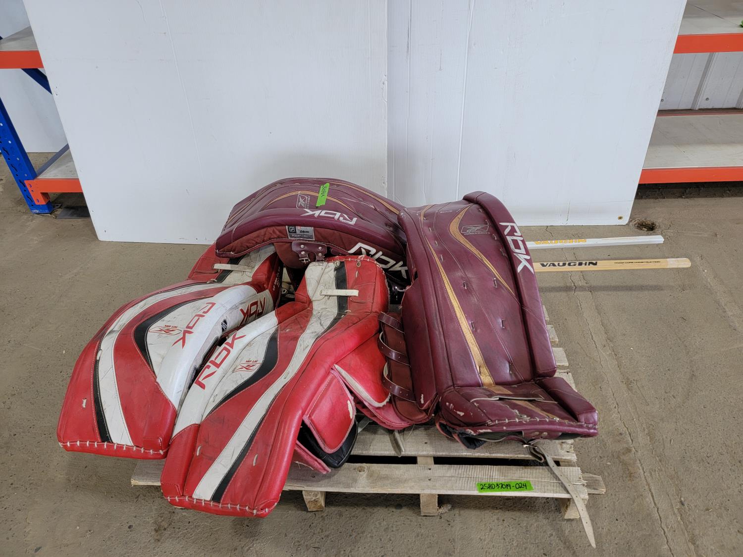 1358 Qty of Hockey Goalie Pads and Goalie Sticks