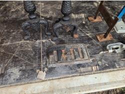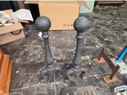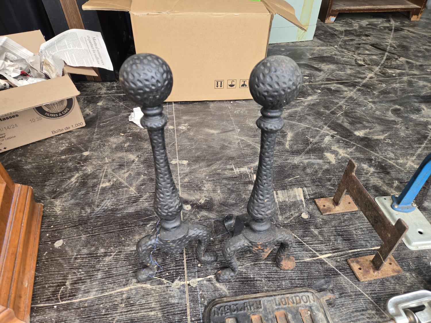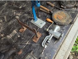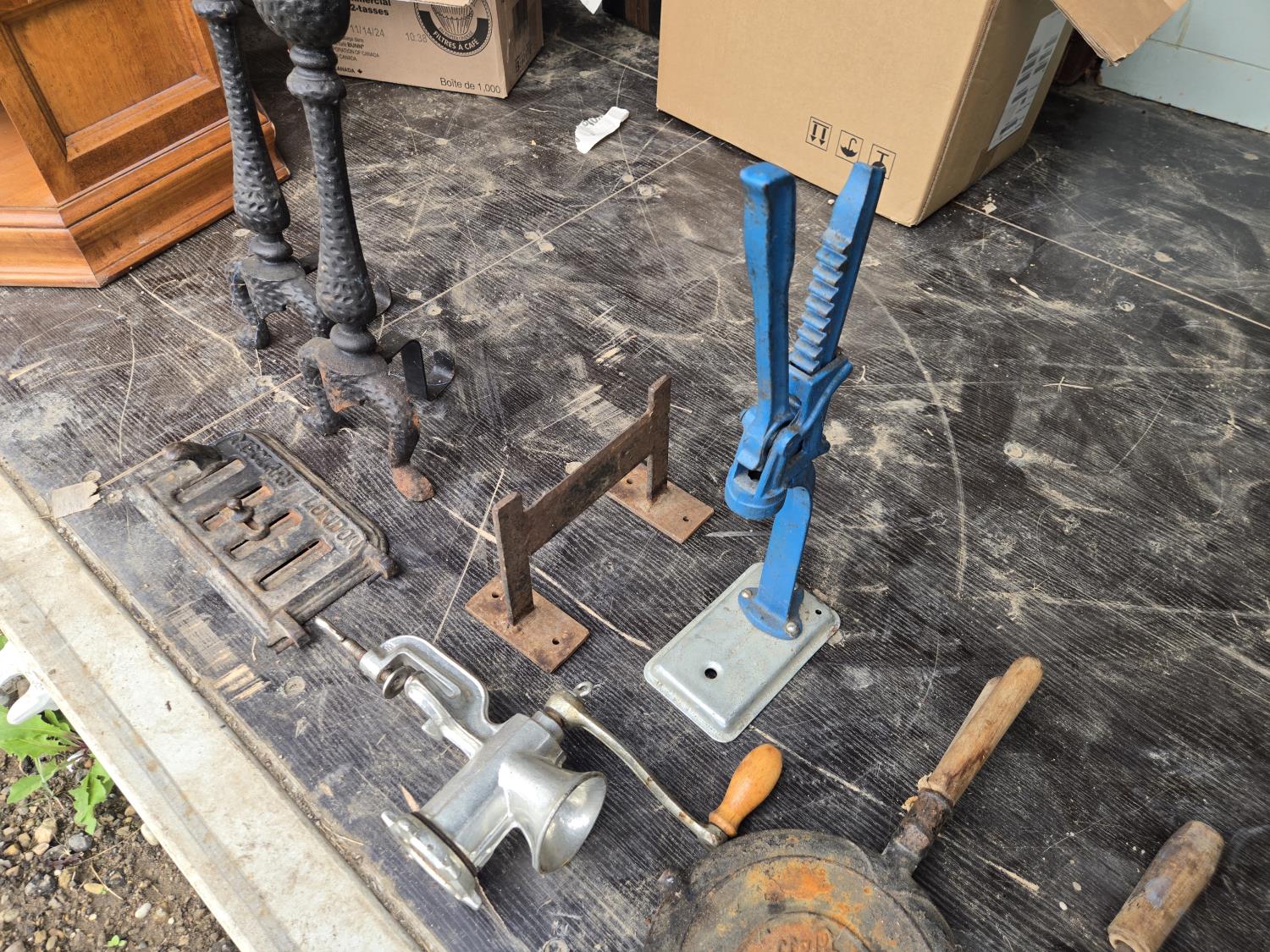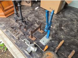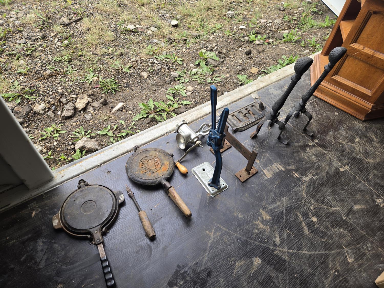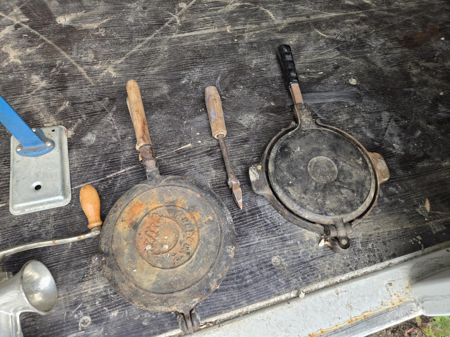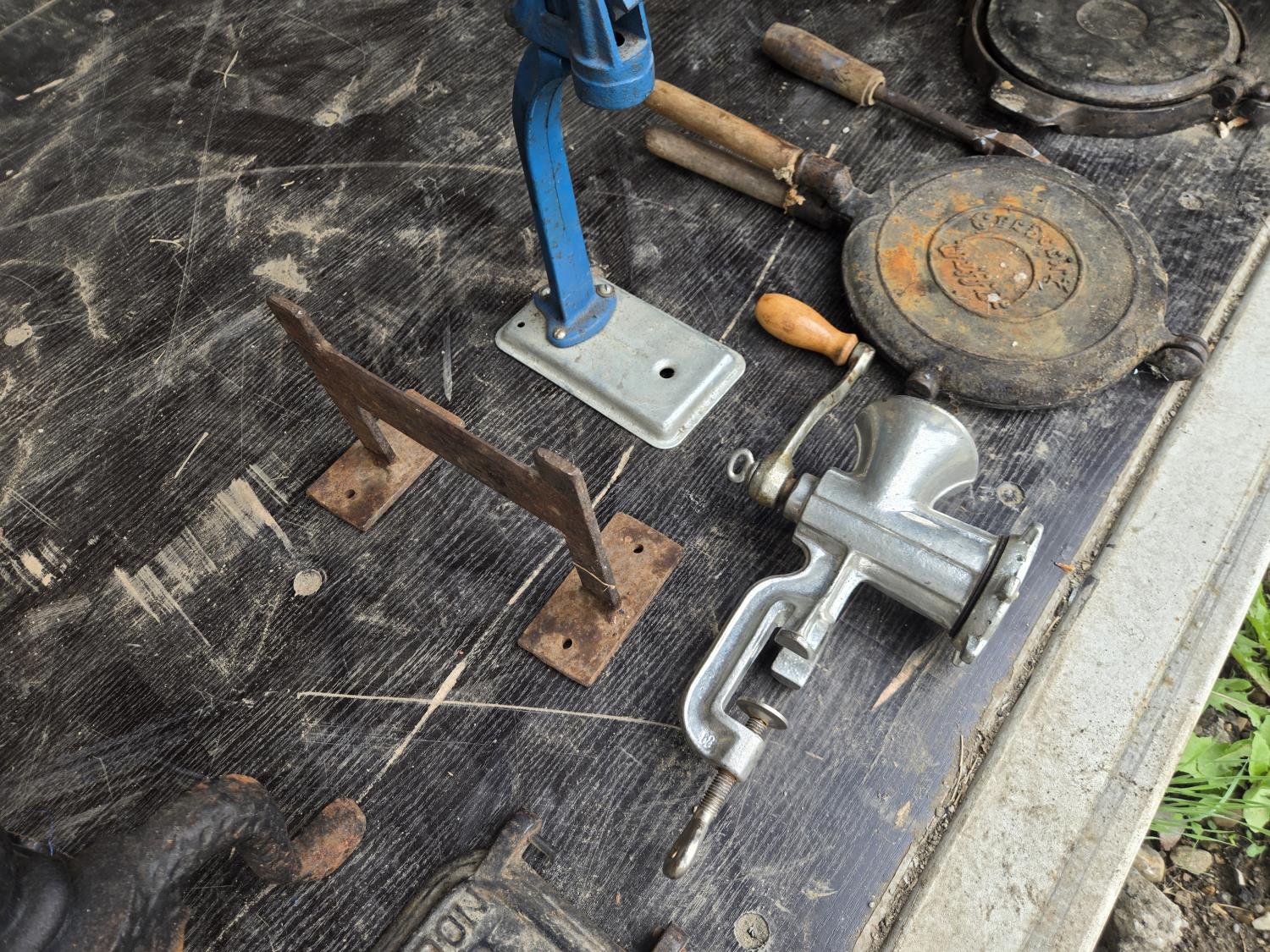 (2) Waffle irons, meat grinder, boot scraper, stove vent door, soldering iron, press, (2) metal stands