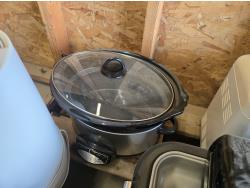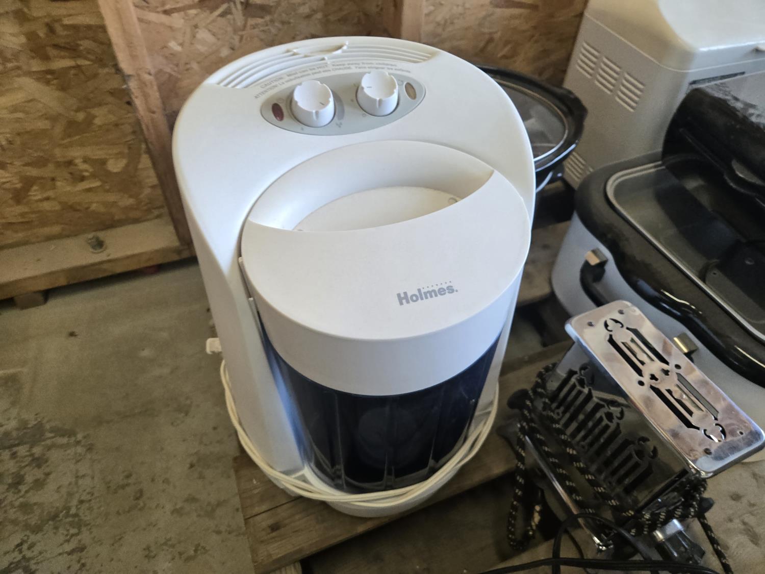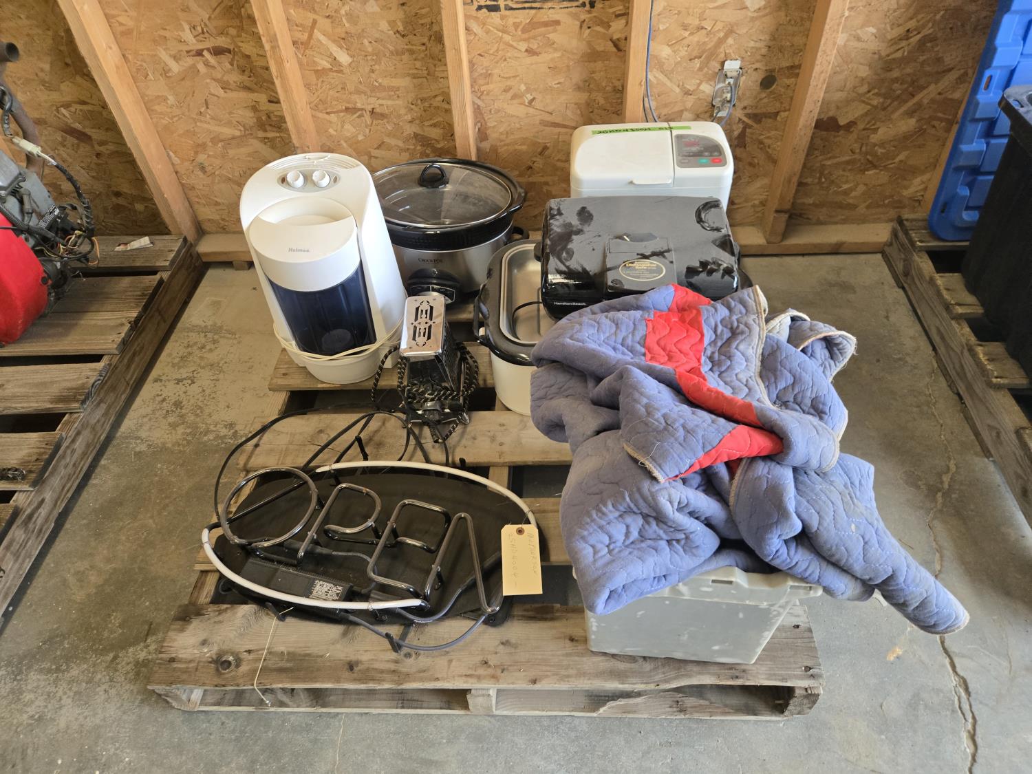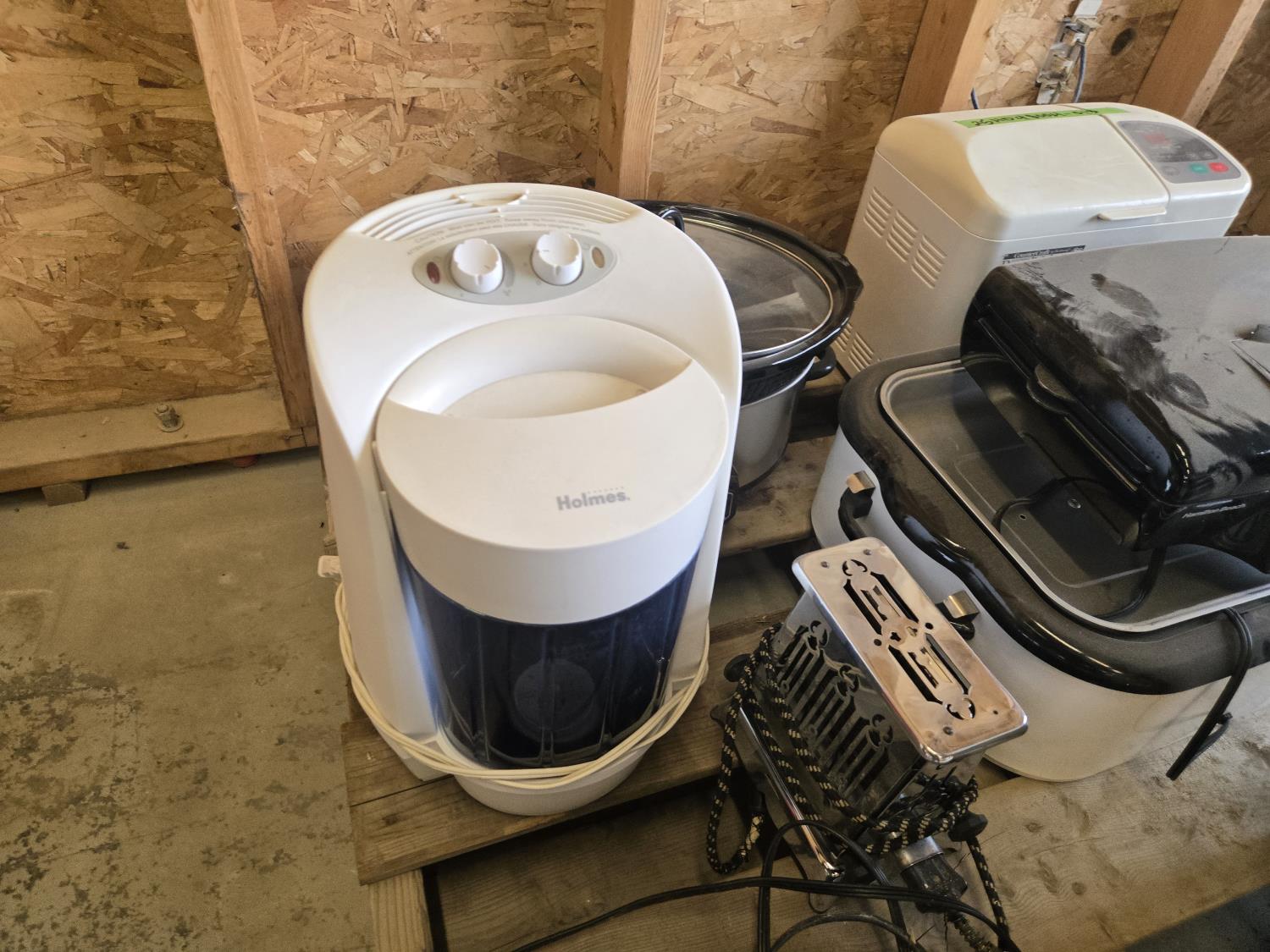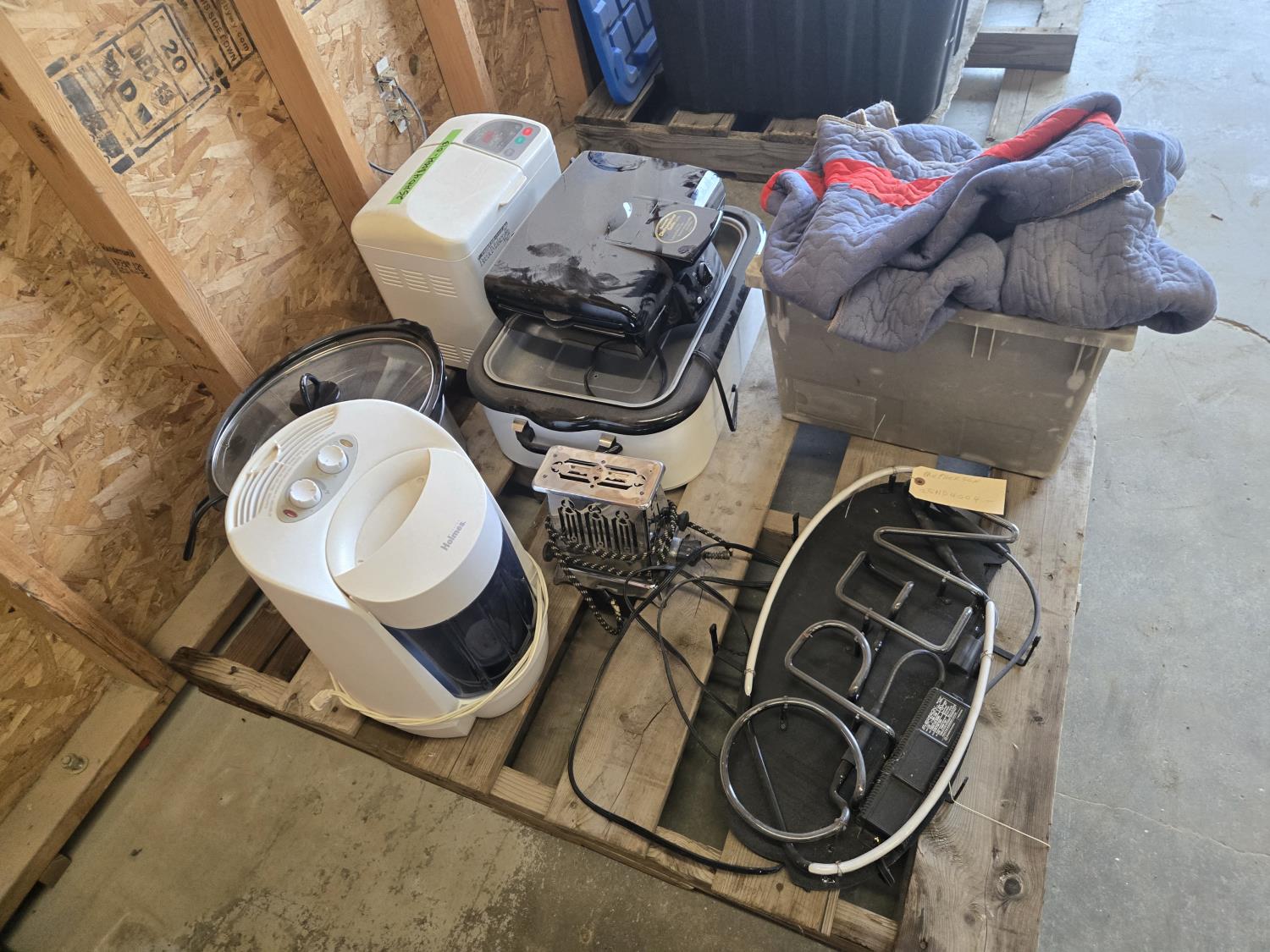 Bread maker, open sign, toaster, crock pot, tote of moving blankets, humidifier, kitchen utensils, electric Dutch oven, miscellaneous