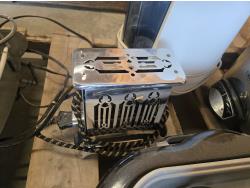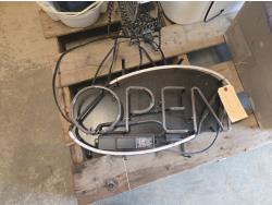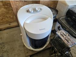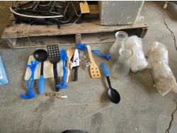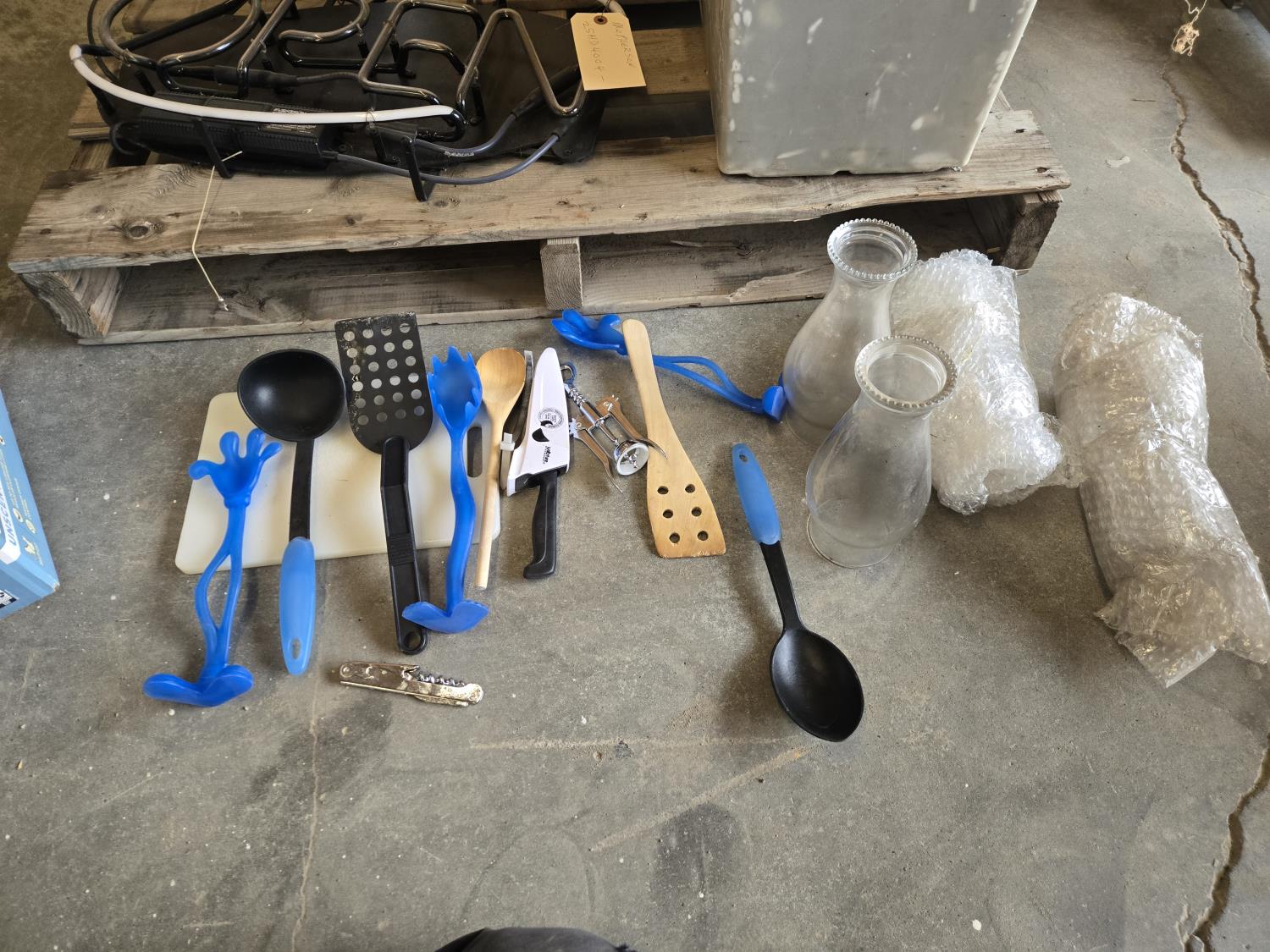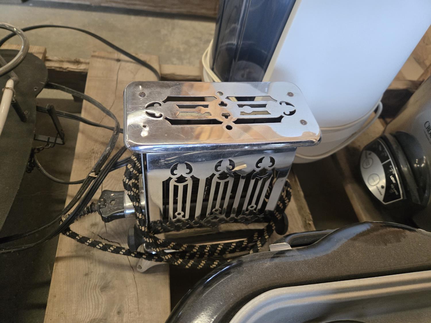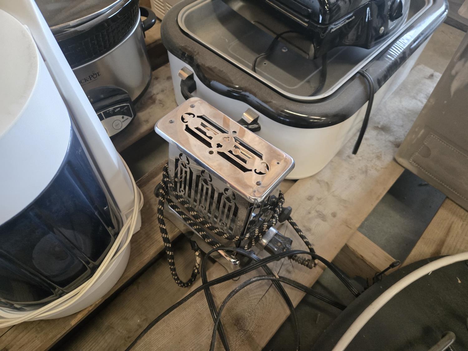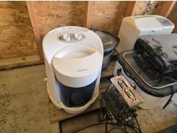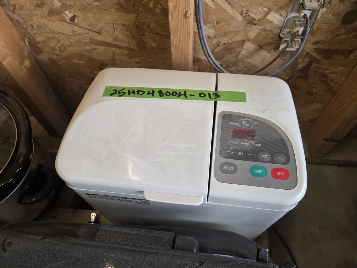 Bread maker, open sign, toaster, crock pot, tote of moving blankets, humidifier, kitchen utensils, electric Dutch oven, miscellaneous