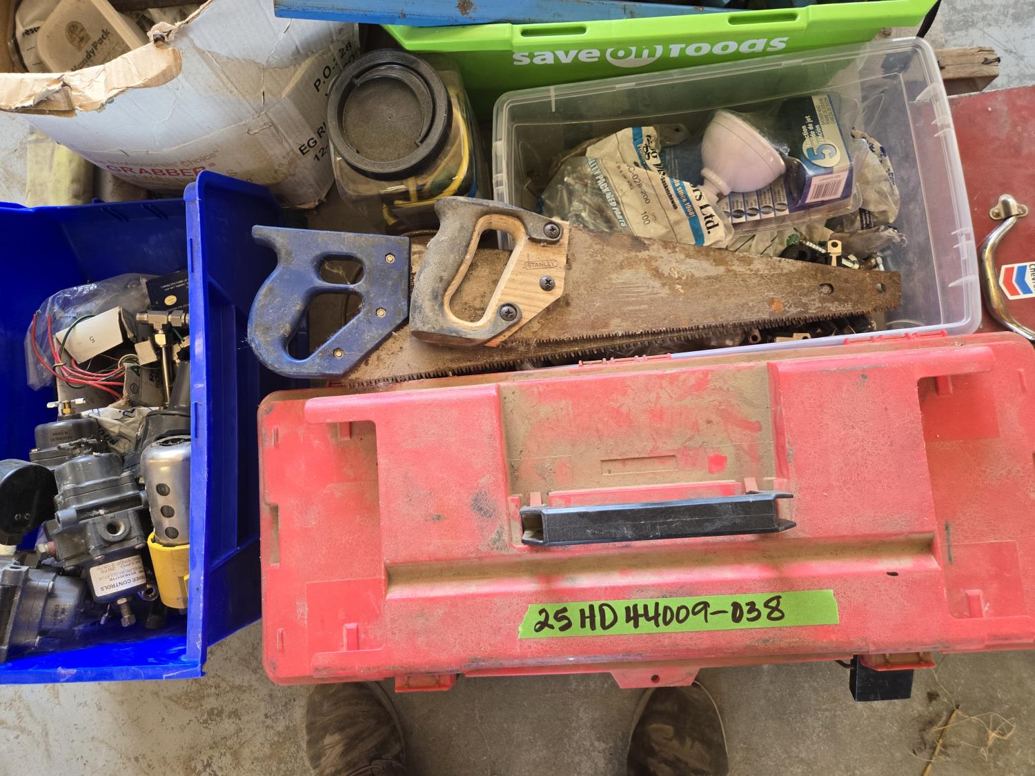 1878 Qty of Misc Hardware, (2) Saws, (2) Empty Tool Boxes