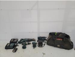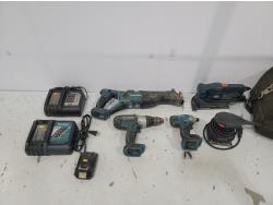 (1) Makita battery, (2) chargers, (2) drills, reciprocating saw, (2) sanders