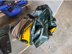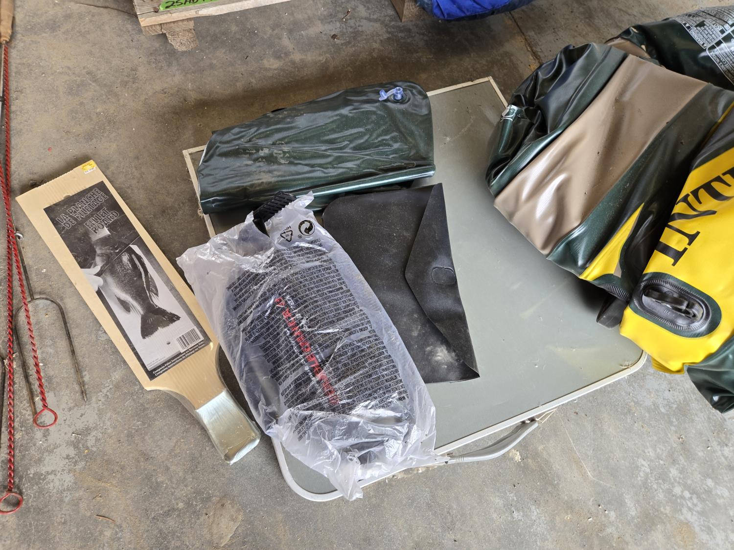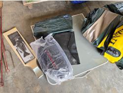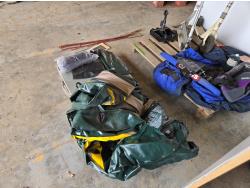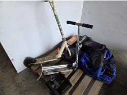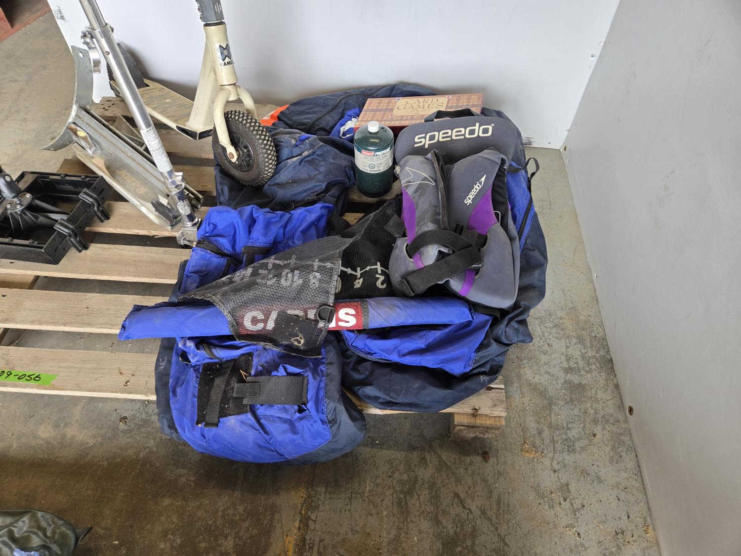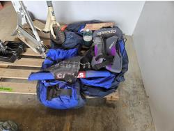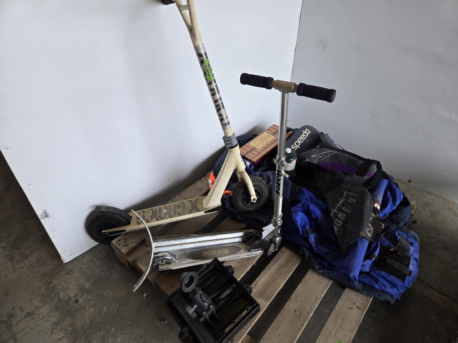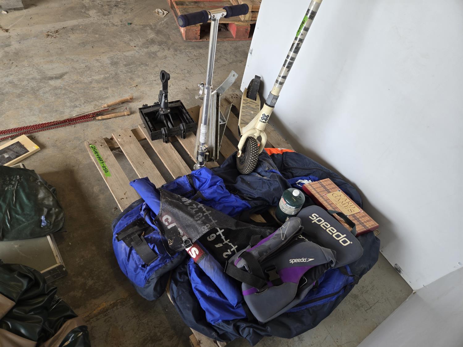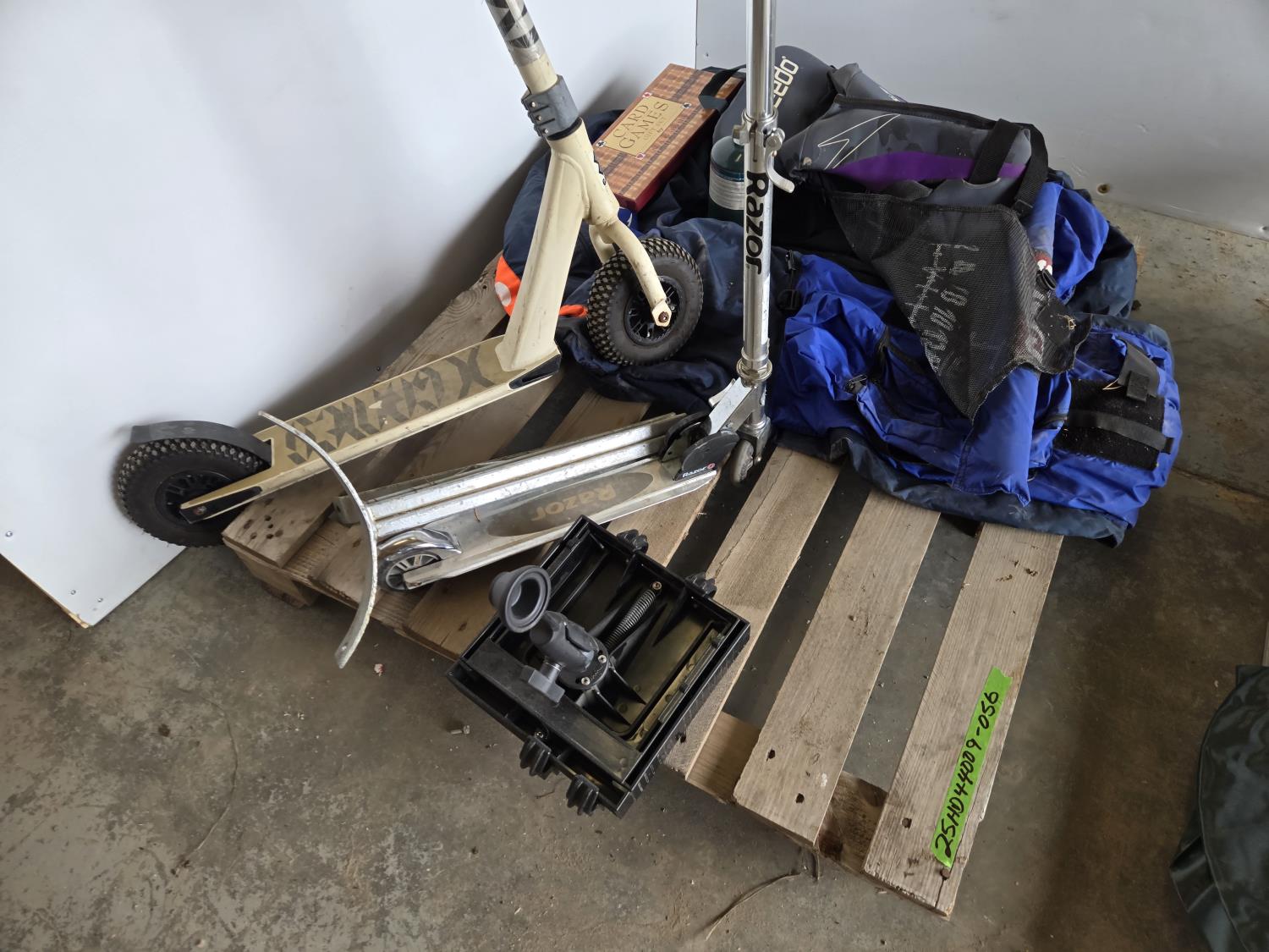dingy with pump, wiener sticks, life jacket, (2) scooters, propane bottle, one person fishing float