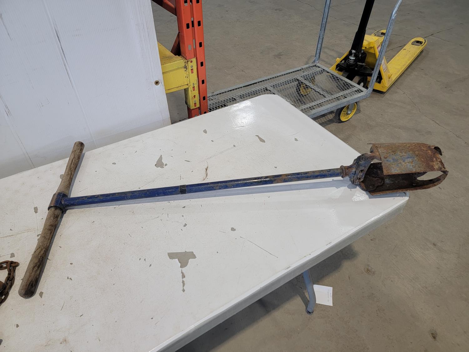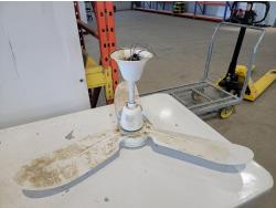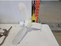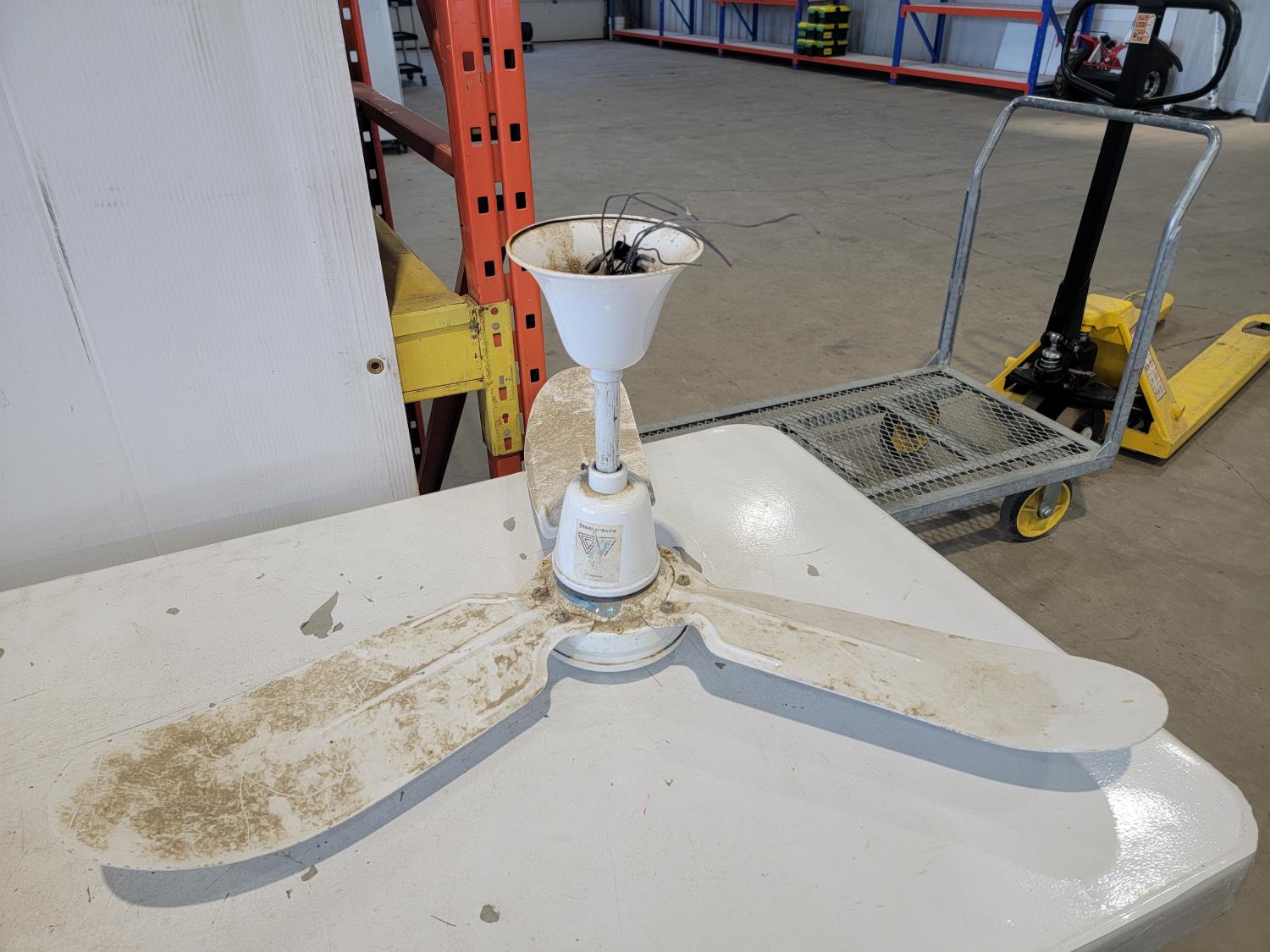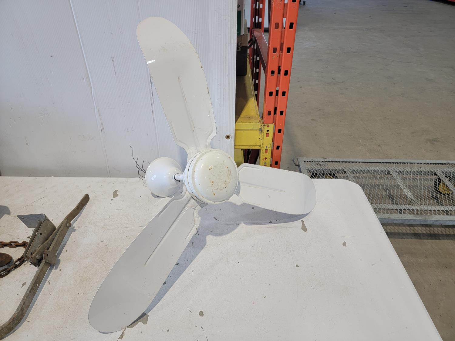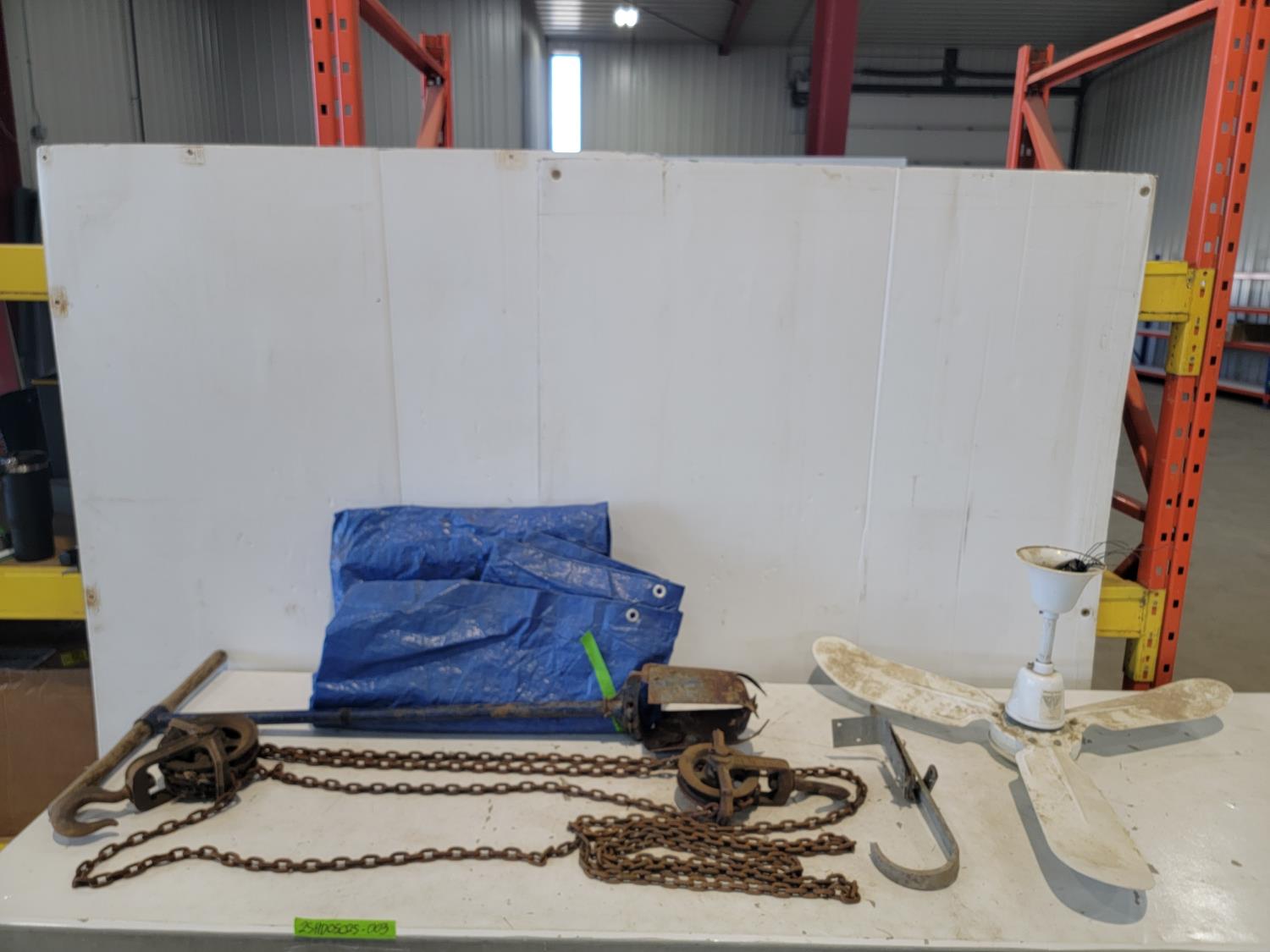 Ceiling fan, antique chain hoist, post hole auger, gate latch, tarp