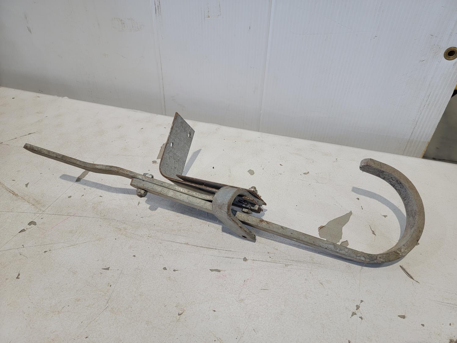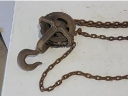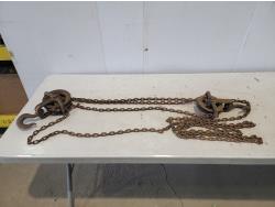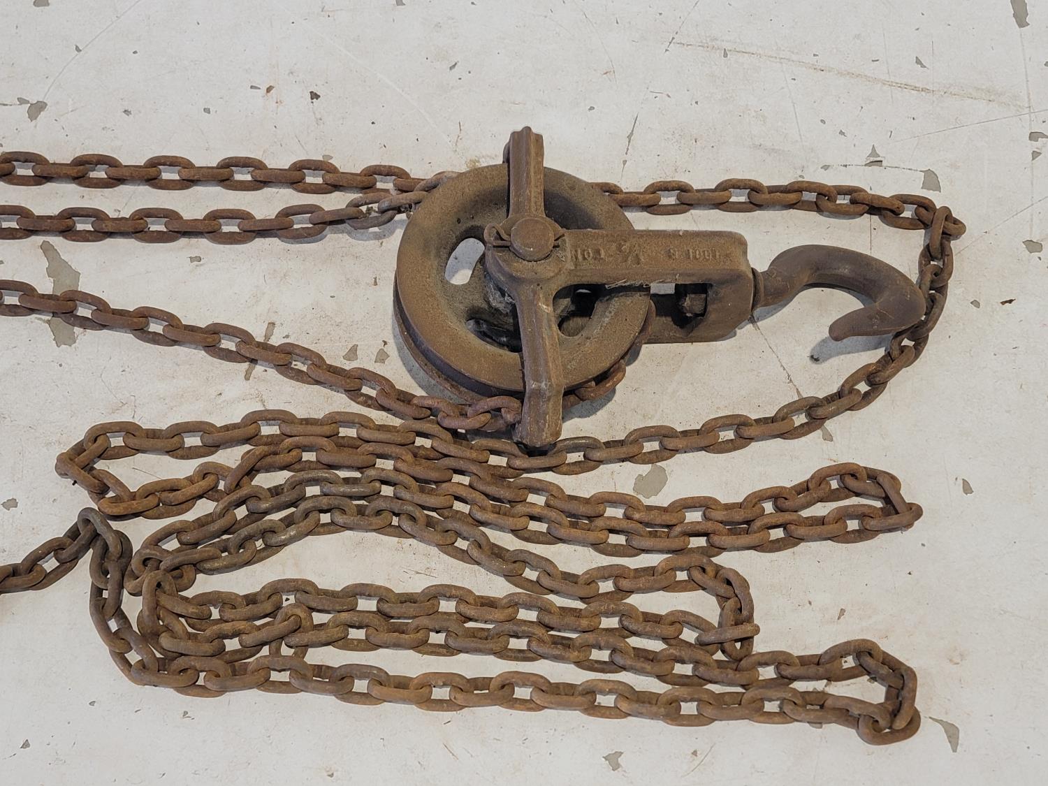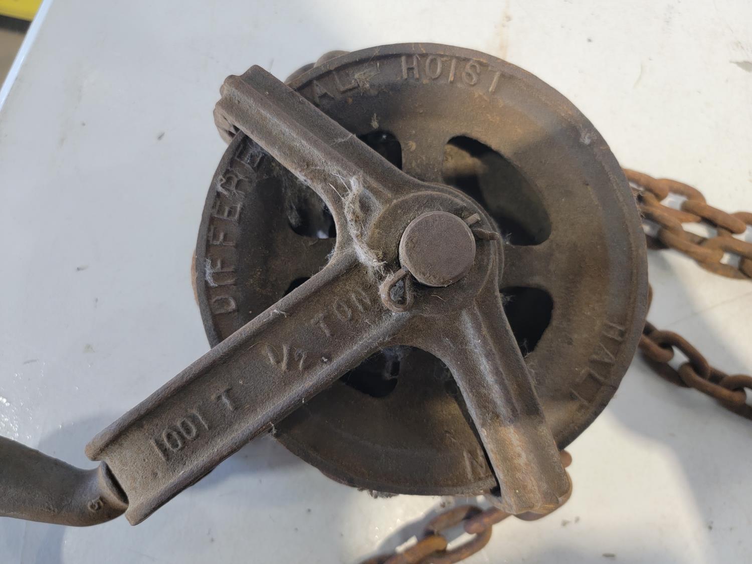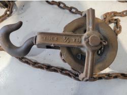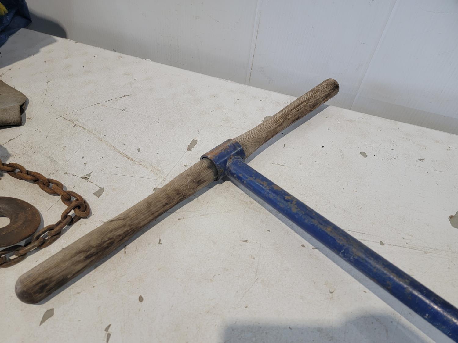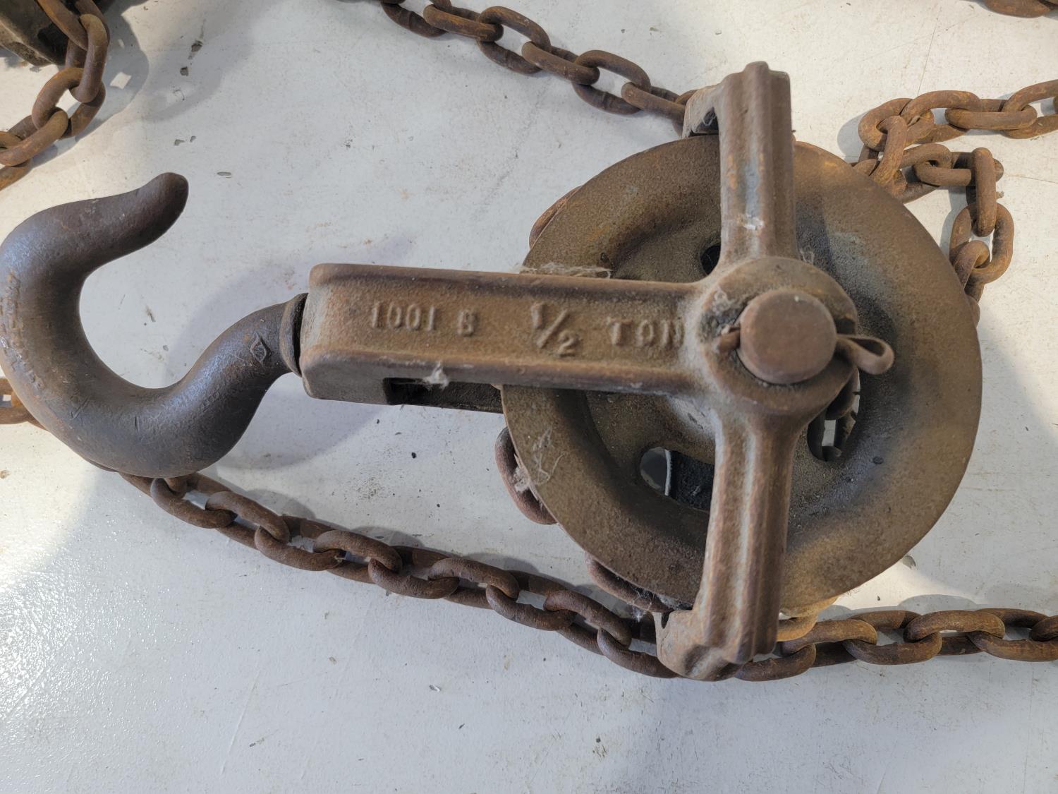 Ceiling fan, antique chain hoist, post hole auger, gate latch, tarp