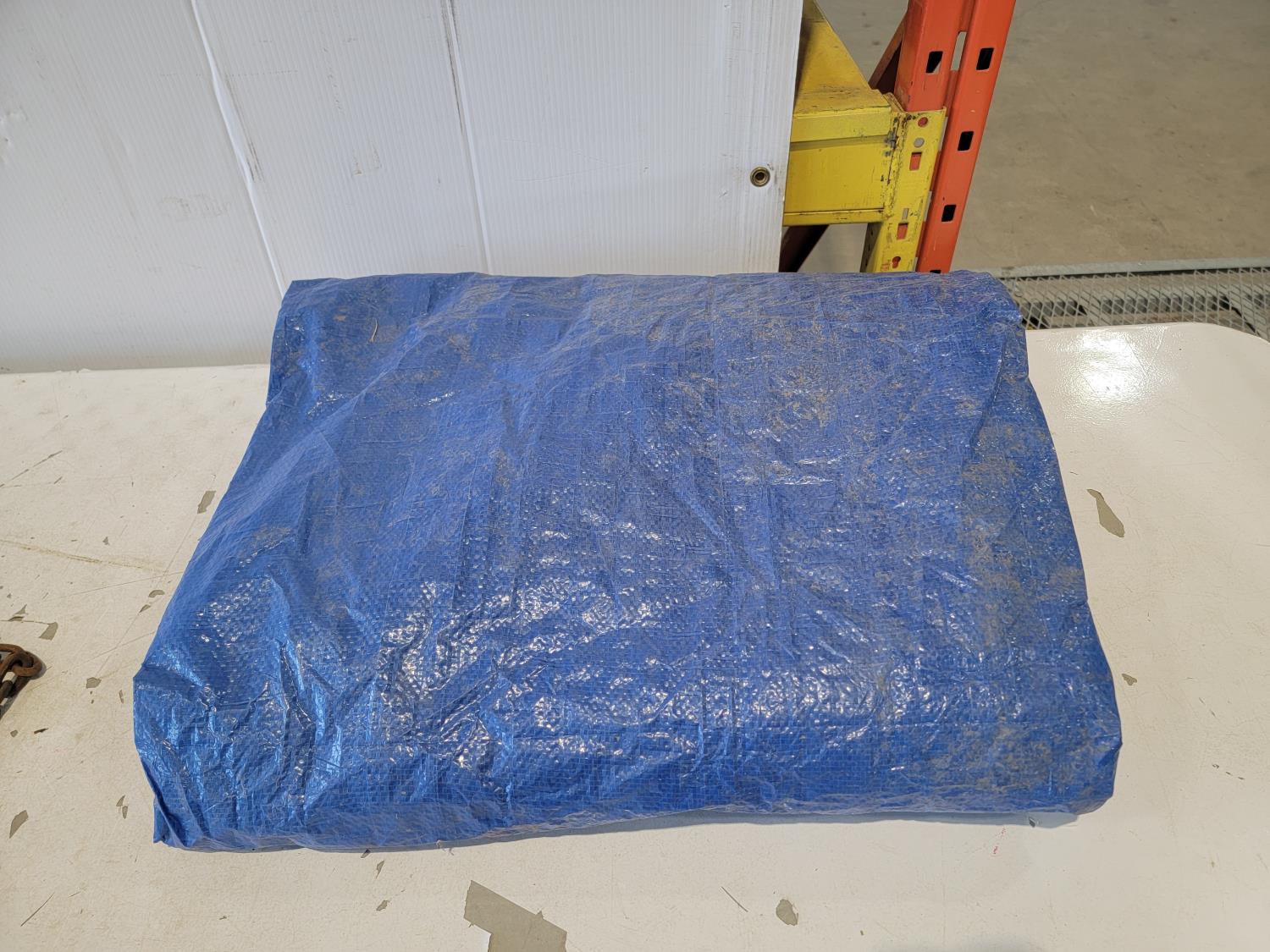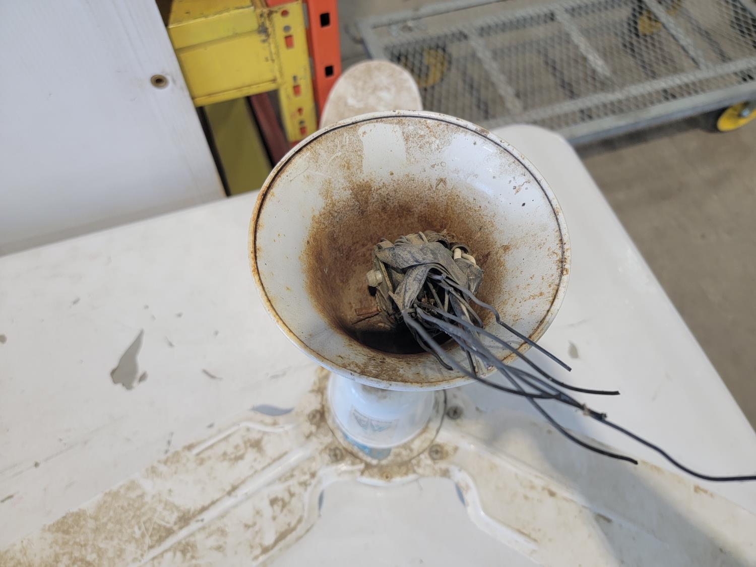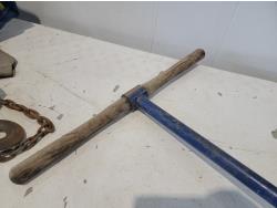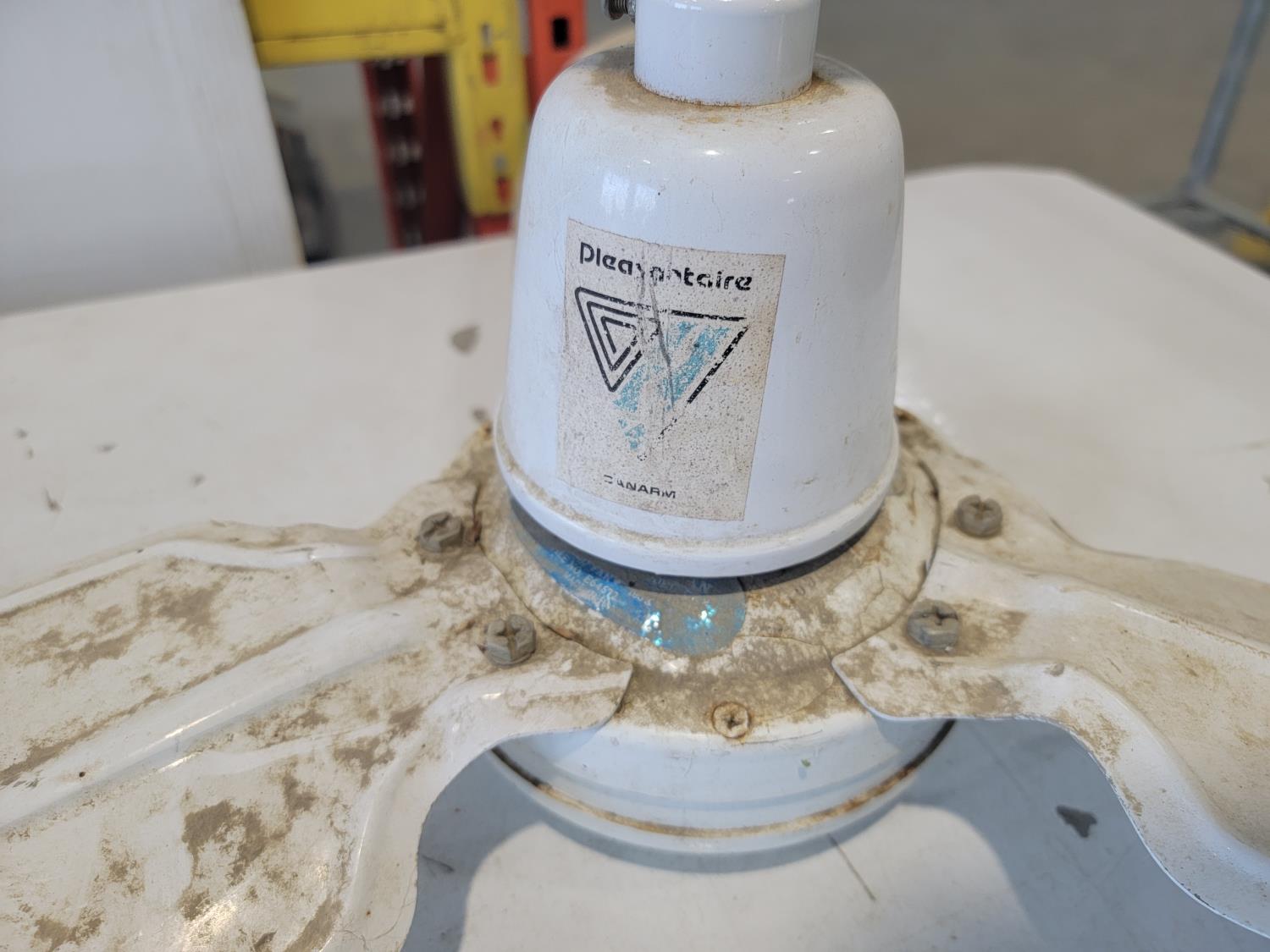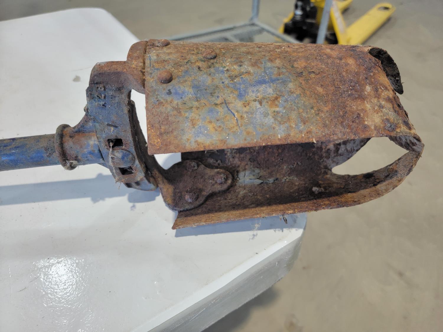 Ceiling fan, antique chain hoist, post hole auger, gate latch, tarp