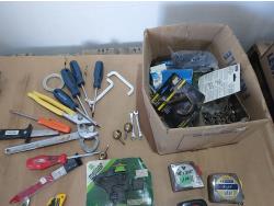 Socket set (missing pieces), (4) tape measures, (2) filter wrenches, hand tools, lawn sprinkler, (2) extension leads, insulation tape