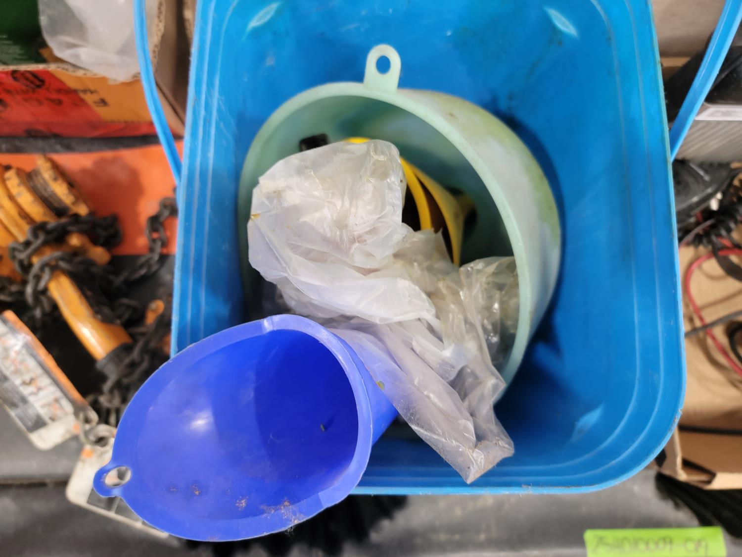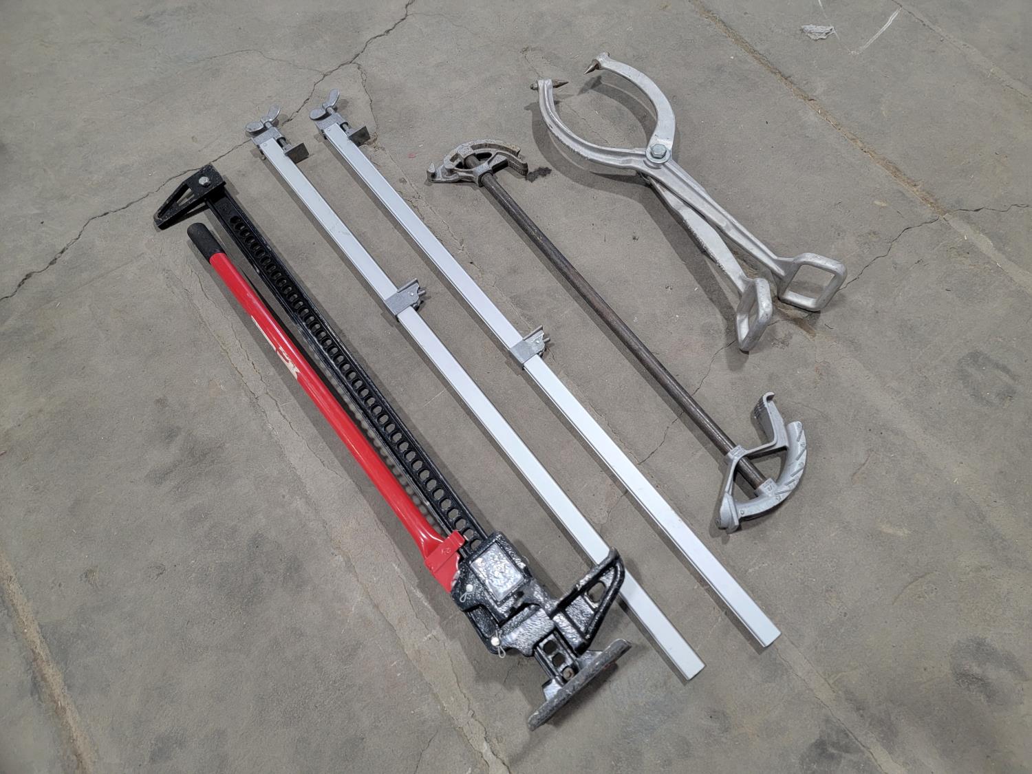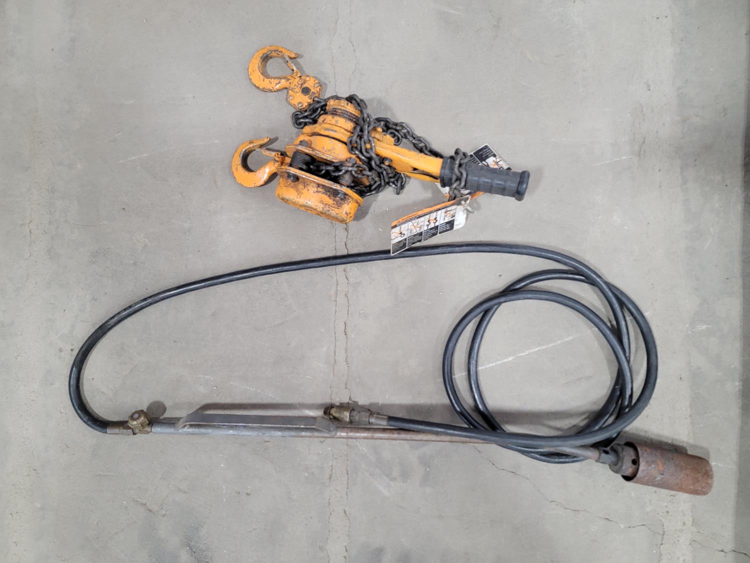 Jack-all, funnels, saw blades, propane torch, chain hoist