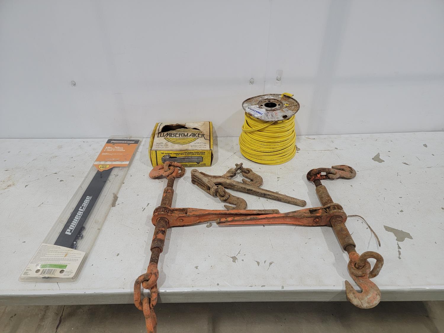 Load binders, 60 m of 12/2 copper wire, Lumber Maker, 18 inch chainsaw bar and chain