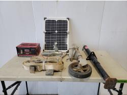 Century 6/12V battery charger, Coleman 25W solar panel, 1500 lb trailer jack, 2000 lb a-frame jack