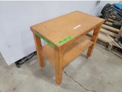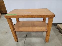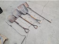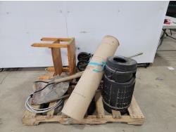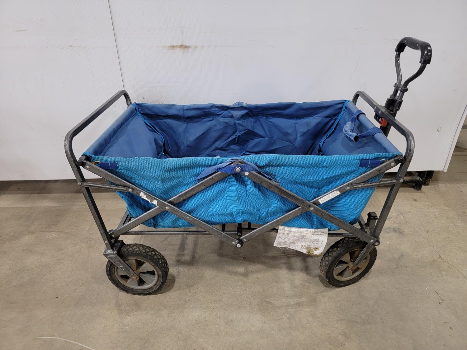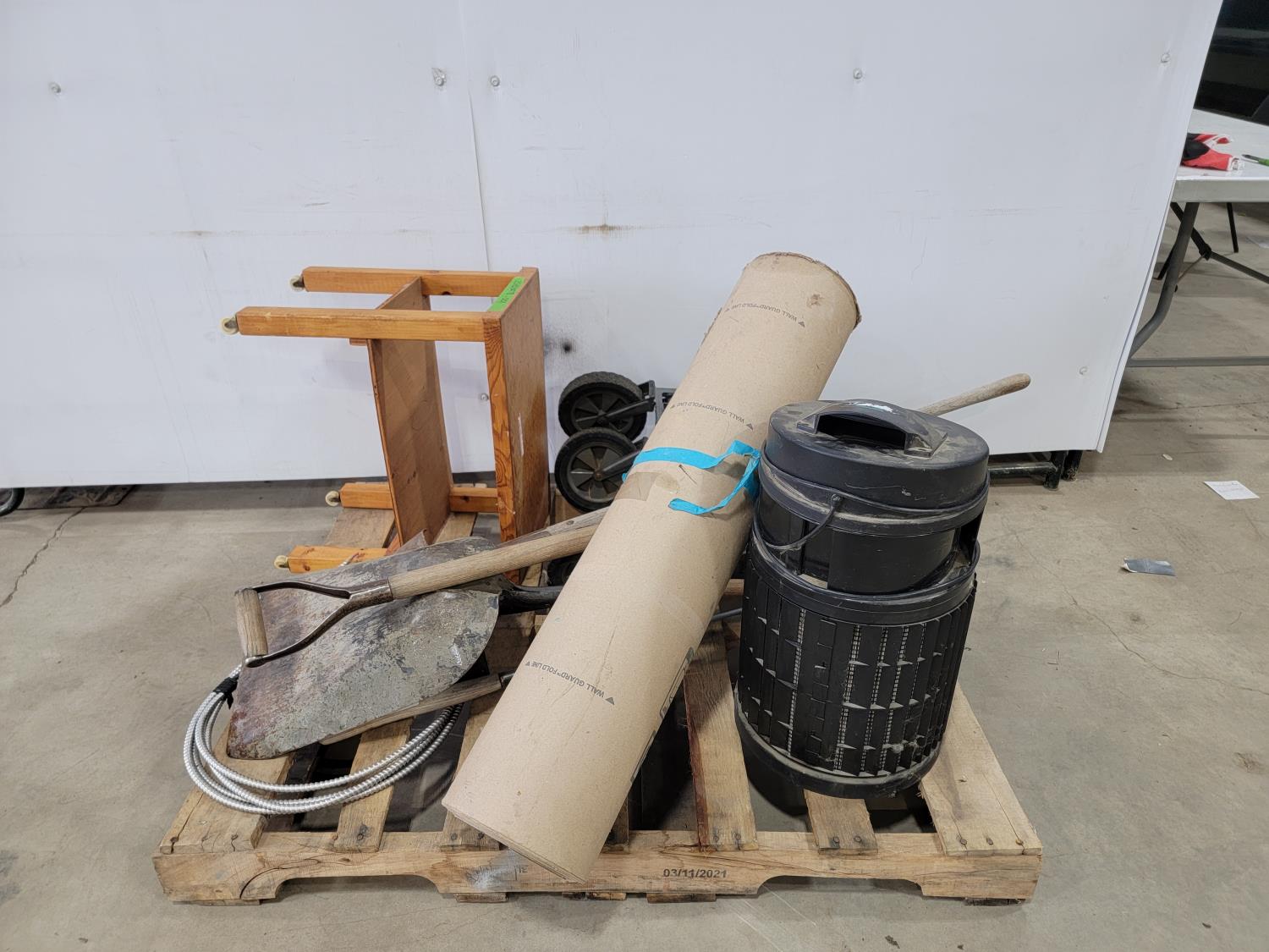 Shovels, underlay, wire, 35 inch w x 18-1/2 inch d x 21 inch h folding wagon, wooden table 21-3/4 inch w x 12-1/4 inch d 20 inch h, room air cleaner