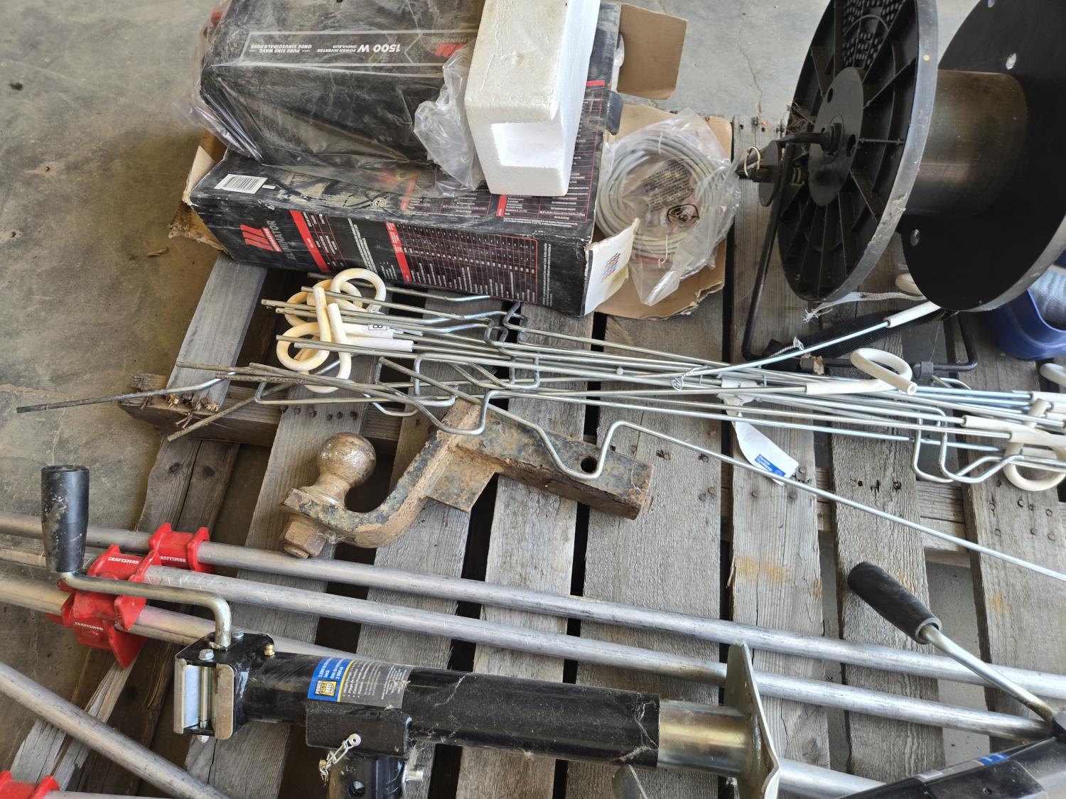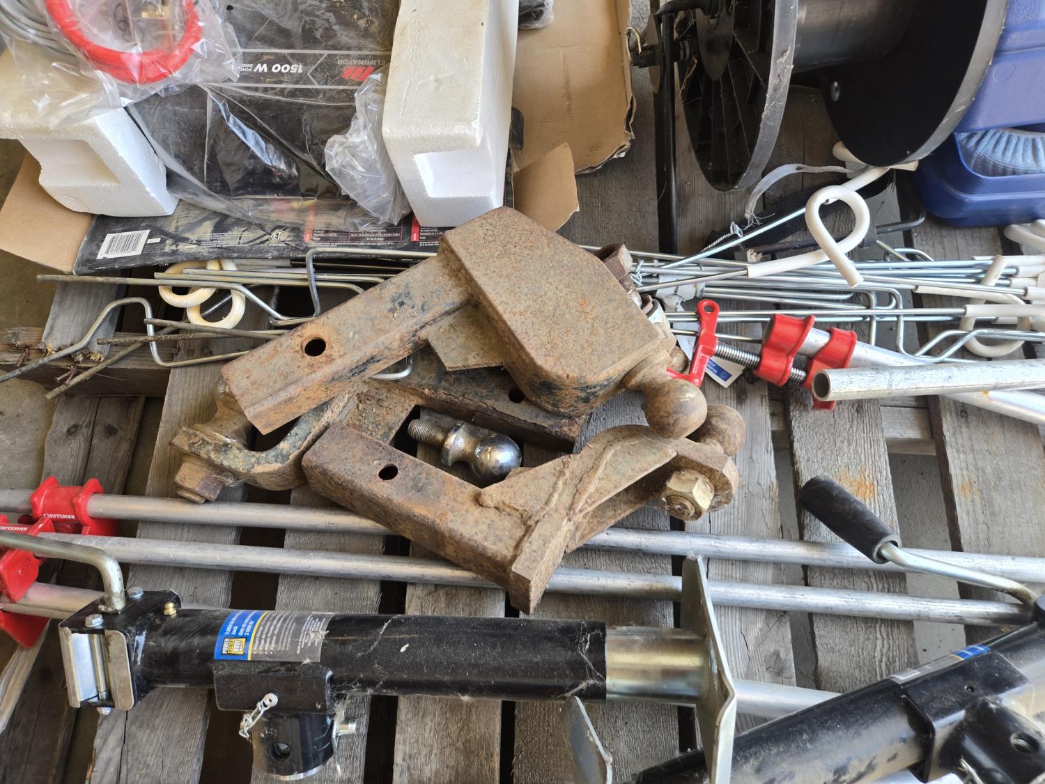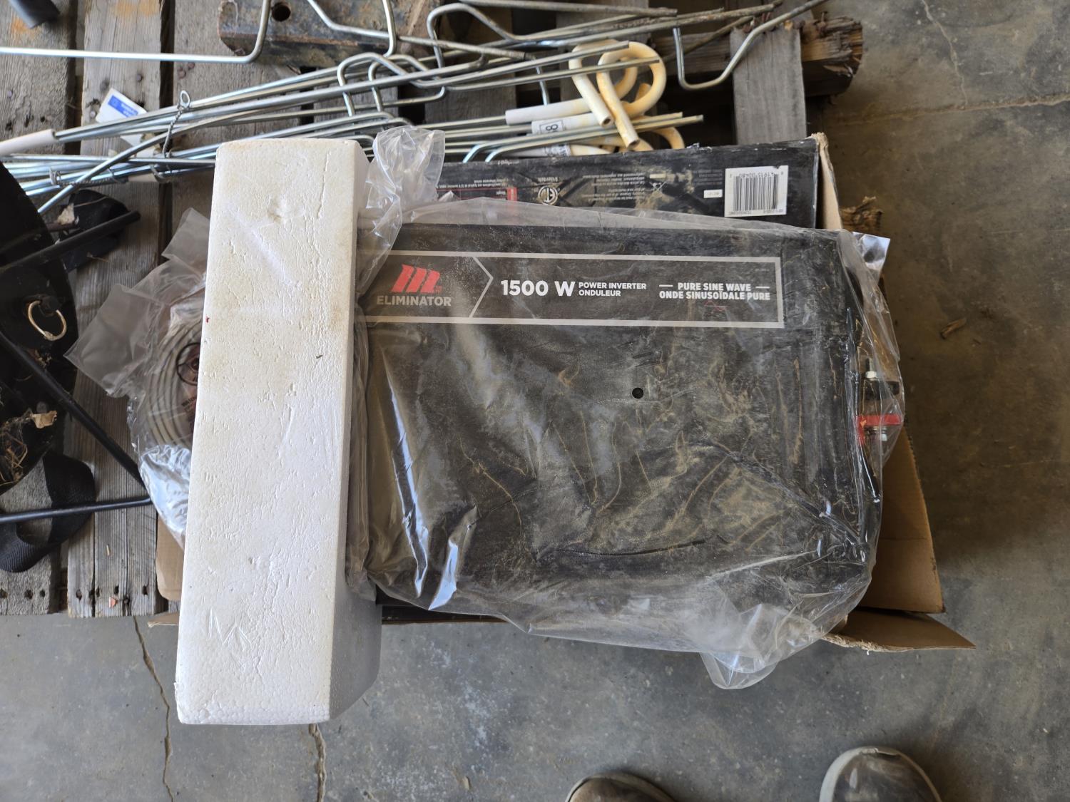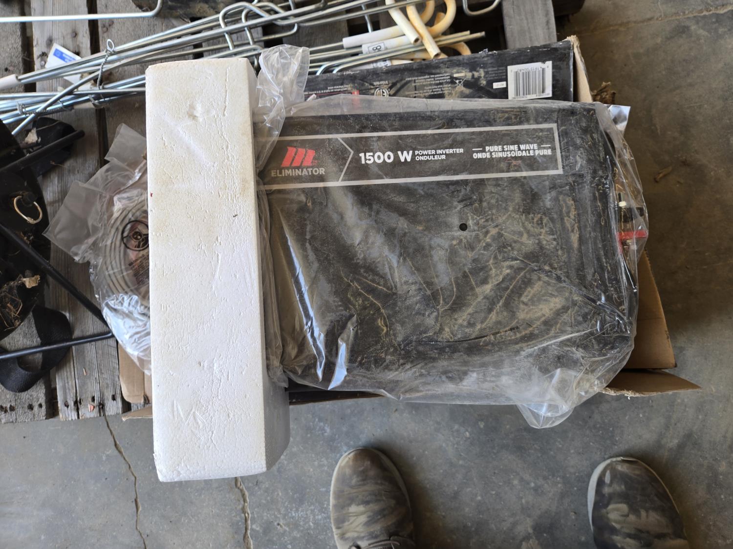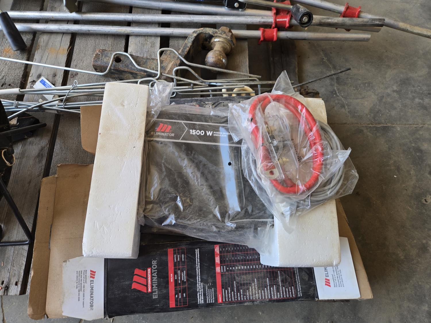 (6) Pipe Clamps, Qty of step in electric fence posts, buffer, (2) implement jacks, (3) 2 inch receiver hitches, unused 1500 watt invertor, miscellaneous