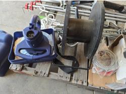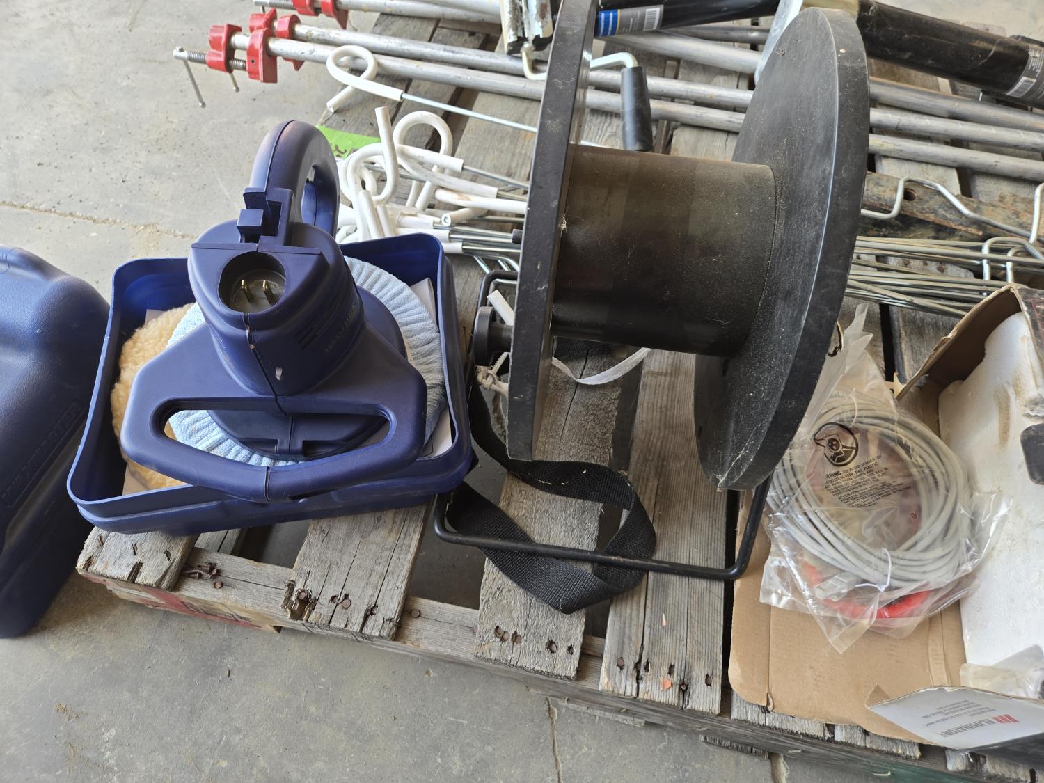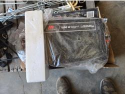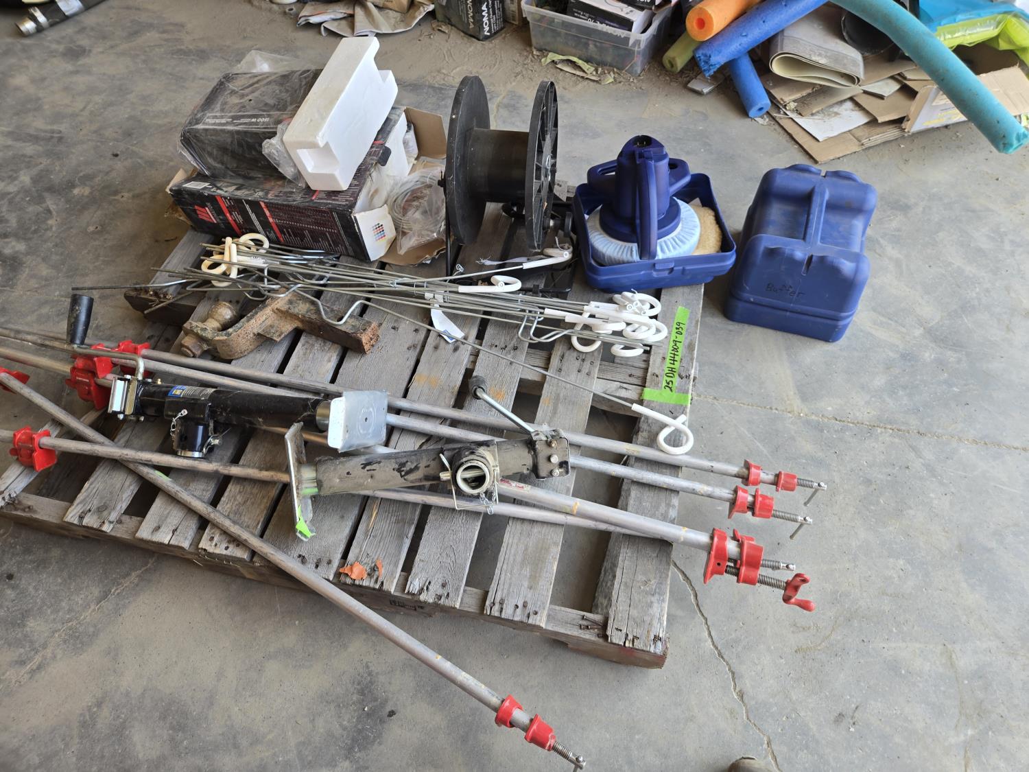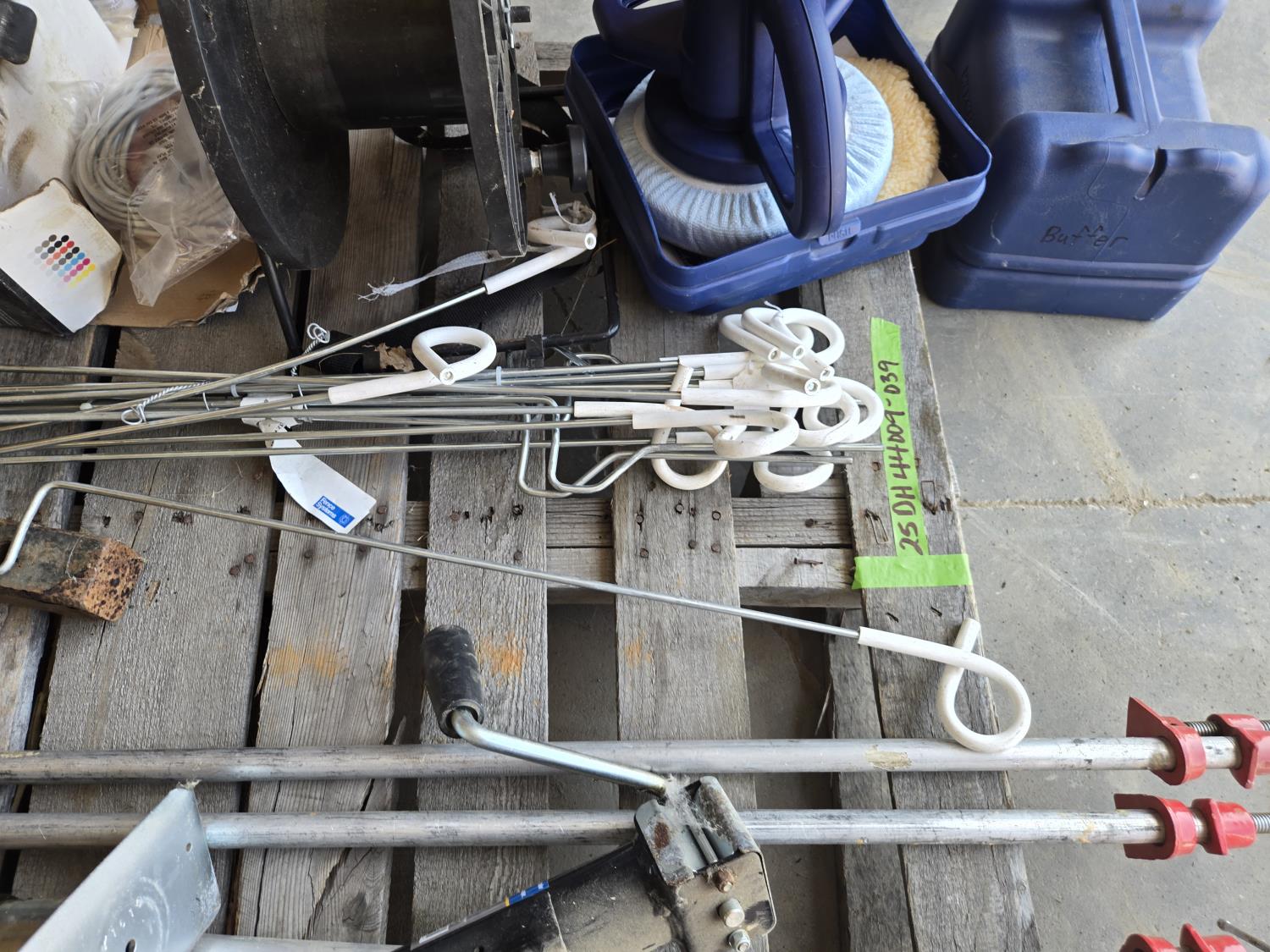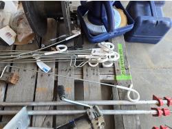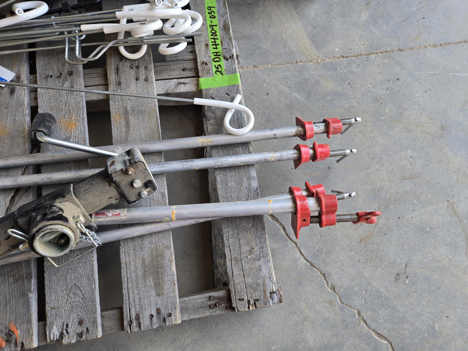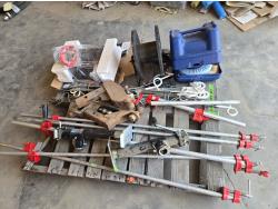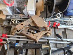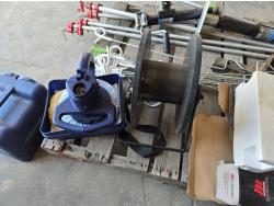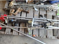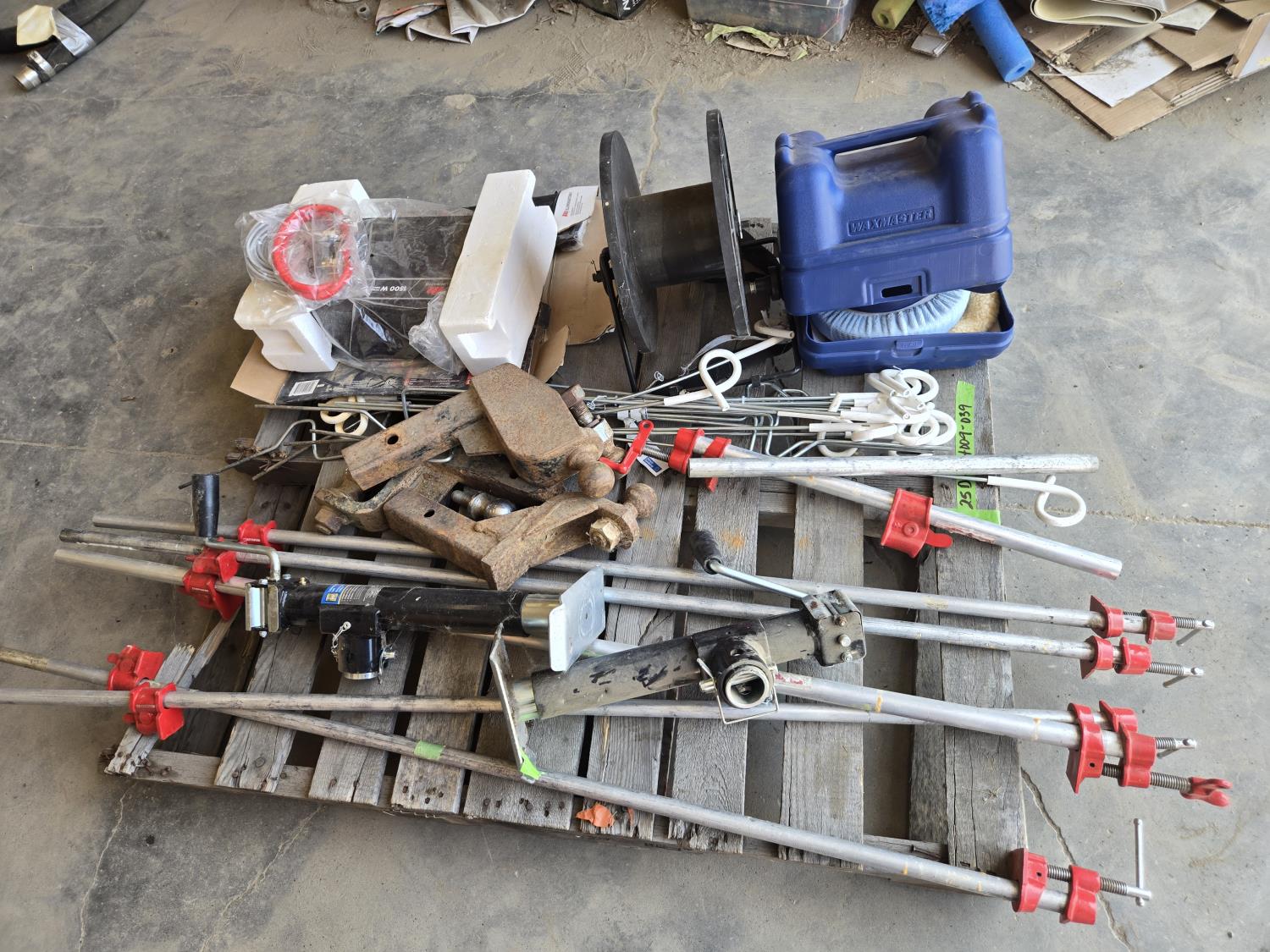 (6) Pipe Clamps, Qty of step in electric fence posts, buffer, (2) implement jacks, (3) 2 inch receiver hitches, unused 1500 watt invertor, miscellaneous