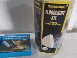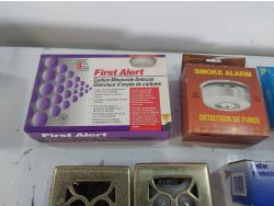 (2) brass floor register covers, (2) smoke alarms, carbon monoxide detector, Bostick glue sticks