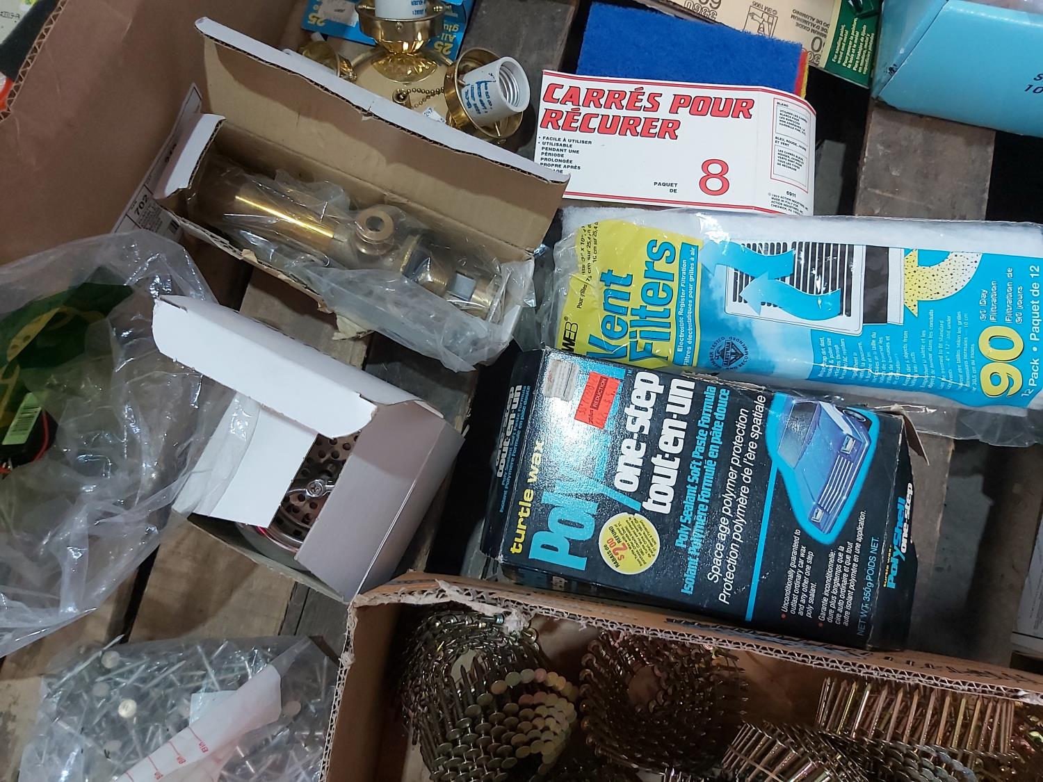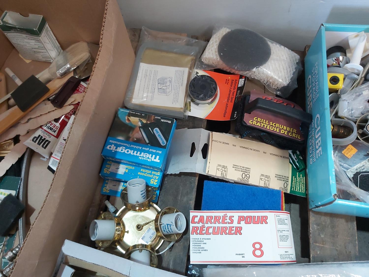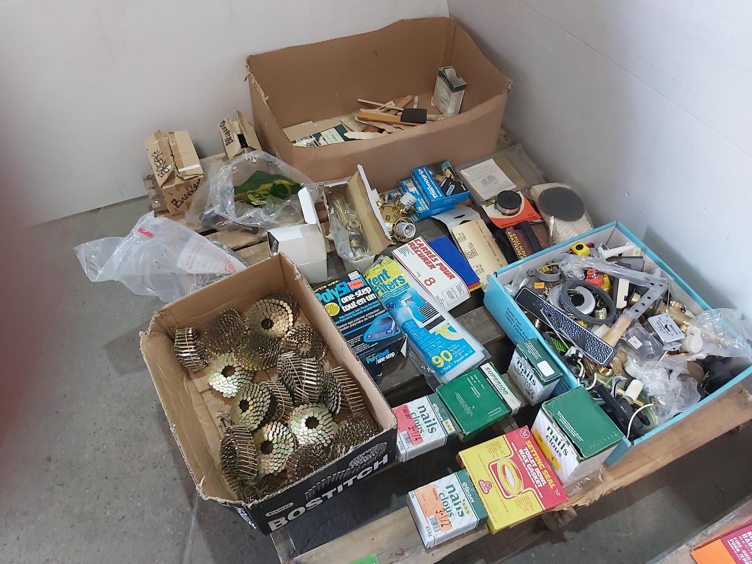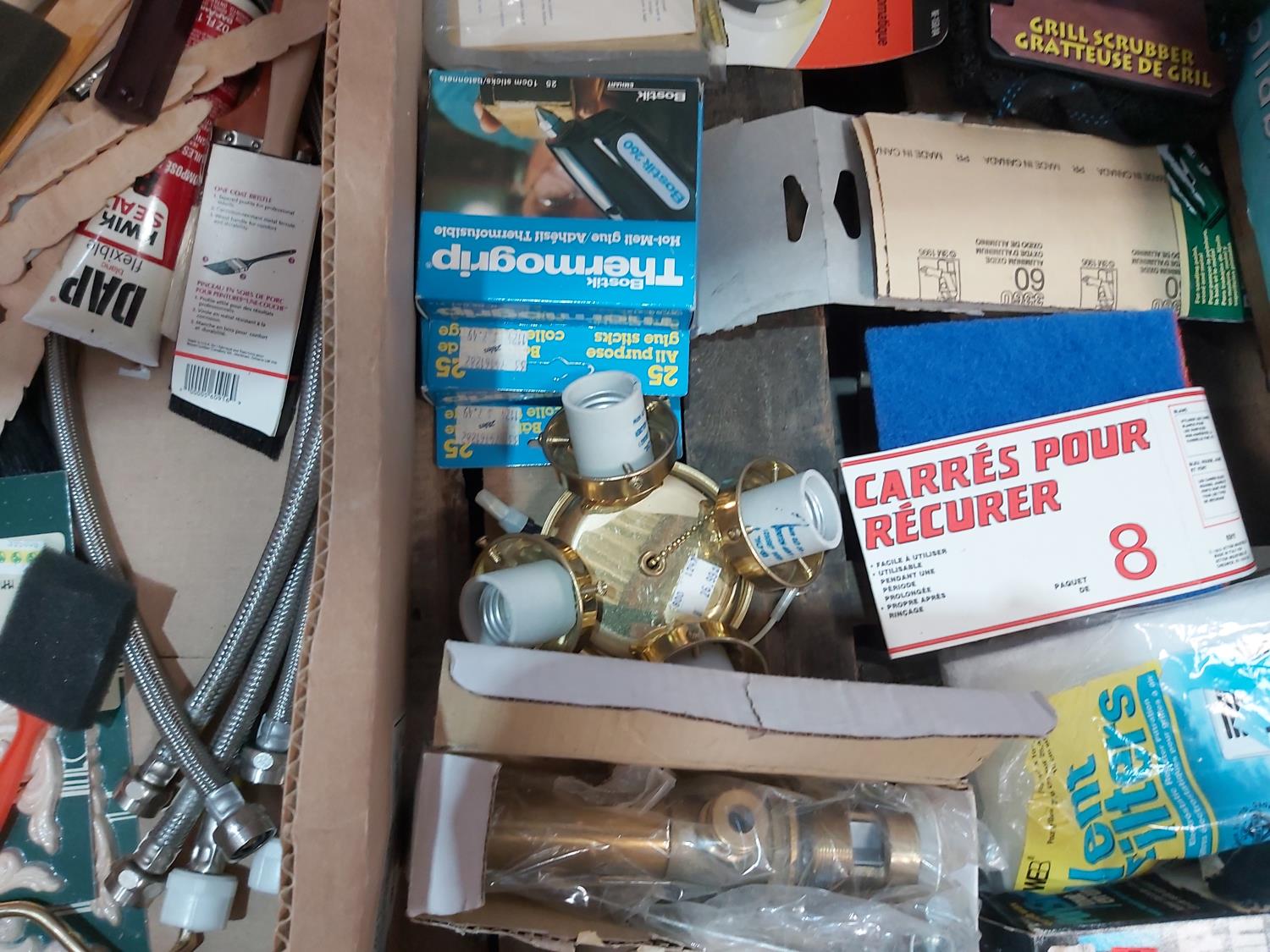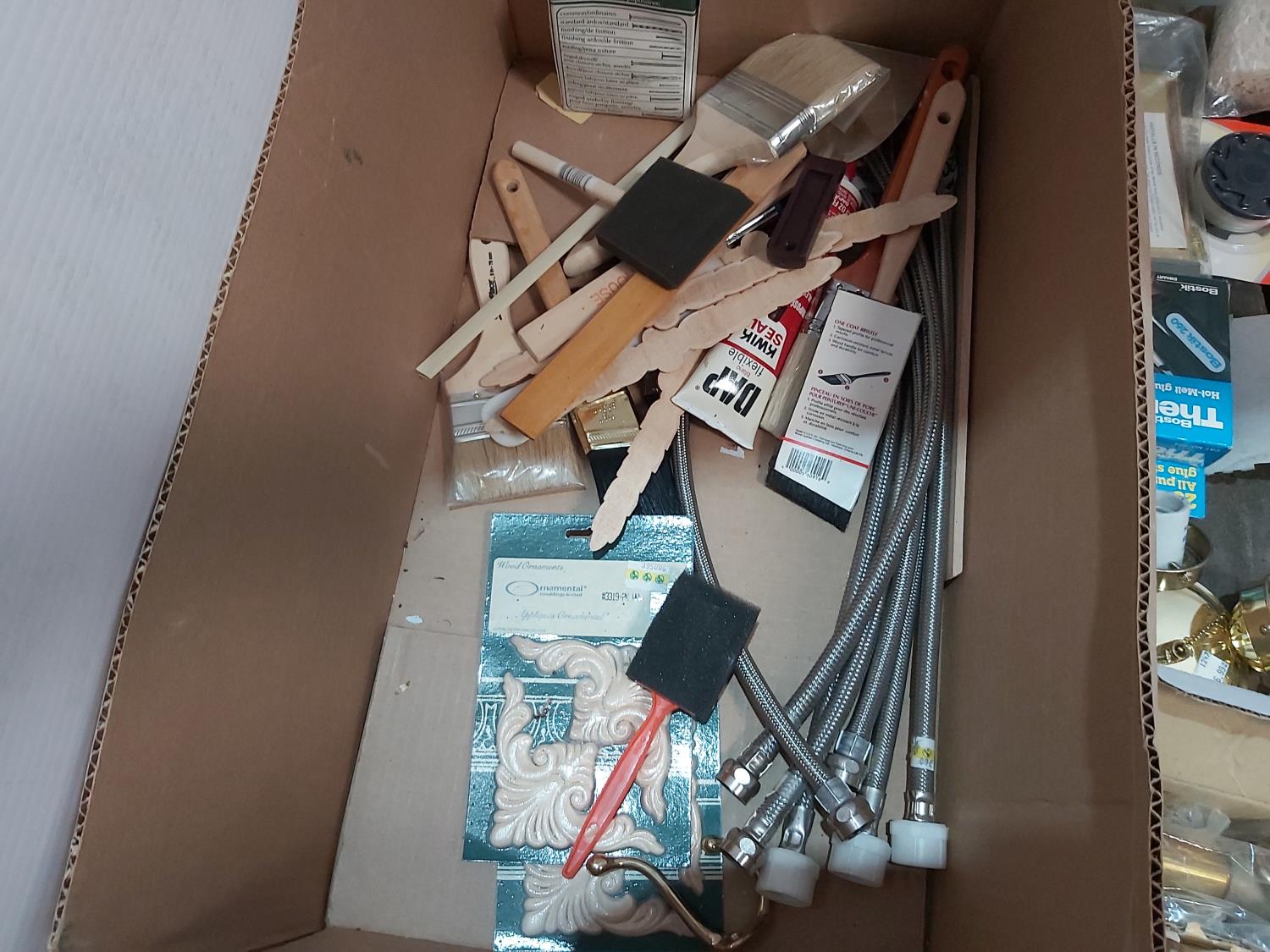 Nails, electrical breakers switches, paint brushes, plug hole basket, light fittings, miscellaneous hardware