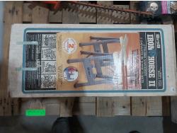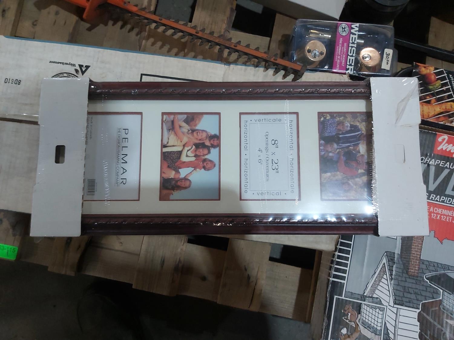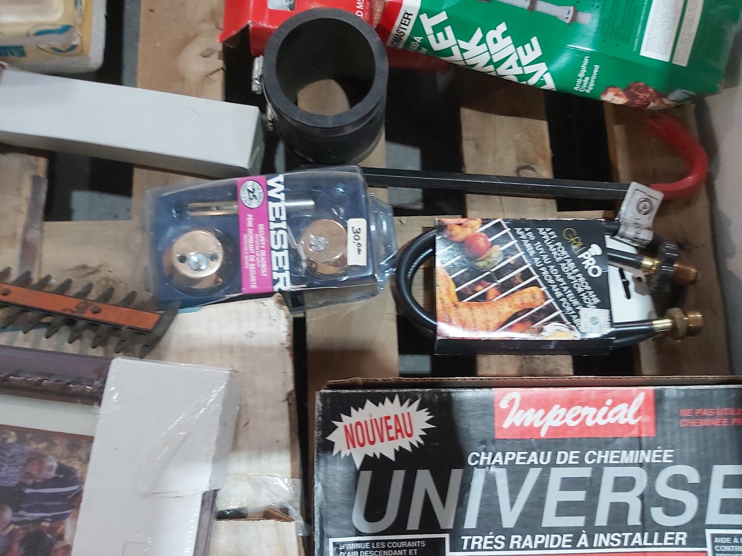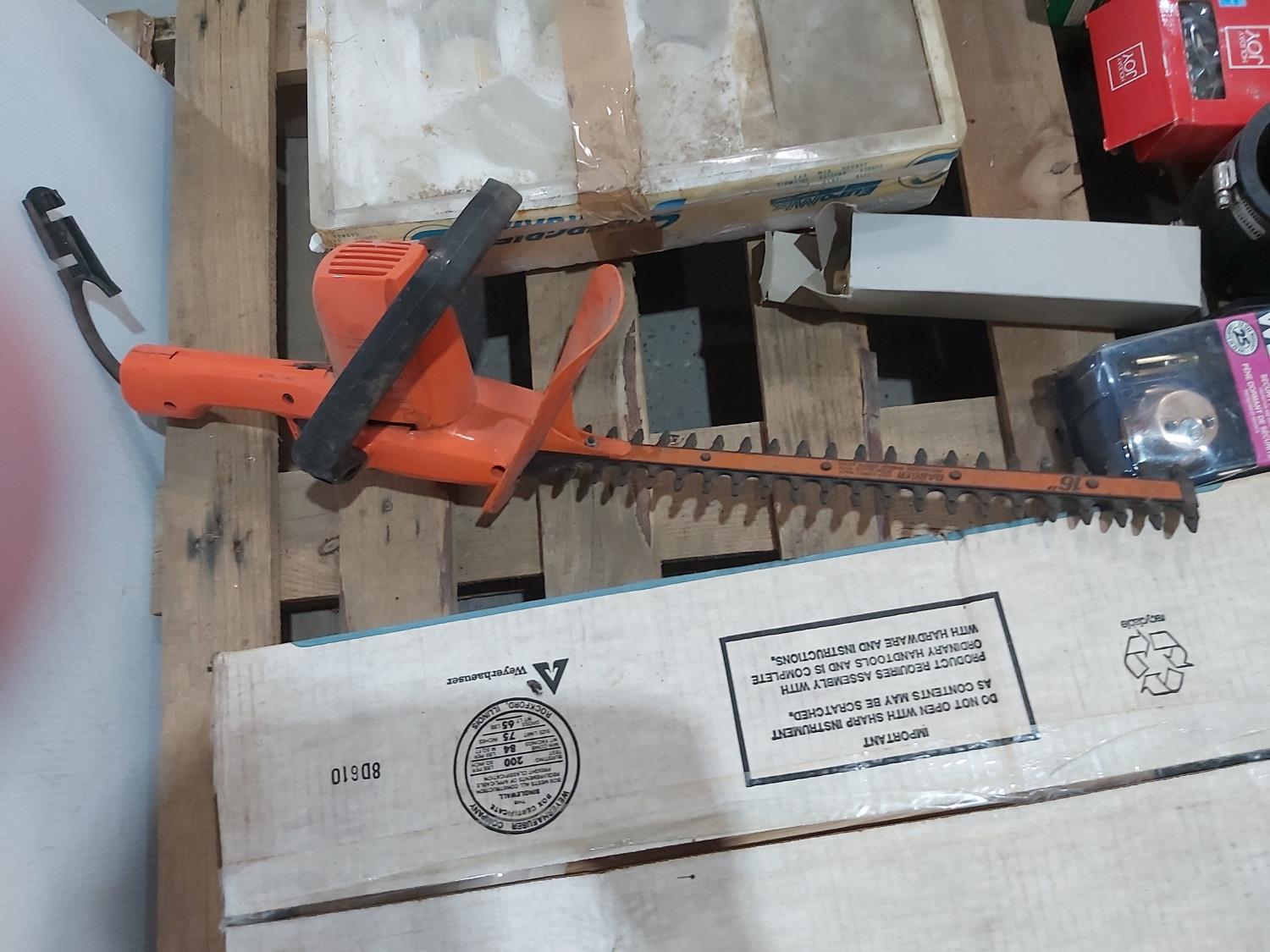 (2) folding saw horses, electric hedge trimmer, 8 inch x 23 inch picture frame, universal chimney cap, (2) toilet repair valves, kitchen tap kit