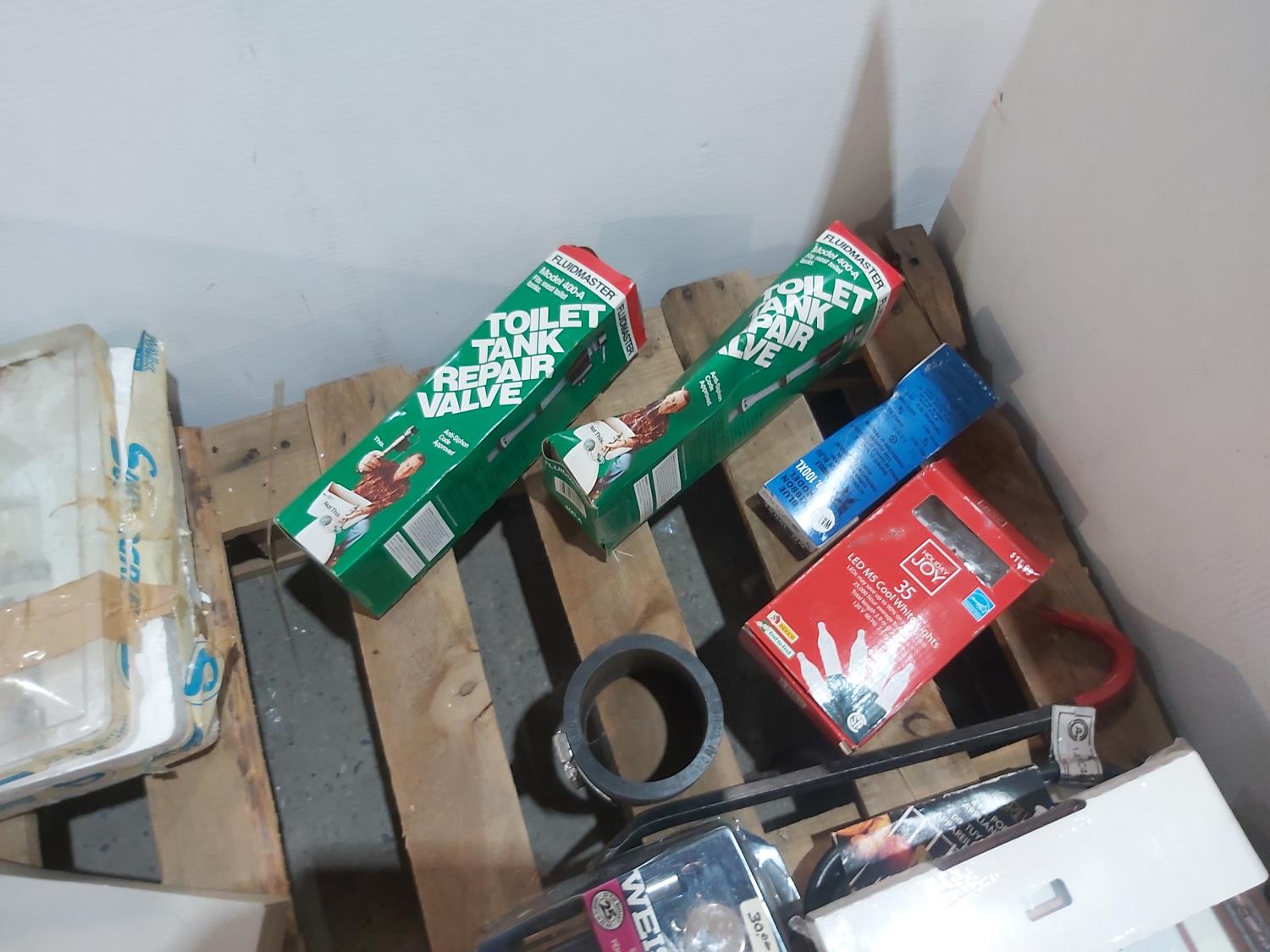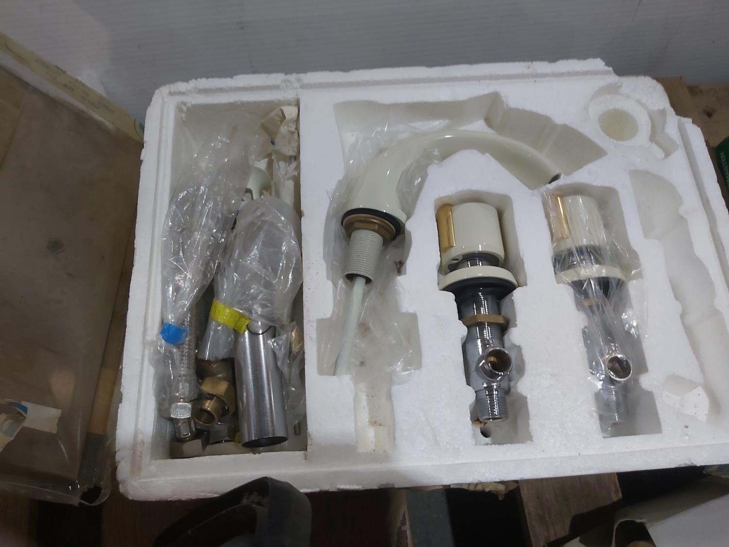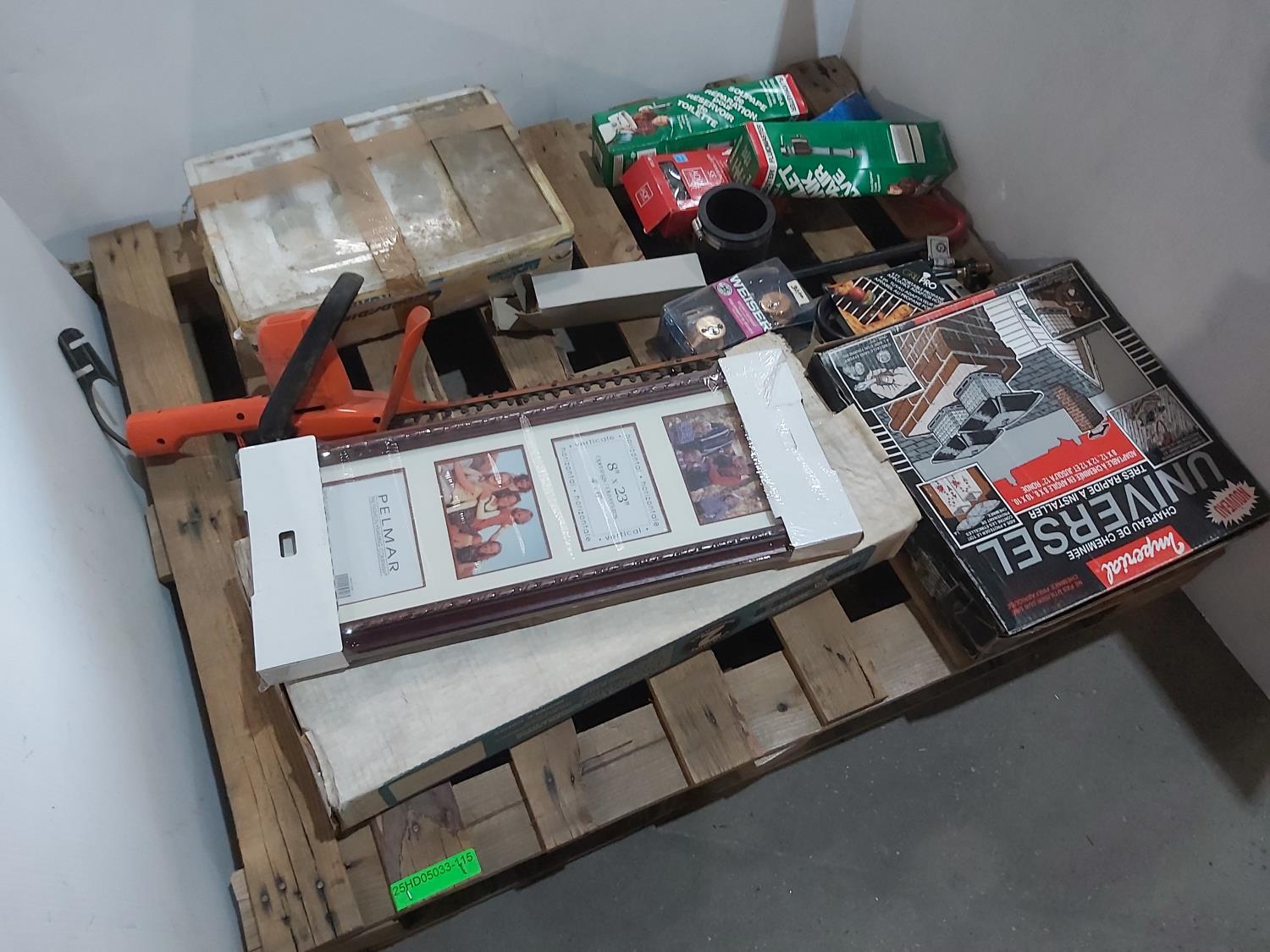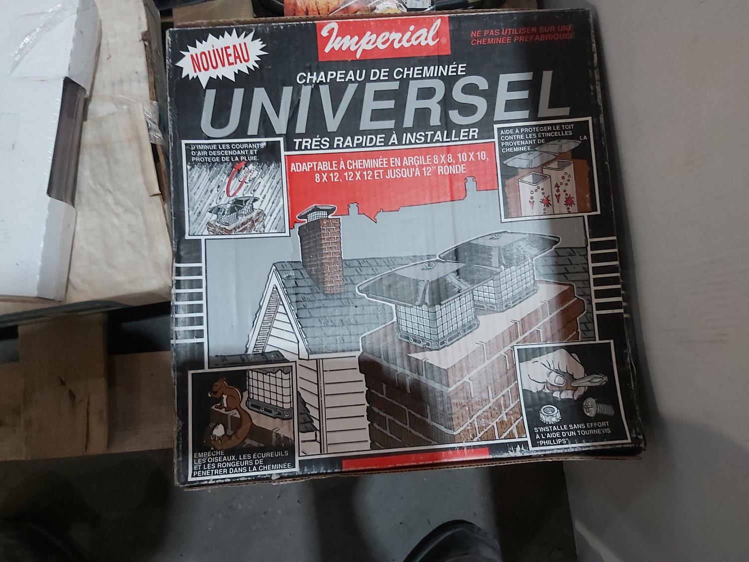 (2) folding saw horses, electric hedge trimmer, 8 inch x 23 inch picture frame, universal chimney cap, (2) toilet repair valves, kitchen tap kit