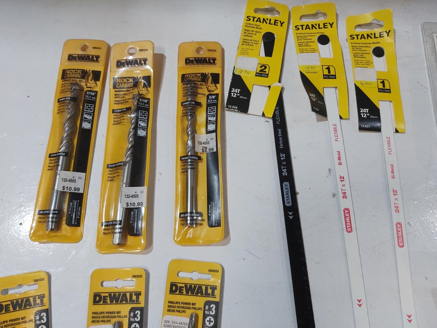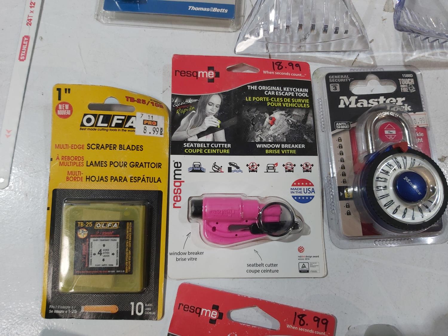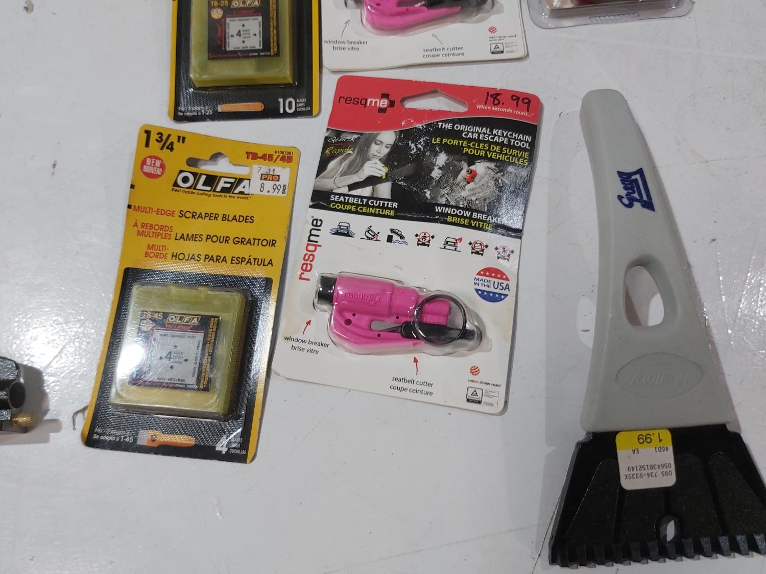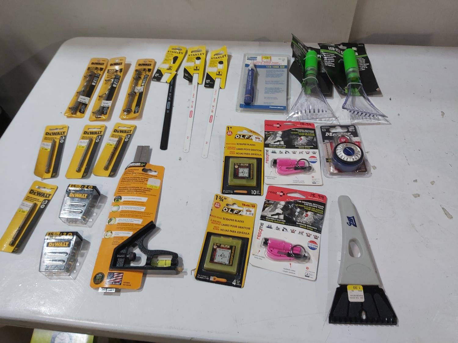 Drill bits, screwdriver bits, padlock, ice scrapers/scraper blades, voltage sensor