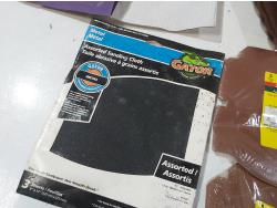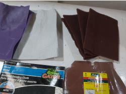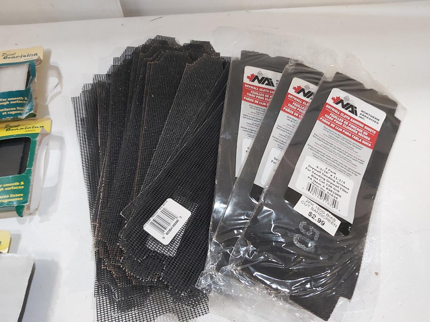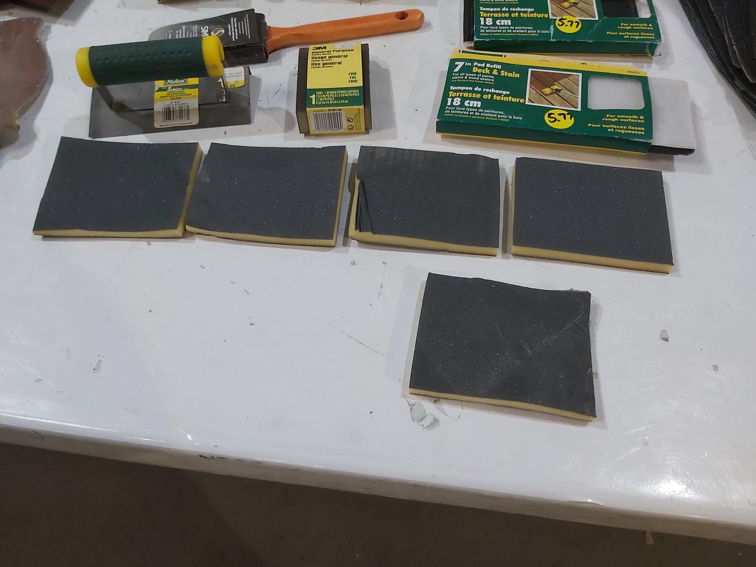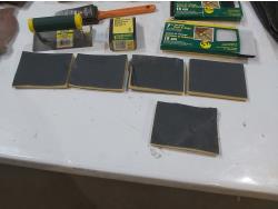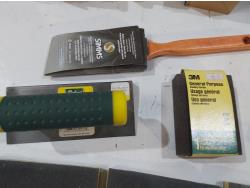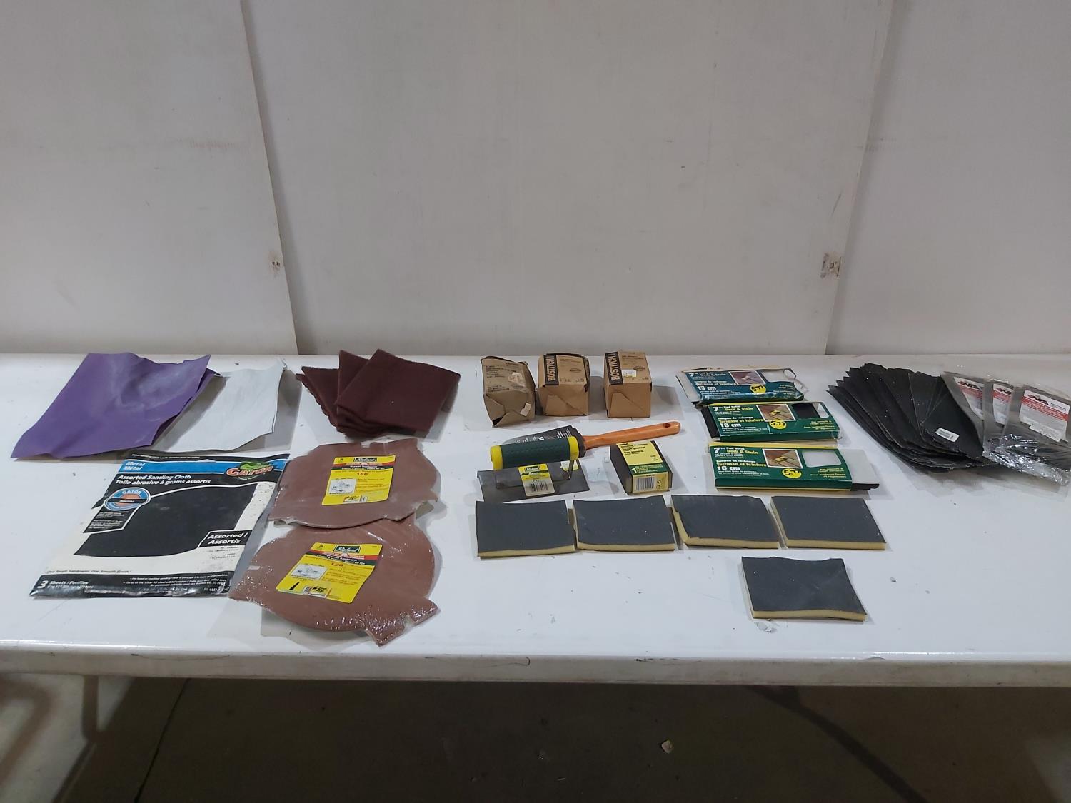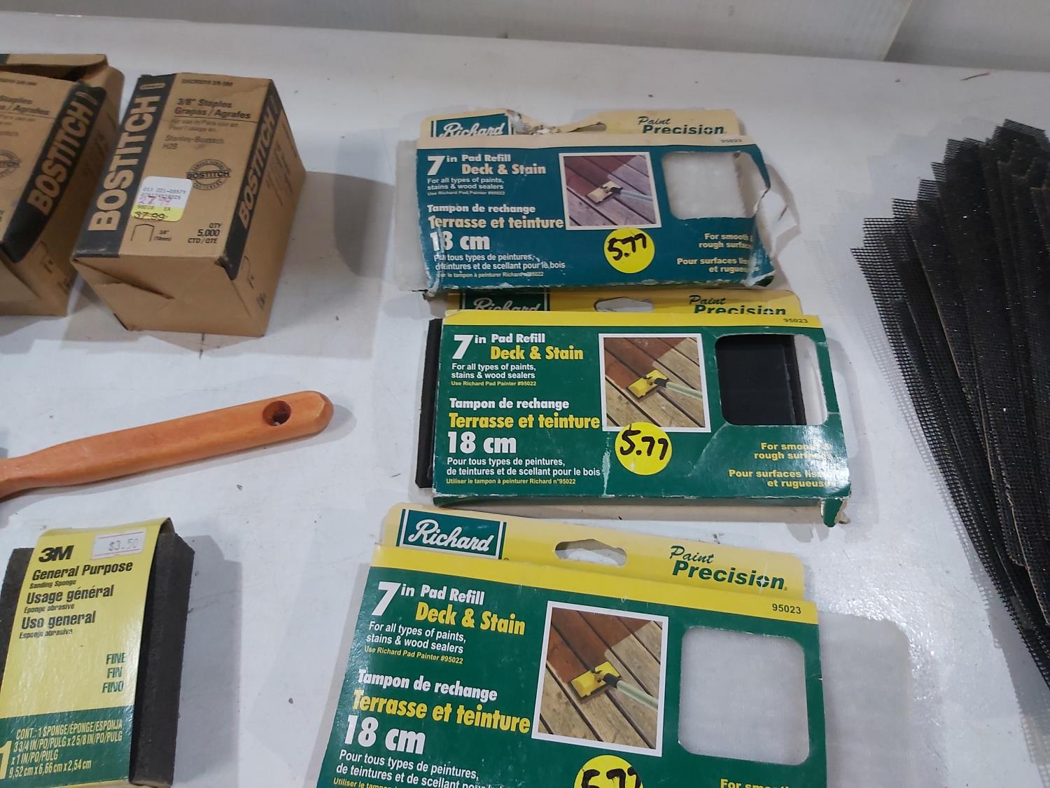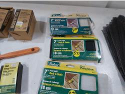 Assortment of sand paper and polishing pads, (3) 7 inch pad refills, cement edger, drywall sanding sheets, 2 inch paint brush, Bostitch 3/8 inch staples