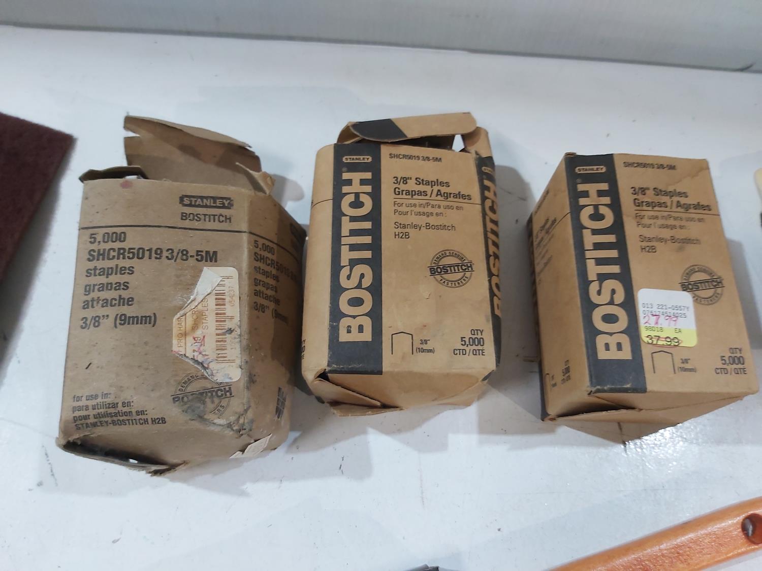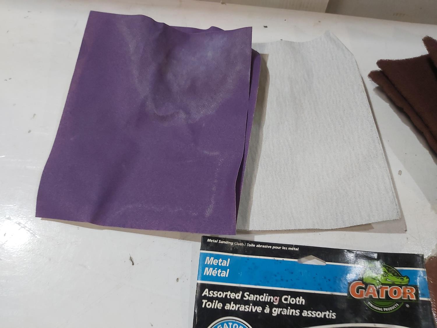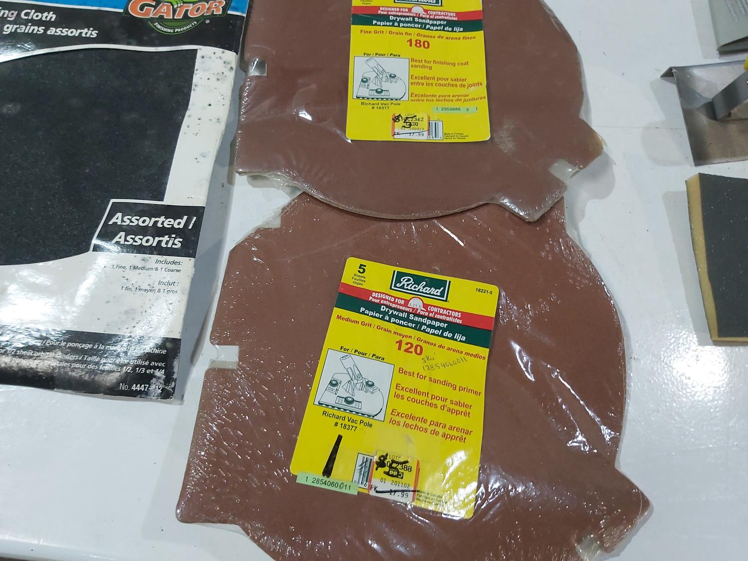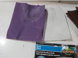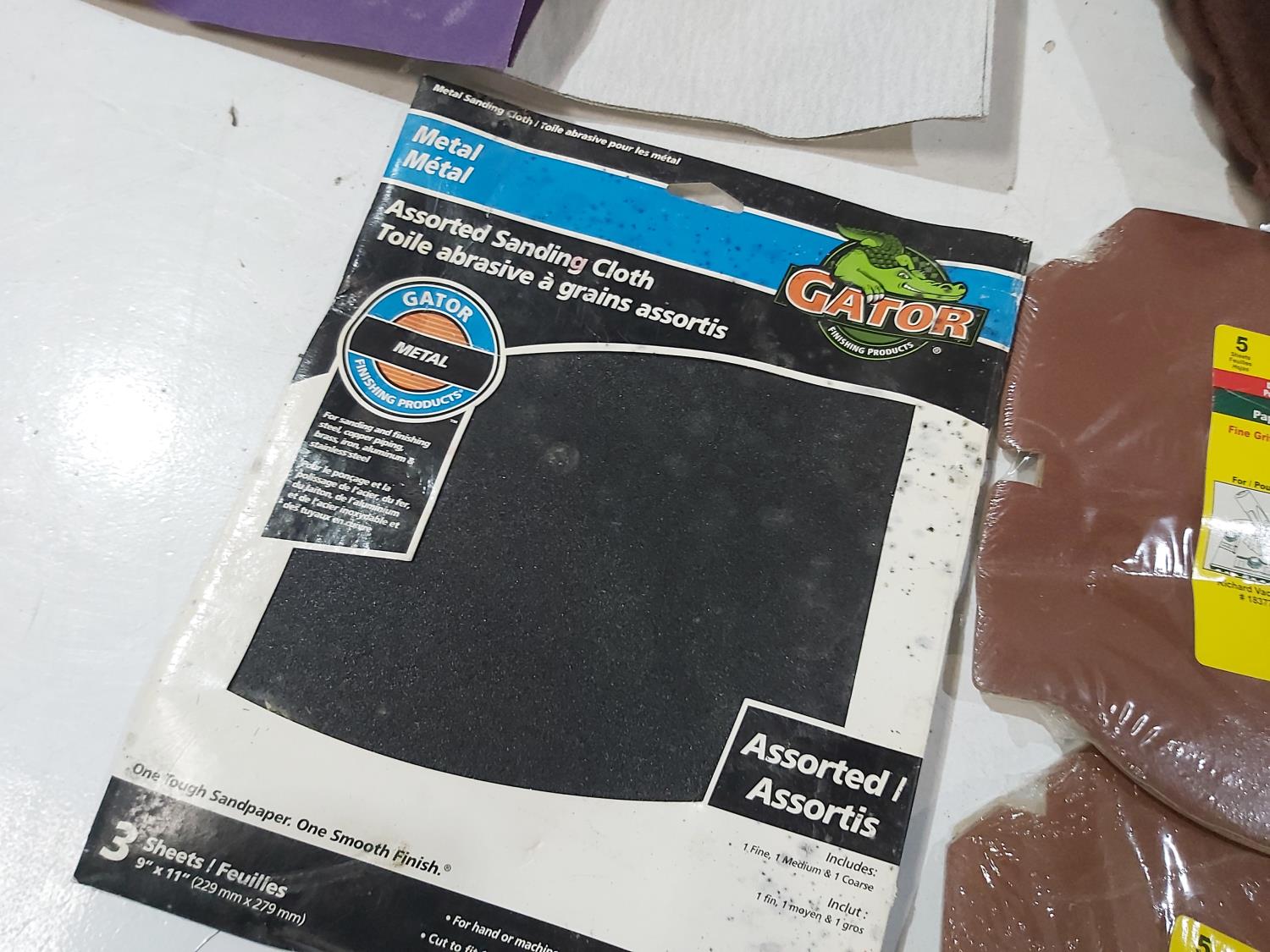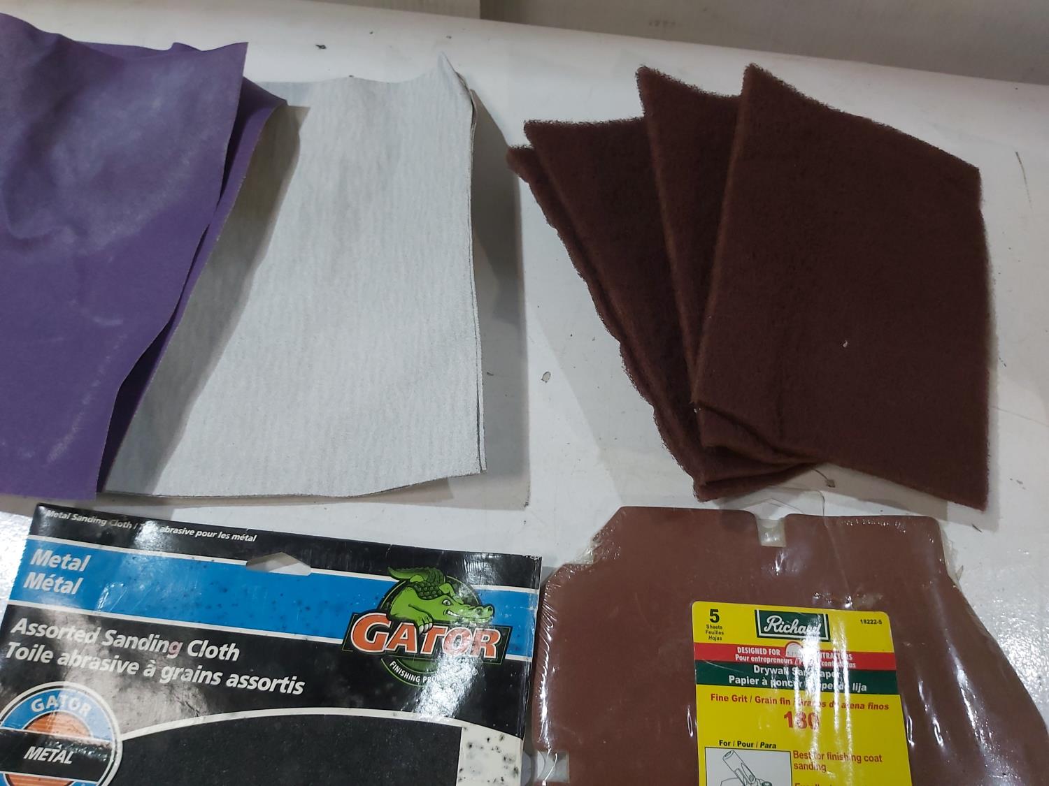 Assortment of sand paper and polishing pads, (3) 7 inch pad refills, cement edger, drywall sanding sheets, 2 inch paint brush, Bostitch 3/8 inch staples