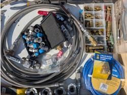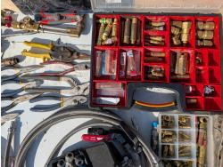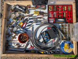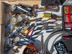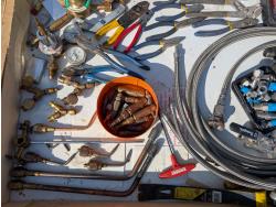 (3) 5 ft 3/8 inch ID with 1/4 NPT fittings (unused), 3 way air manifold, (4) Chicago fittings, (5) Swagelok ball valves 1/2 inch SS, qty of Swagelok fittings, (4) Swagelok high pressure braided hoses, oxygen/acetylene hose repair kit, supply kit of flame arresters, torch cutting tips, regulator adapters, flint cartridges, pliers, side cutters, (7) strikers, (2) acetylene regulators, oxygen regulator, gas welding tips, rose bud torch, Victor cutting torch head, miscellaneous cutting tips, (5) cutting shields
