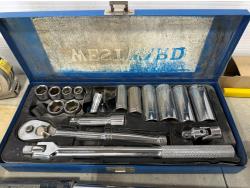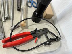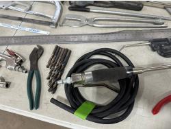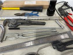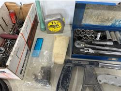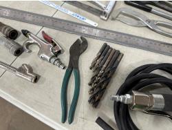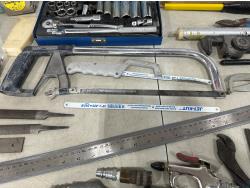 assorted drill bits, Westward socket set, plastic wedge, hacksaws and blades, 18 inch x 1/4 inch drill, straight edge, specialty pliers, air nozzles and tire pressure gauges