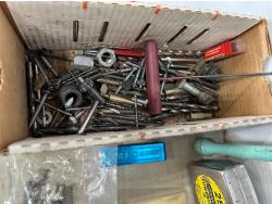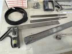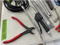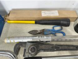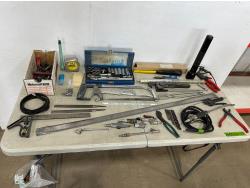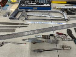 assorted drill bits, Westward socket set, plastic wedge, hacksaws and blades, 18 inch x 1/4 inch drill, straight edge, specialty pliers, air nozzles and tire pressure gauges