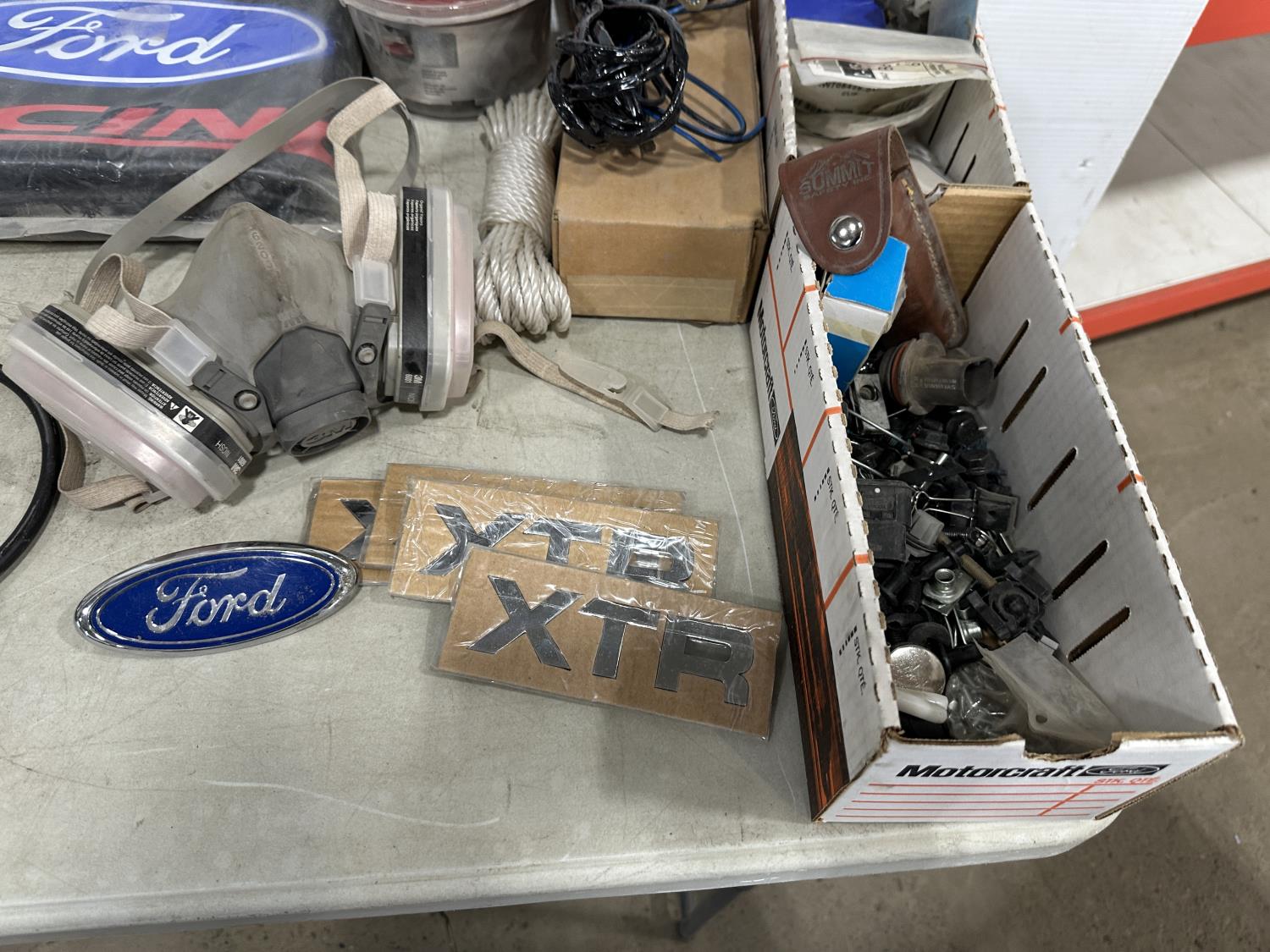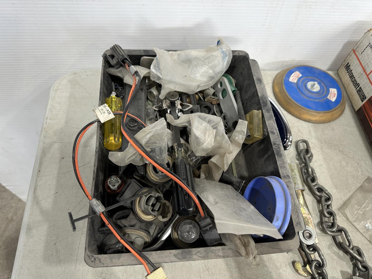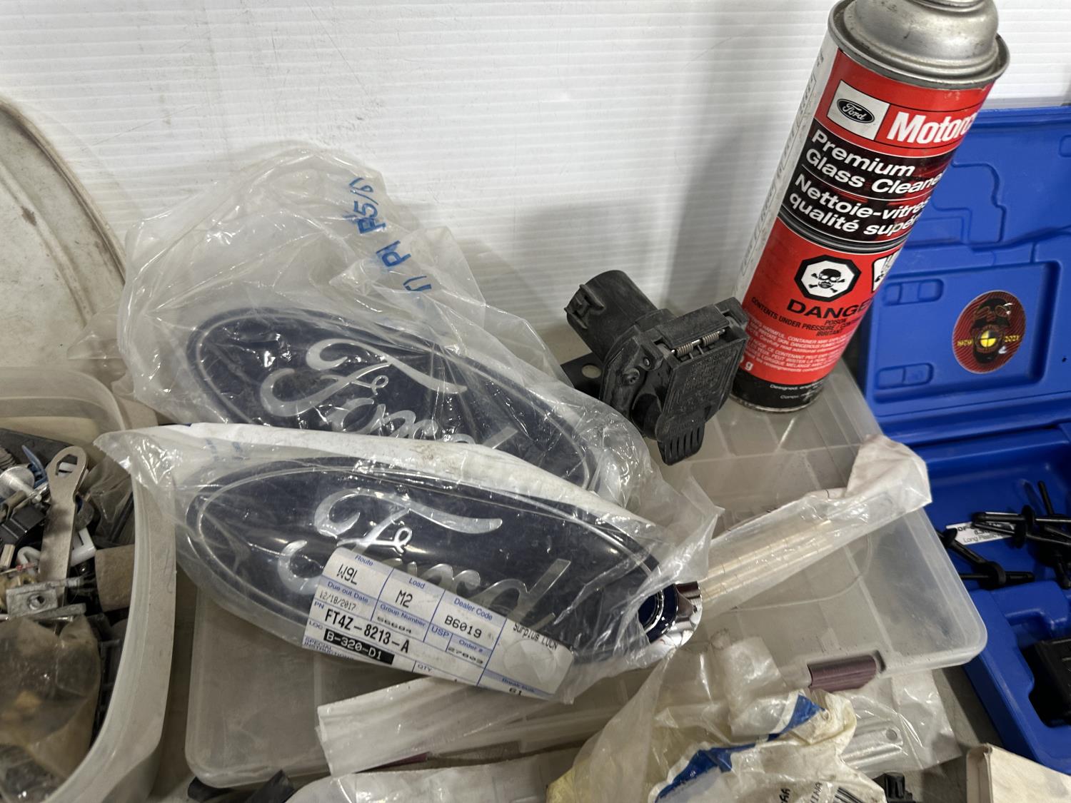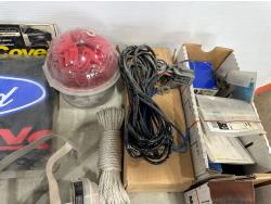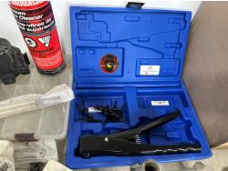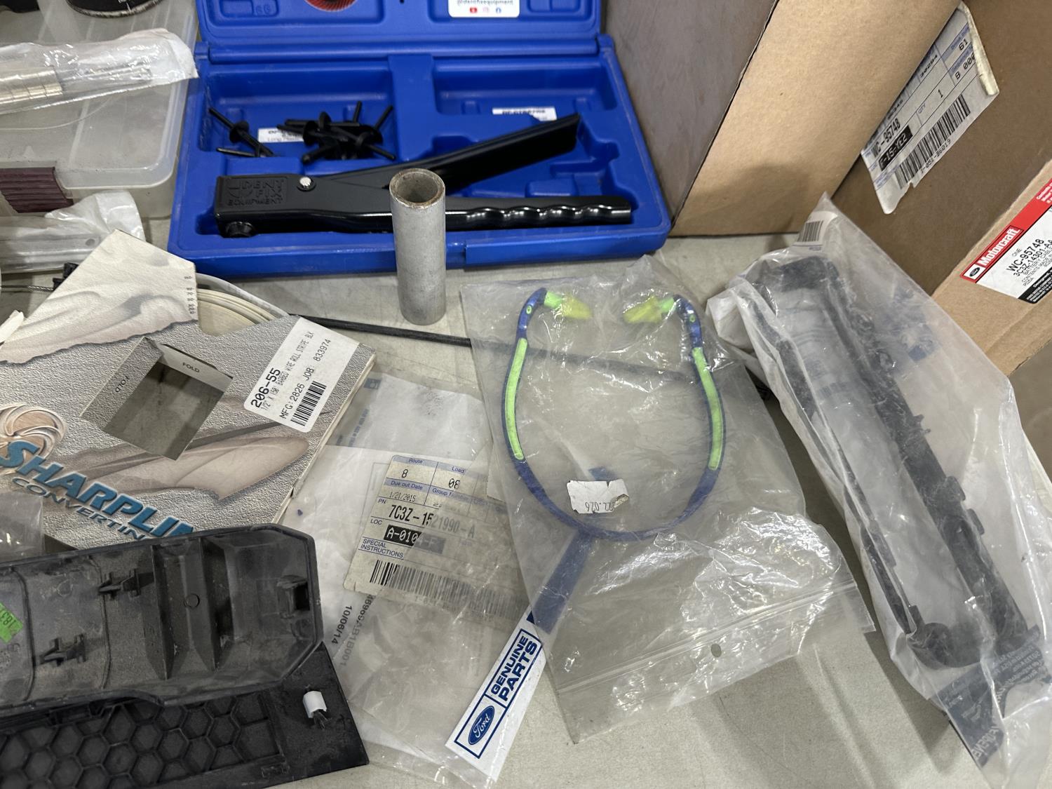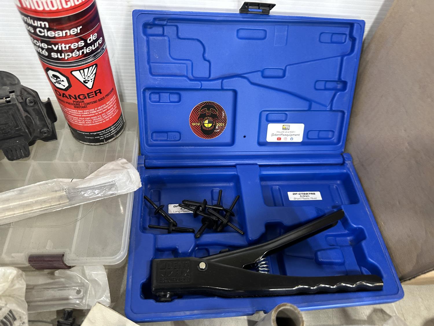 badges, lights bulbs, rivets, rivet gun, clips, fender cover