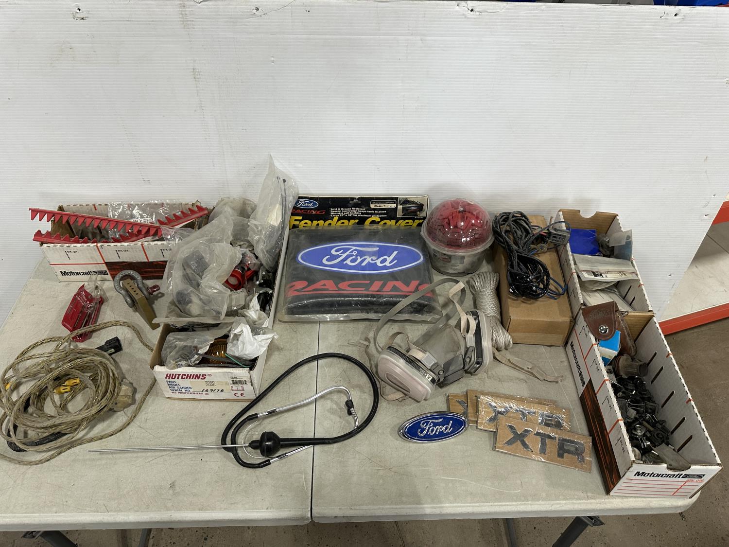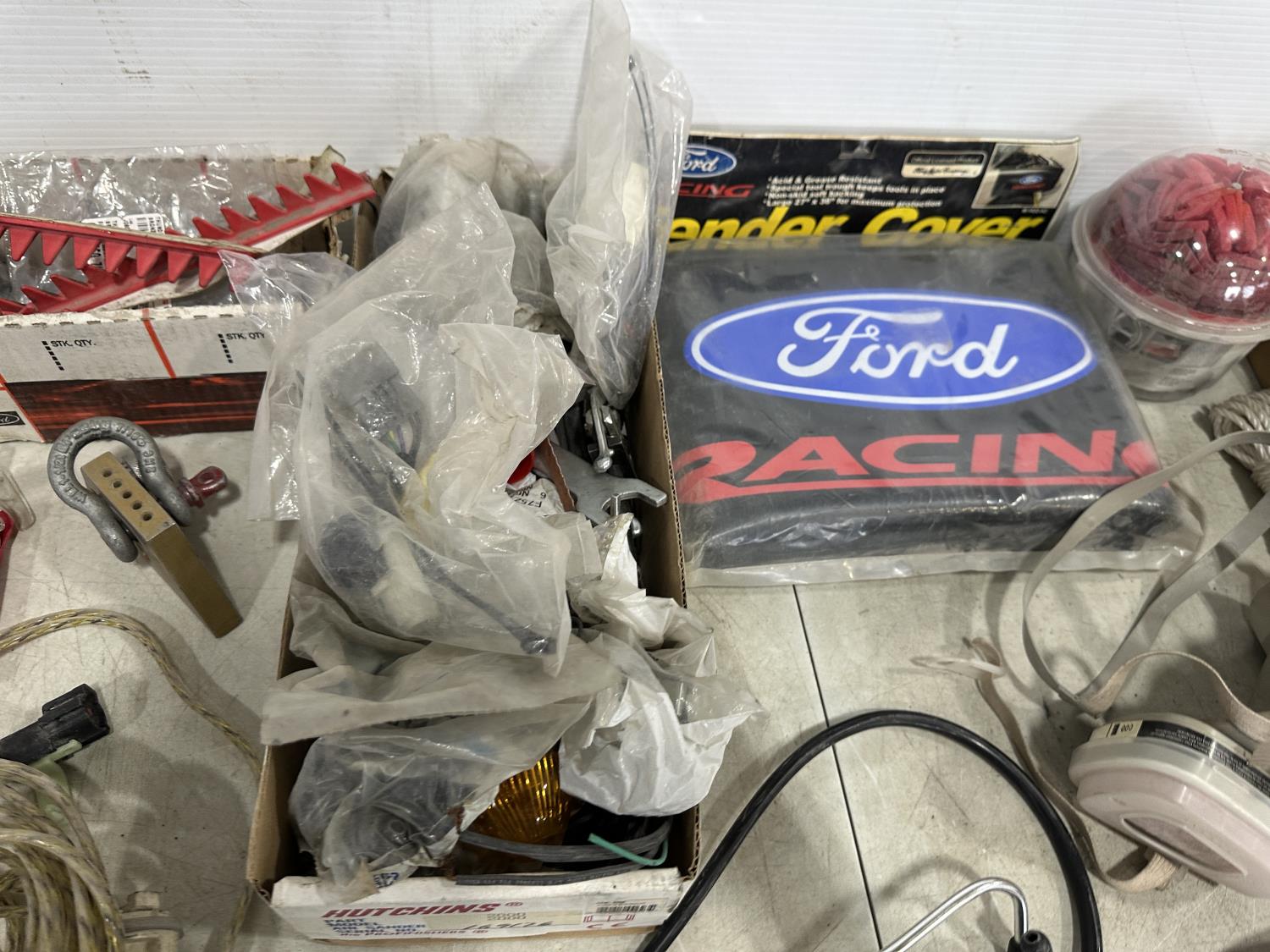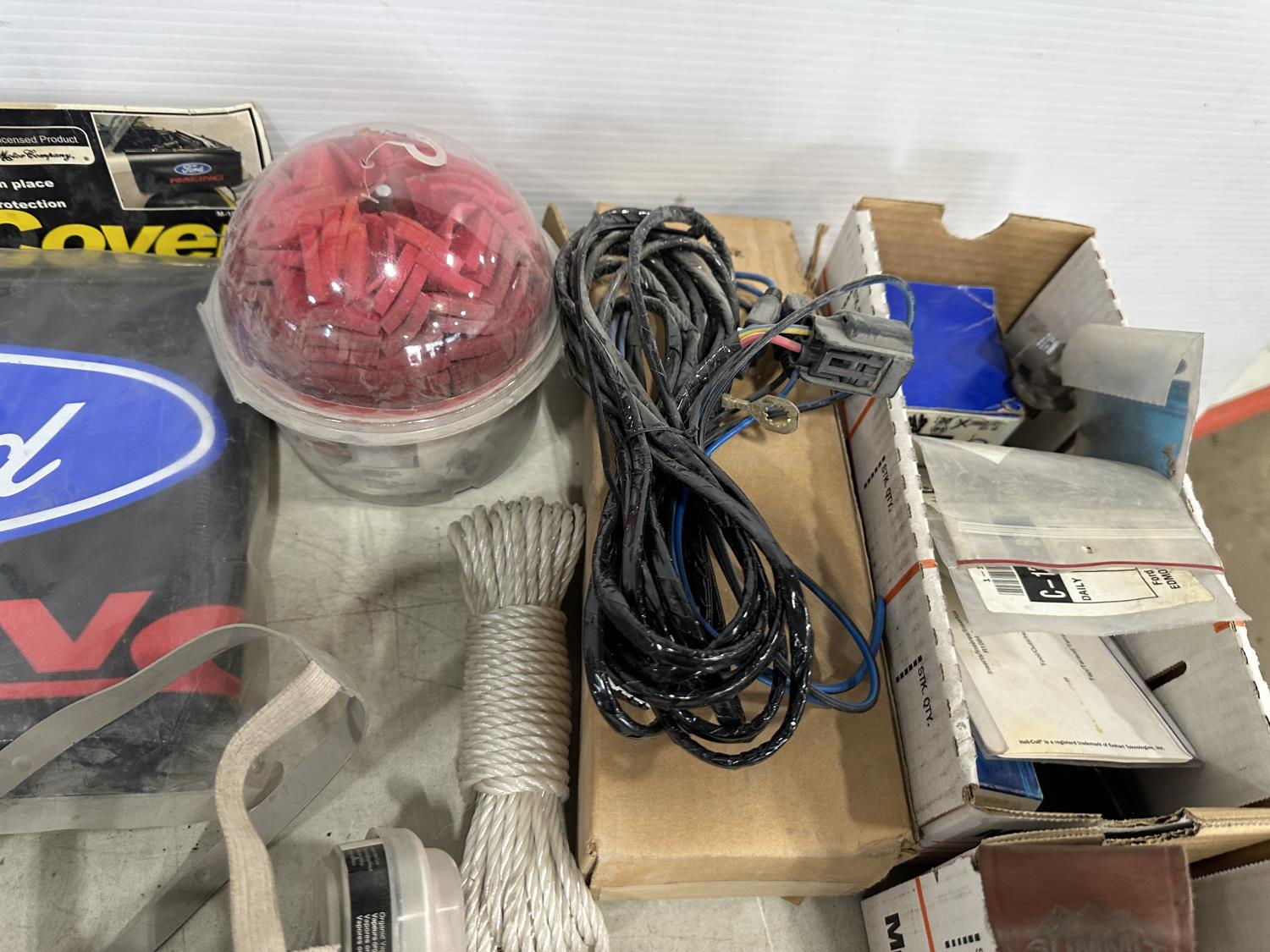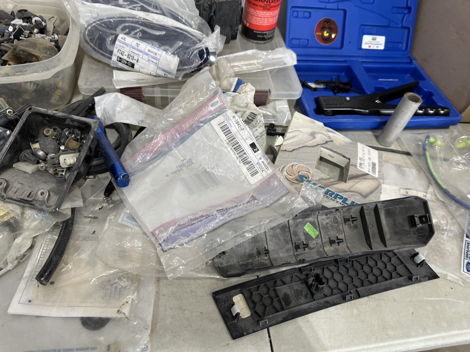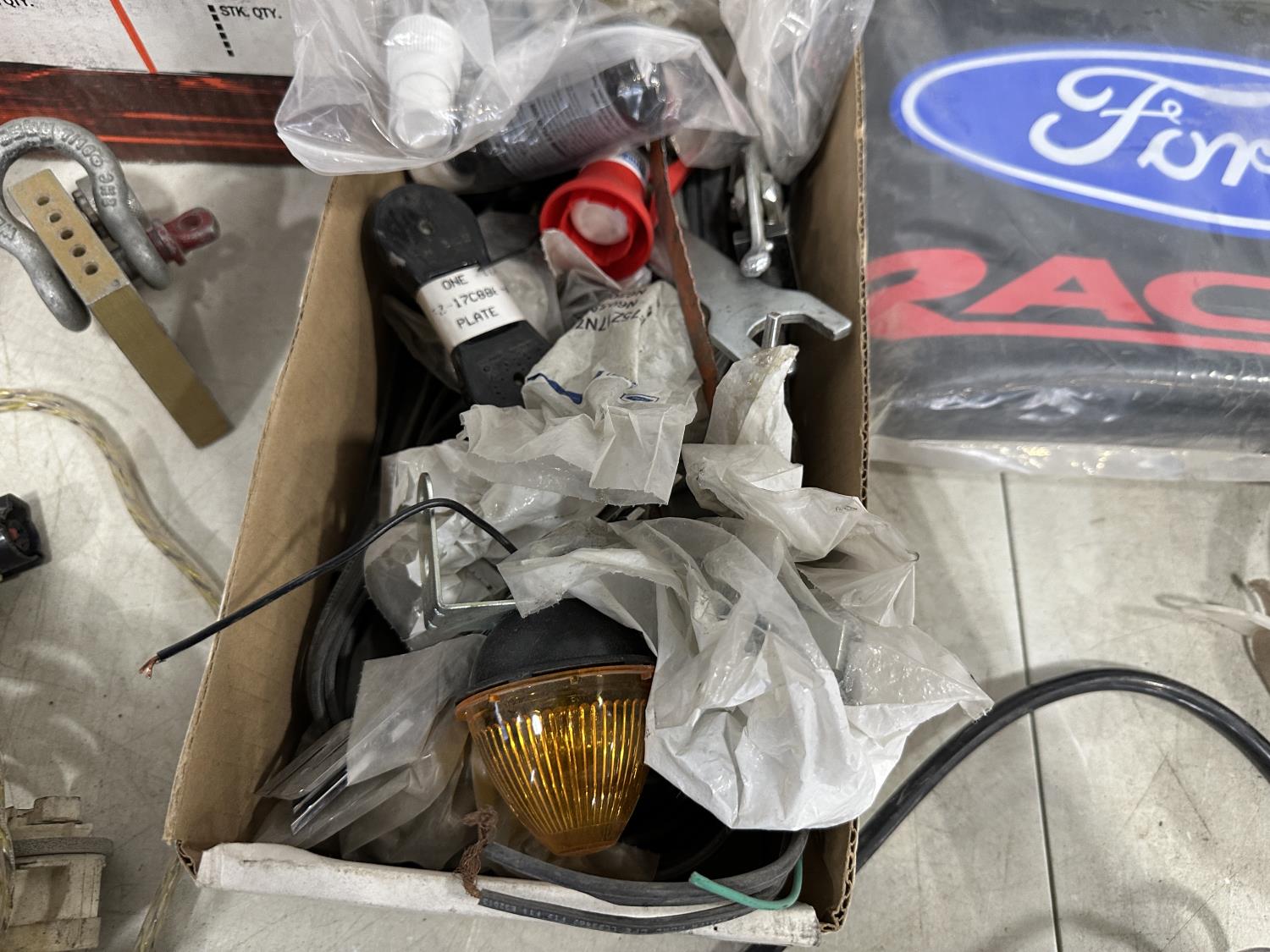 badges, lights bulbs, rivets, rivet gun, clips, fender cover