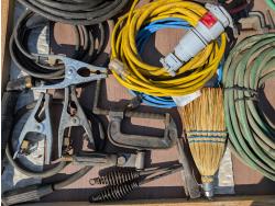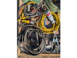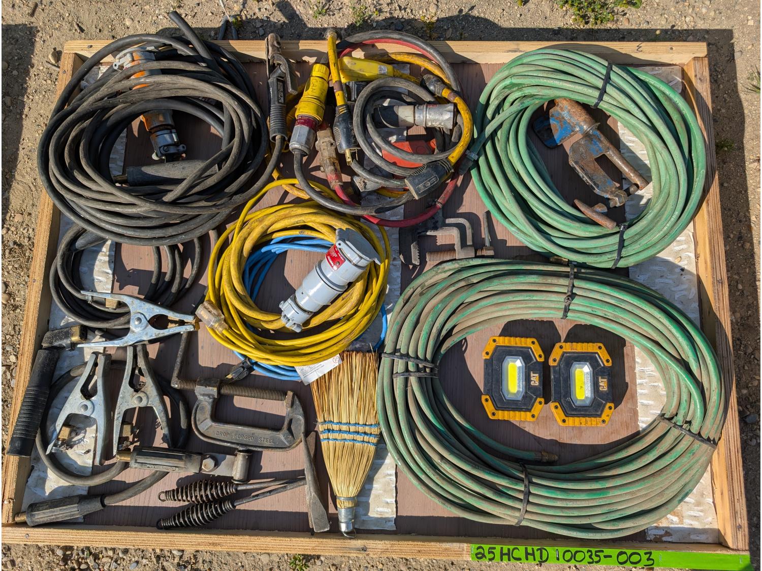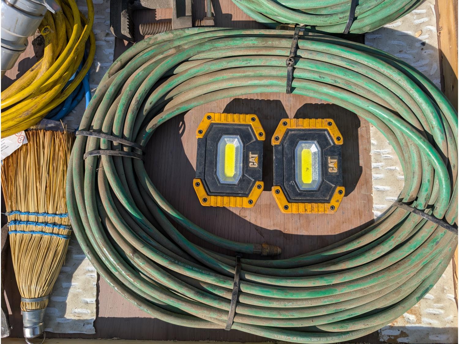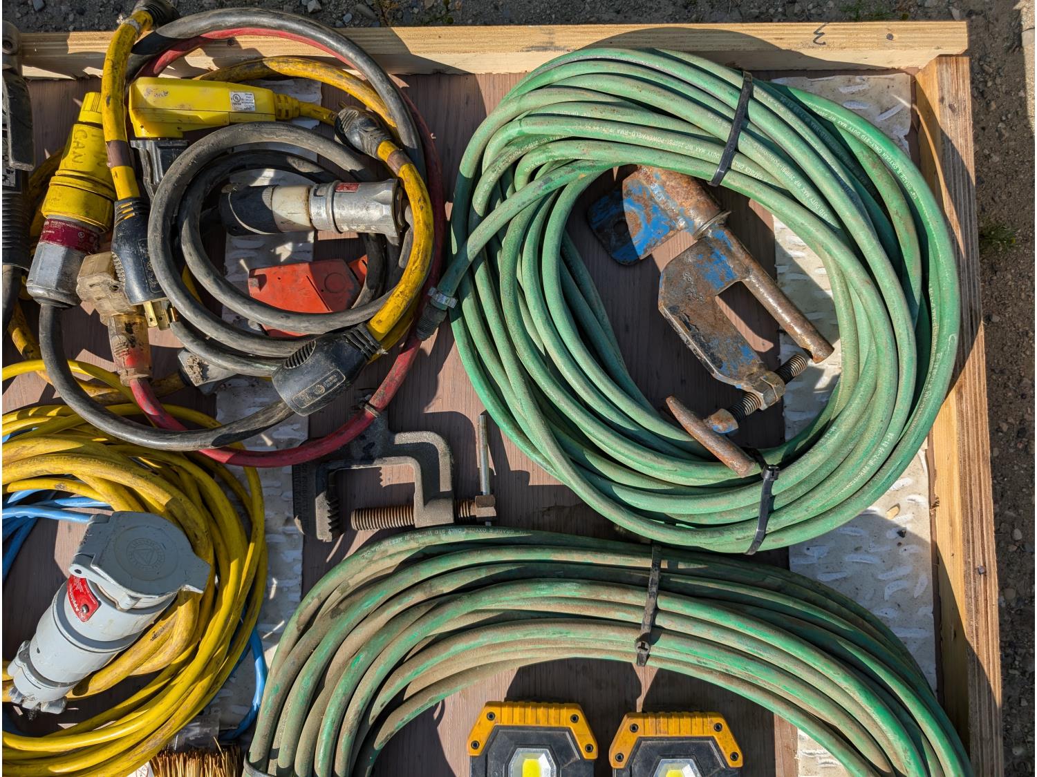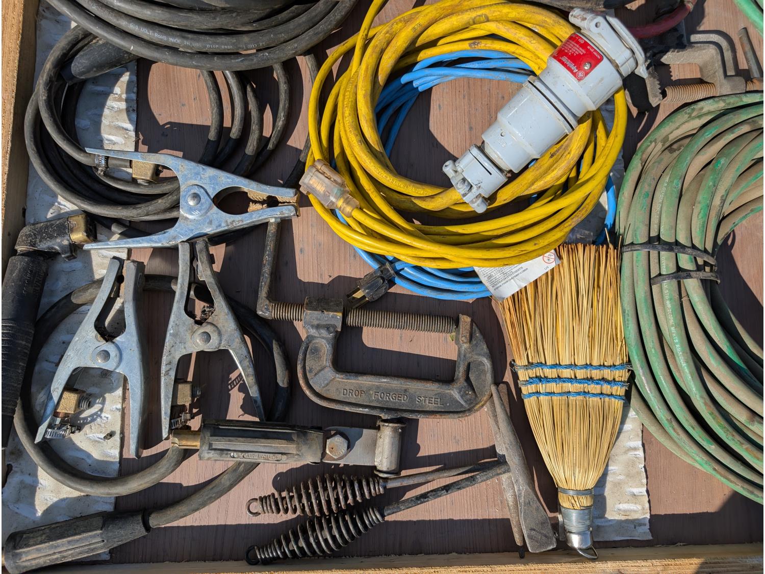 (2) 50 ft argon/oxygen hose, (3) wired ground clamps, (3) various ground clamps, 15 ft explosion proof extension cord, stinger lead, spare stinger, (2) extension cords, (3) cheater cord adapters, (3) cord multi plug ends, (2) Cat LED magnetic lights, (2) chipping hammers