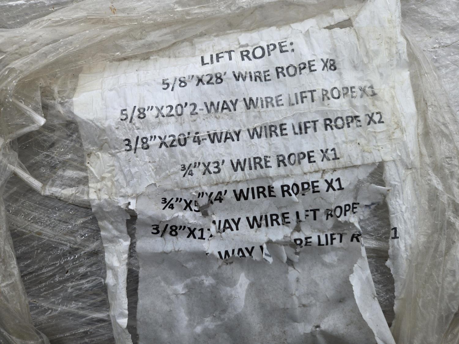 8) 5/8 inch x 28 ft (3) 5/8 inch x 20 ft 2-way wire lift rope, (2) 3/8 inch x 20 ft 4-way wire lift rope, 3/4 inch x 3 ft (2) 3/4 inch x 4 ft 3/4 inch x 5 ft 2-way wire lift rope, 3/8 inch x 17 ft 4-way wire lift rope
