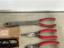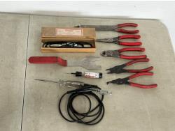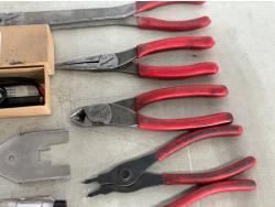 Needle nose pliers, side cutters, snap ring pliers, electrical tester and etching pencil