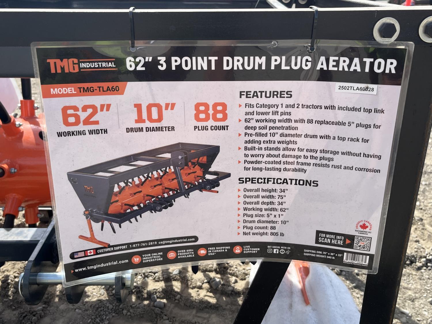62" working width, Cat 1 & Cat 2 tractors, 5" plug length