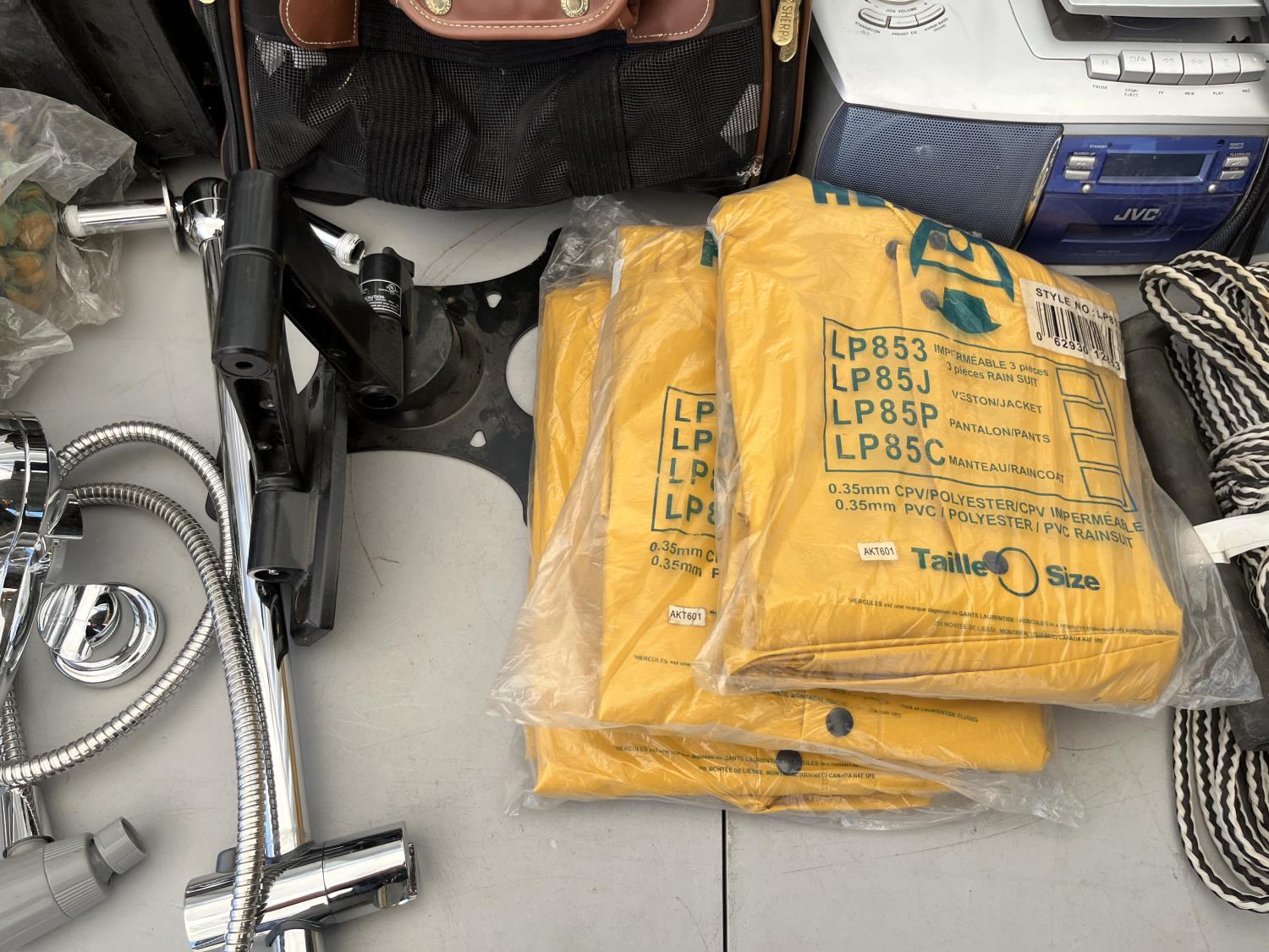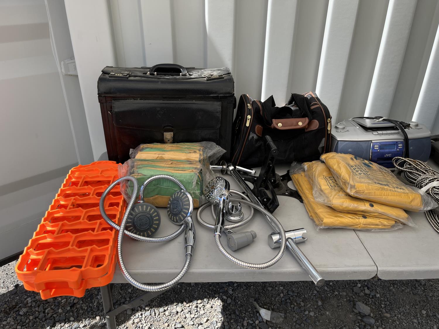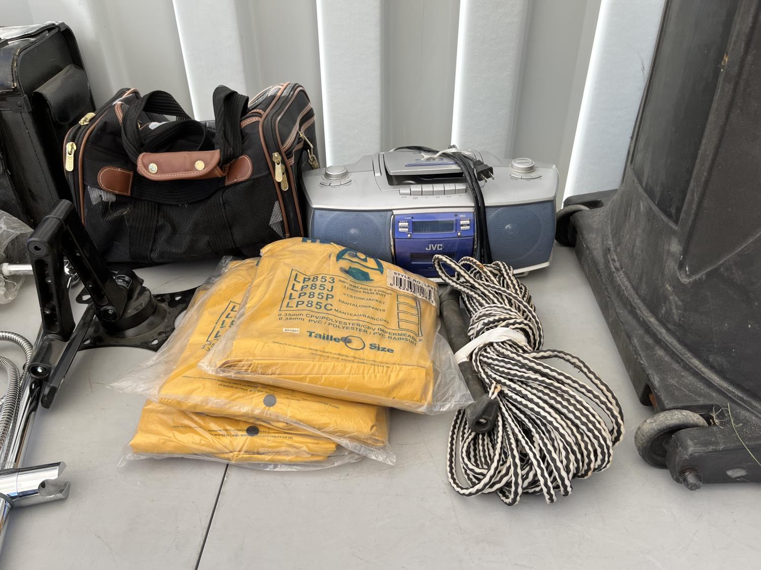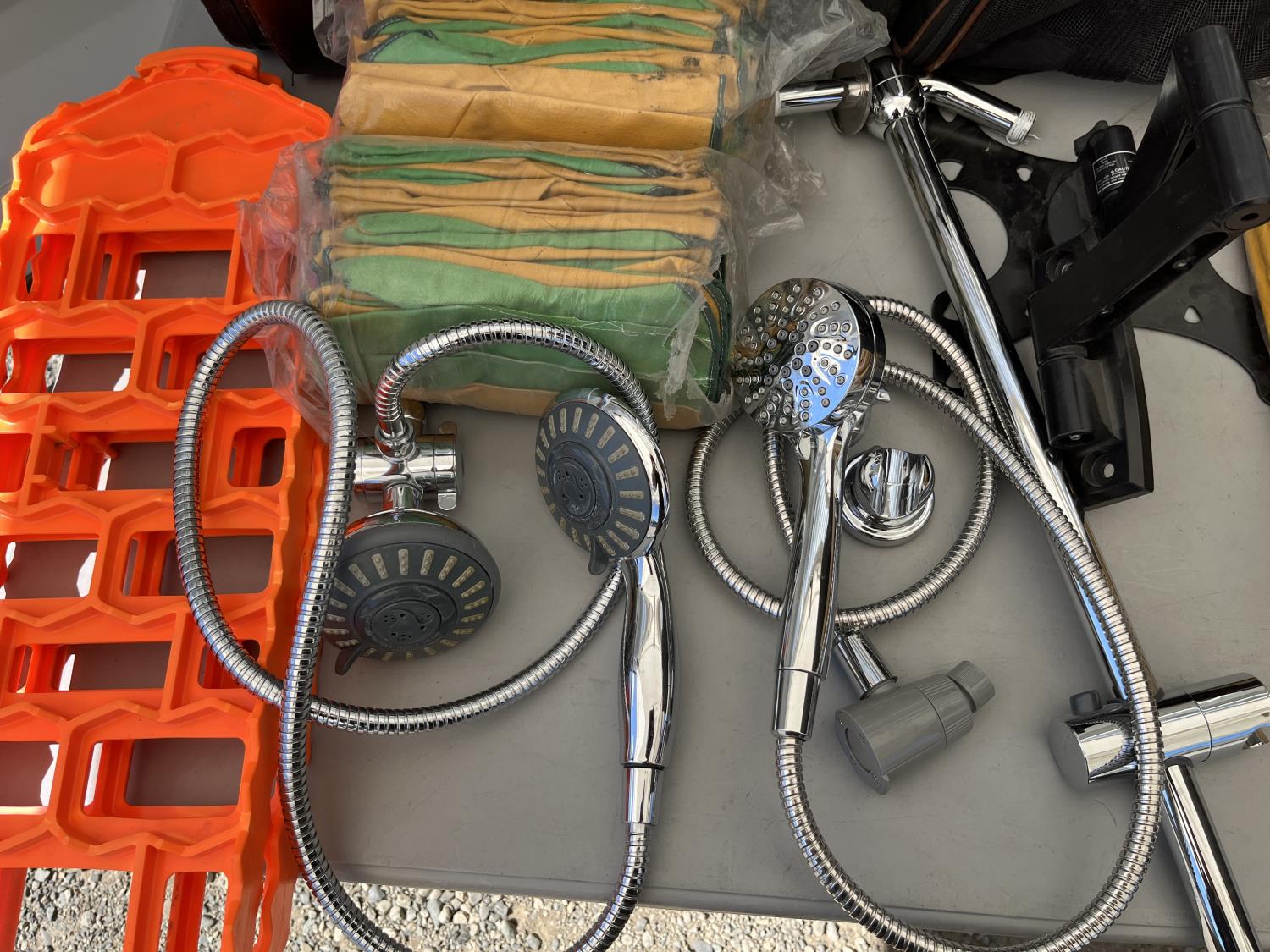 (2) packs of work gloves (unused) (3) Rain gear poncho (unused) (2) traction boards, (2) shower heads, CD/radio player, storage bin