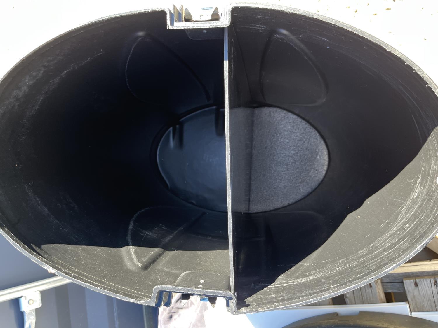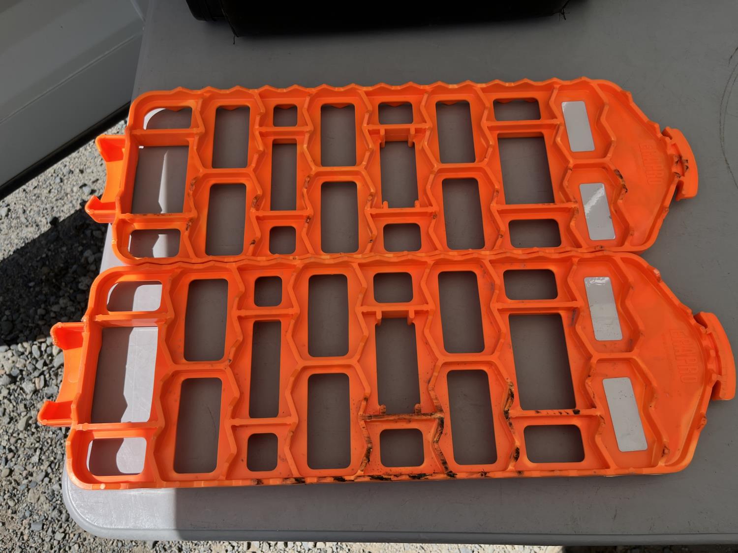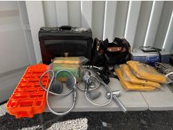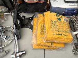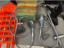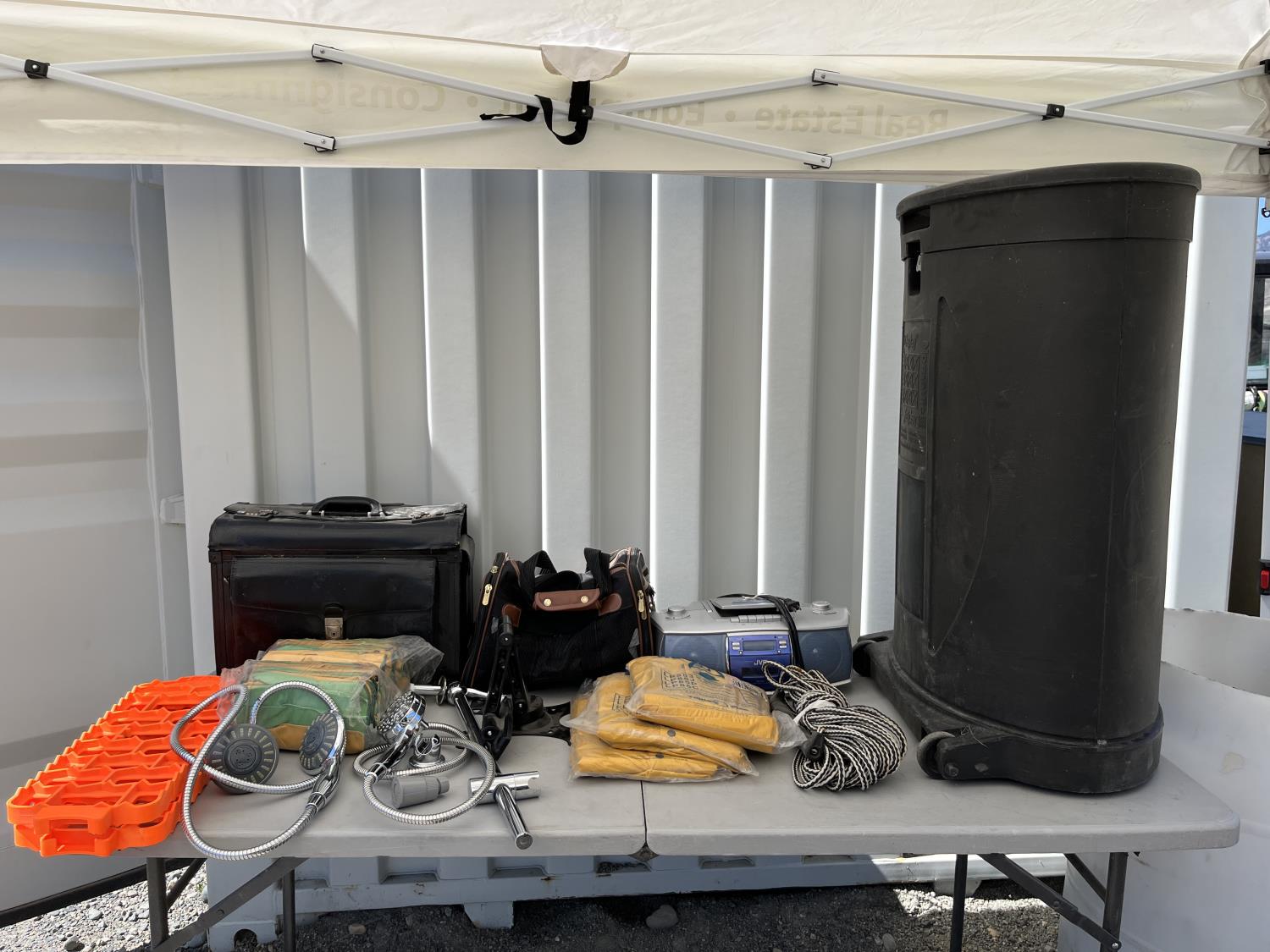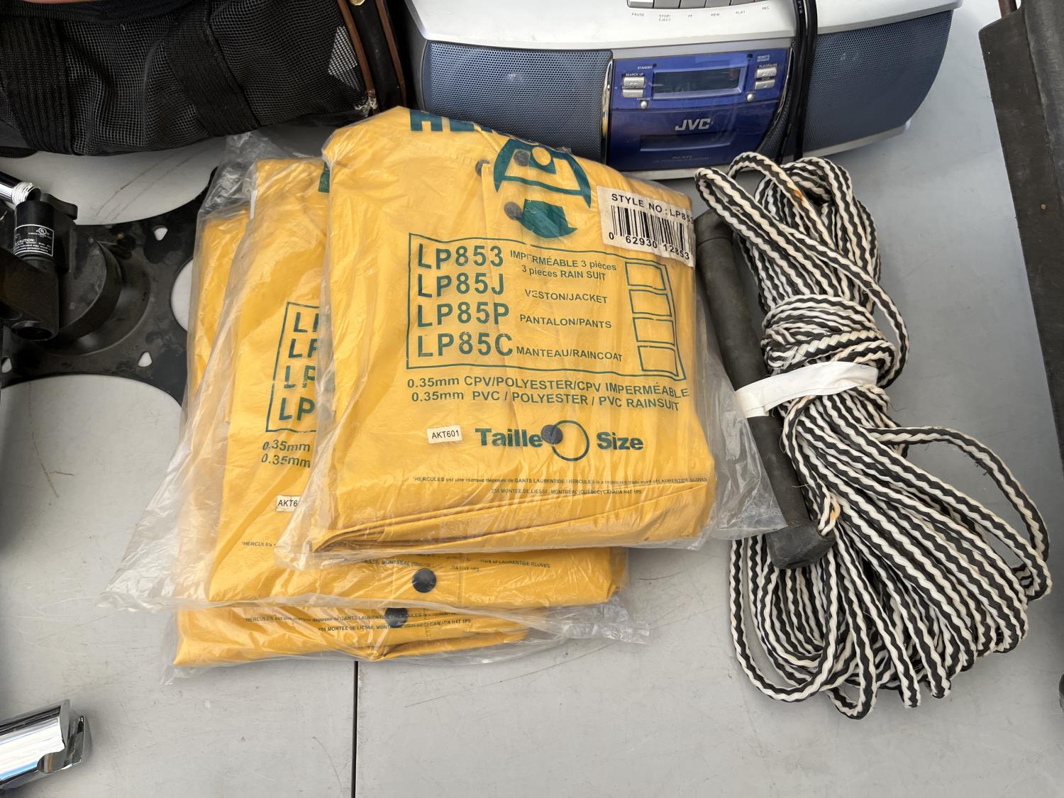 (2) packs of work gloves (unused) (3) Rain gear poncho (unused) (2) traction boards, (2) shower heads, CD/radio player, storage bin