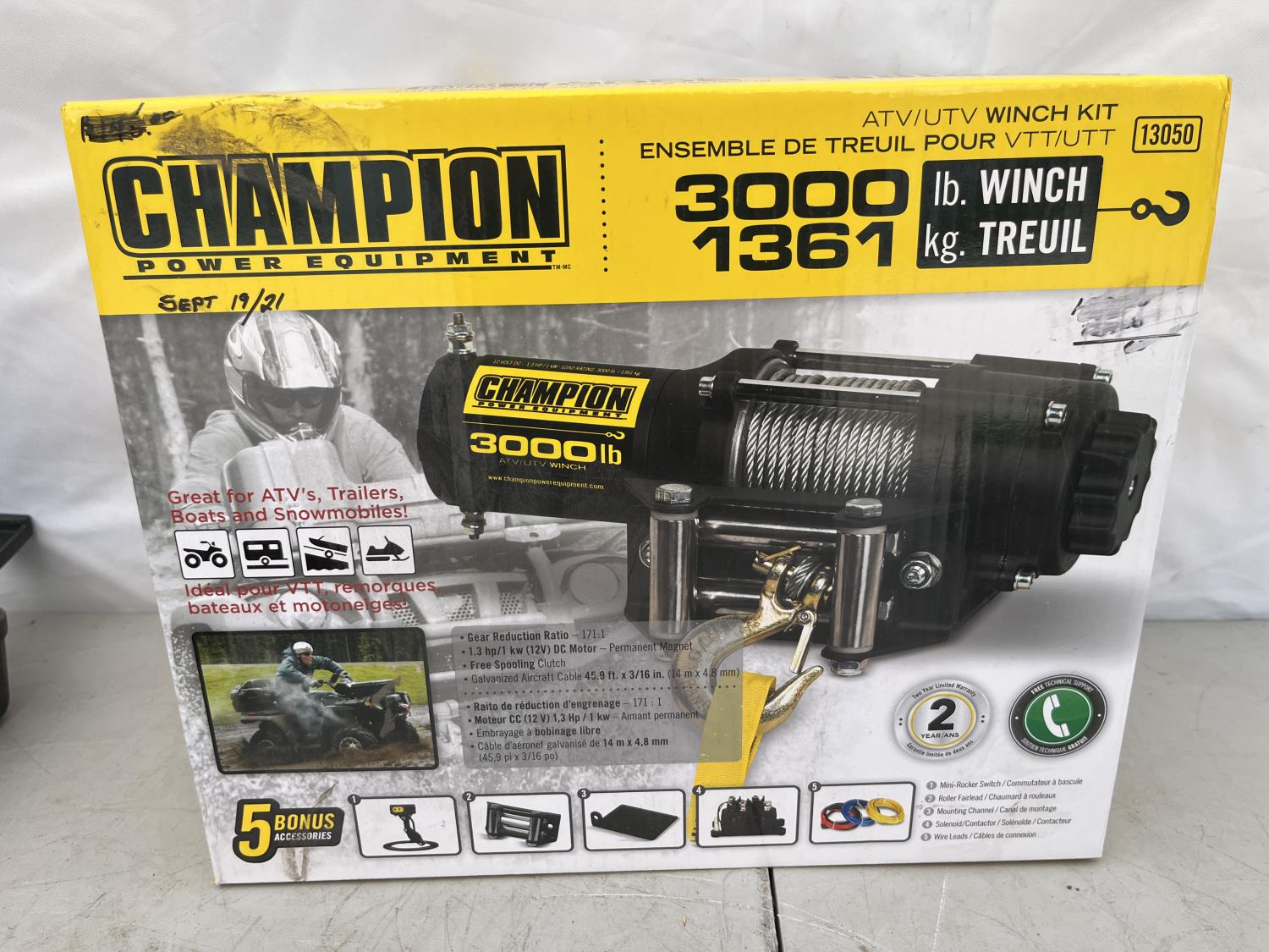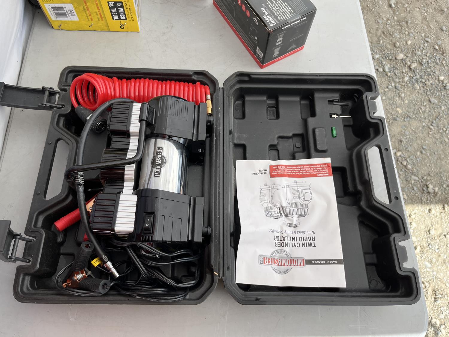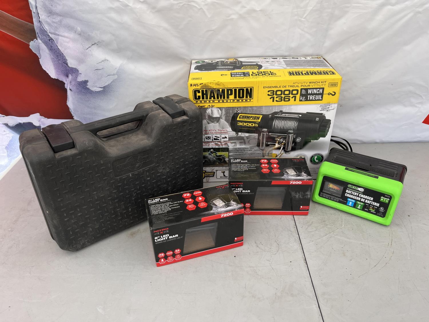 3000 lb electric winch, twin cylinder rapid inflator, (2) 6 inch LED light bar, battery charger