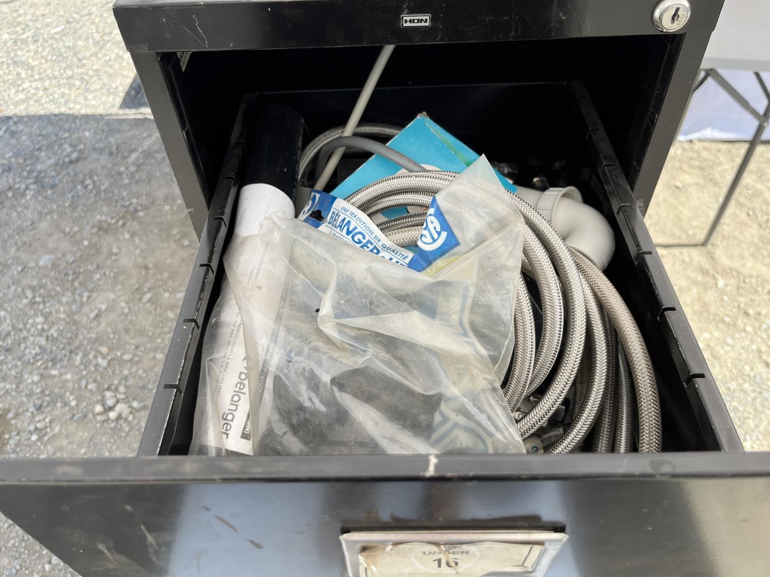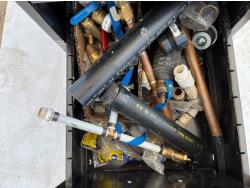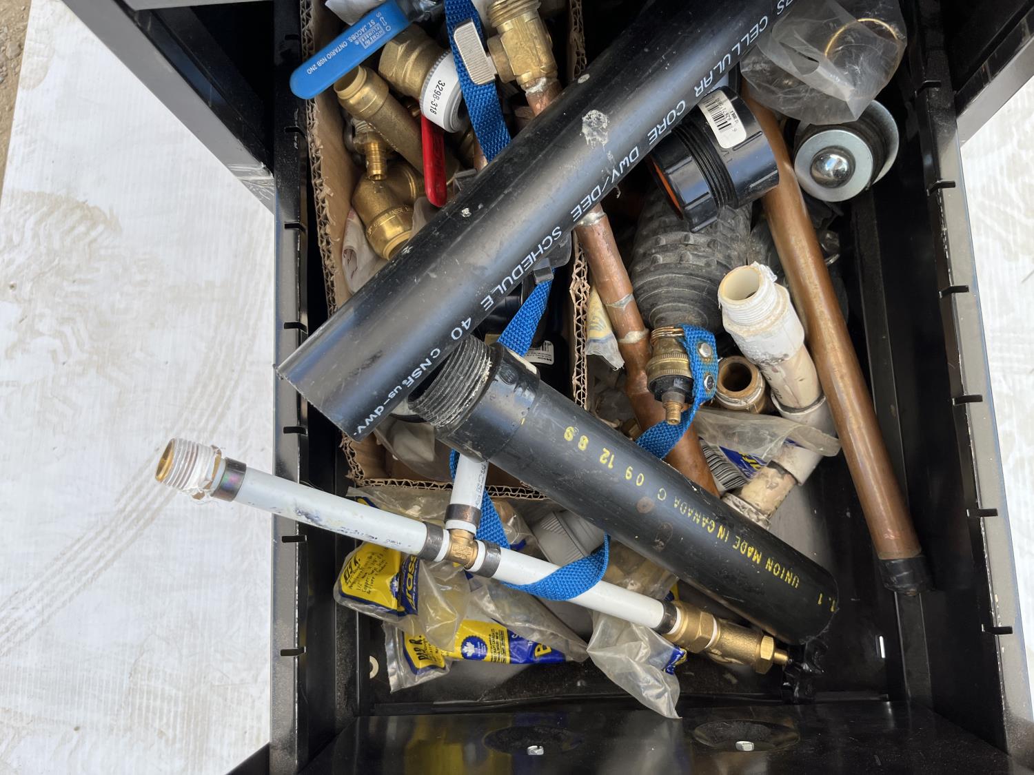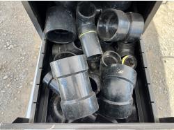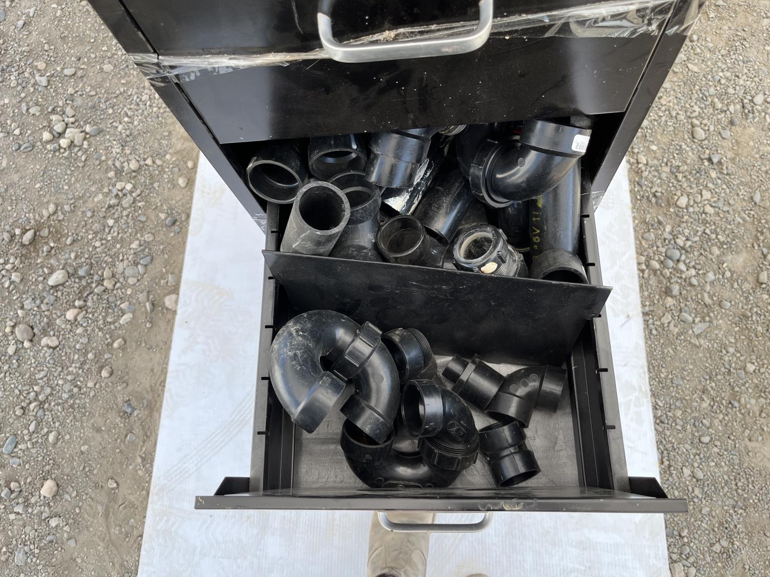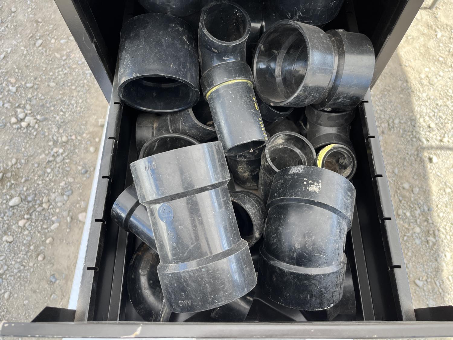 Cabinet with multiple ABS pipe fittings, water hoses, adapters