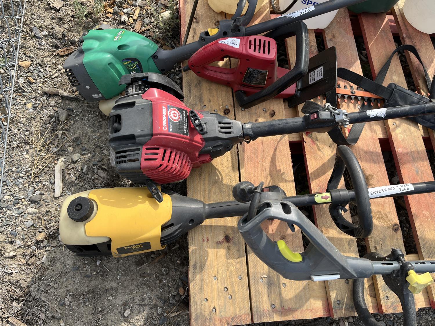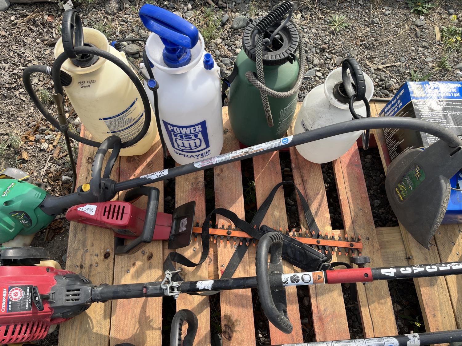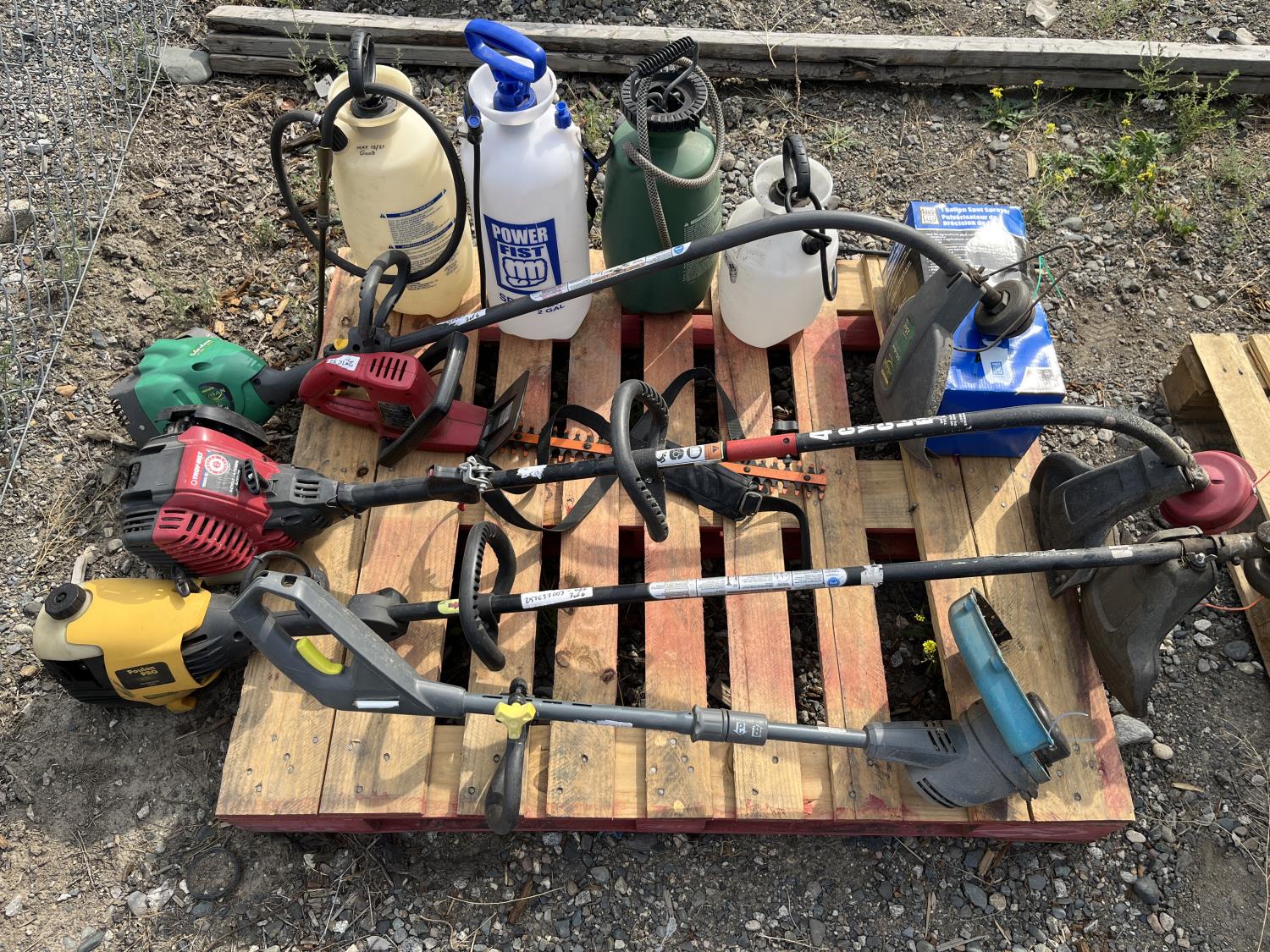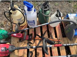 (5) Sprayers, (4) weed eater's, (1) Craftsman hedge trimmer (Starters pull, condition unknown)