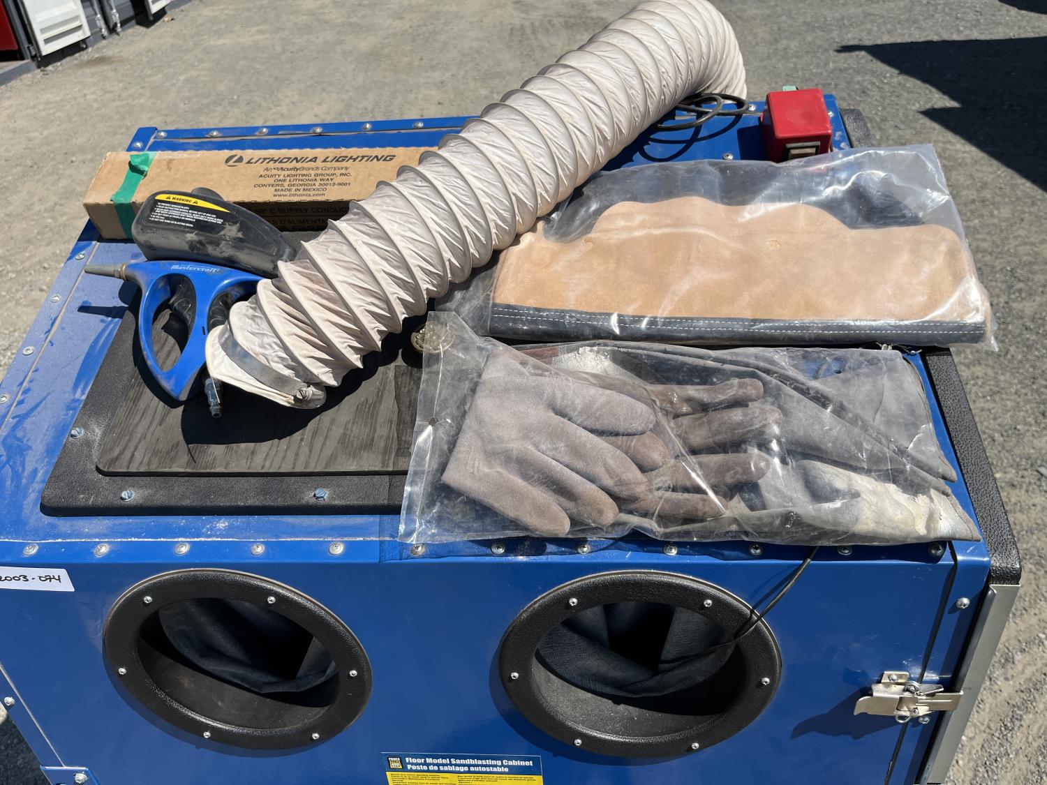 Mastercraft sandblasting gun, belt, fluorescent light for unit, gloves,