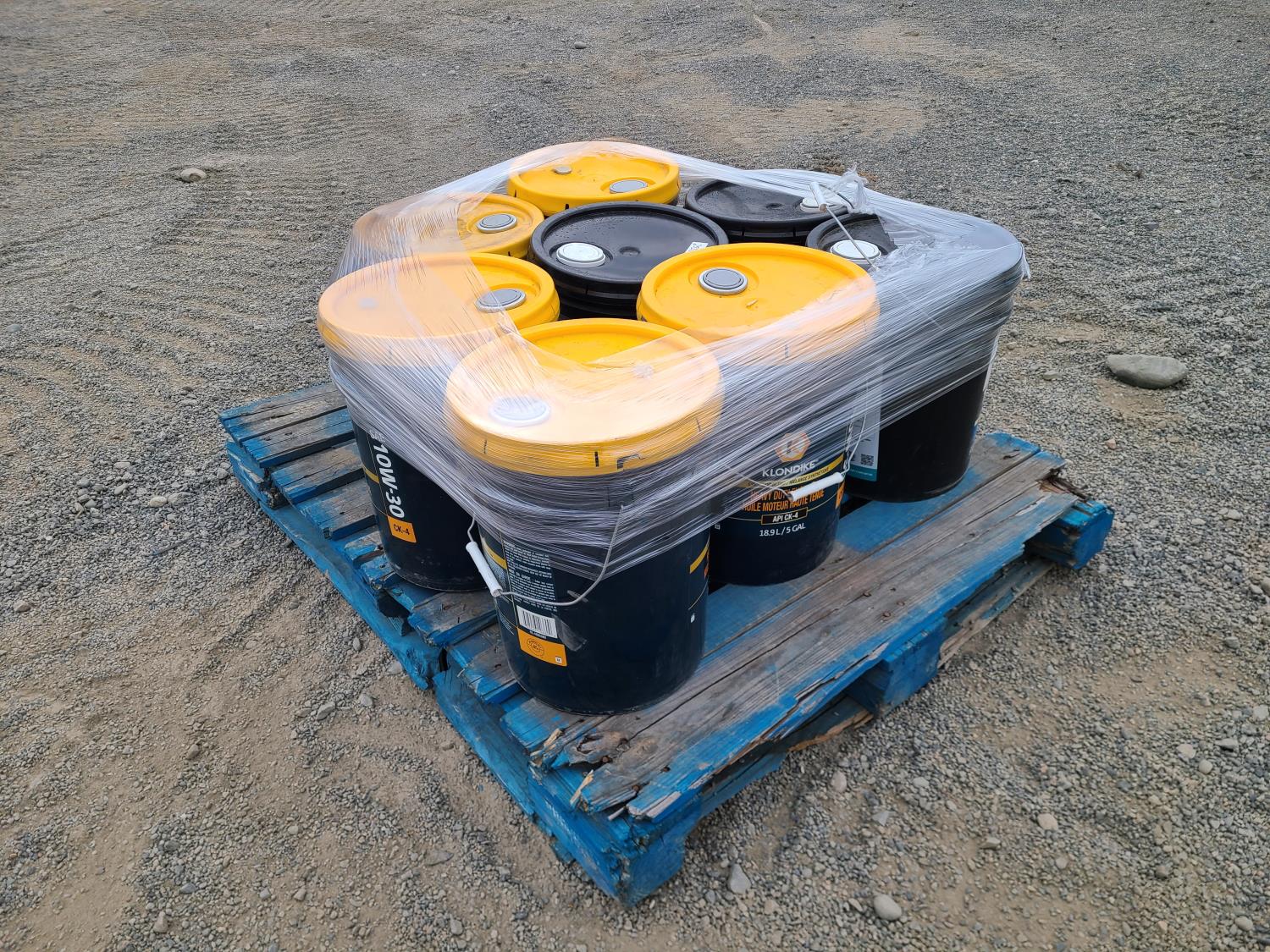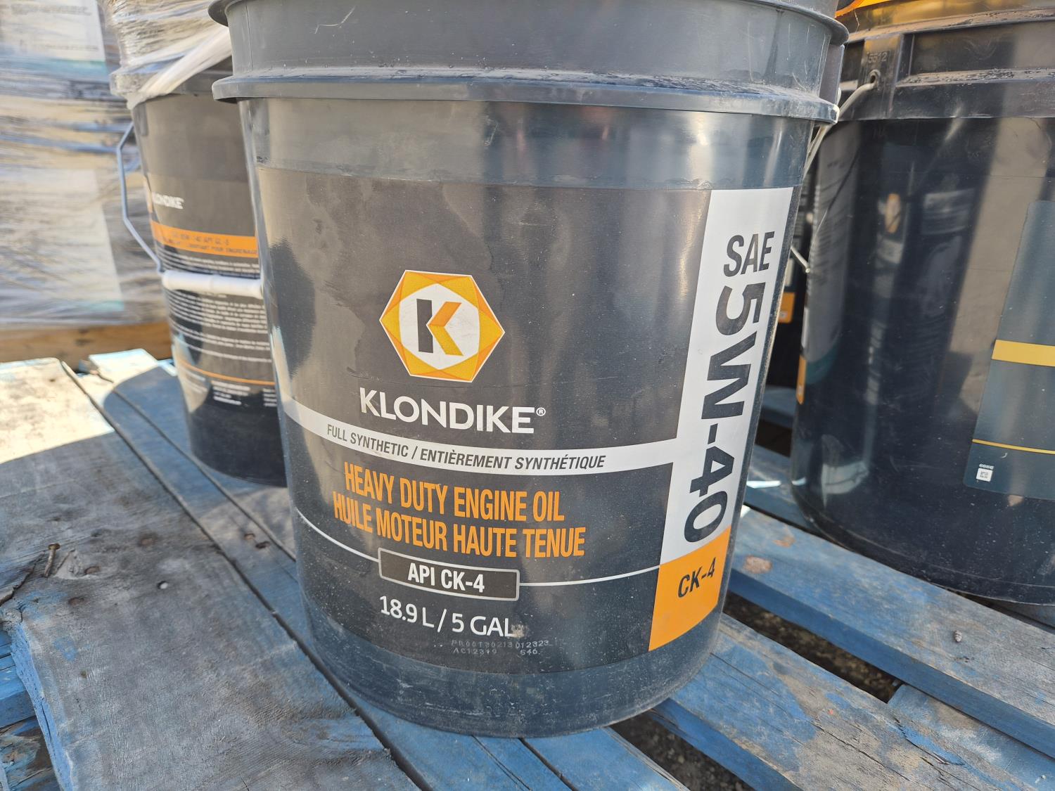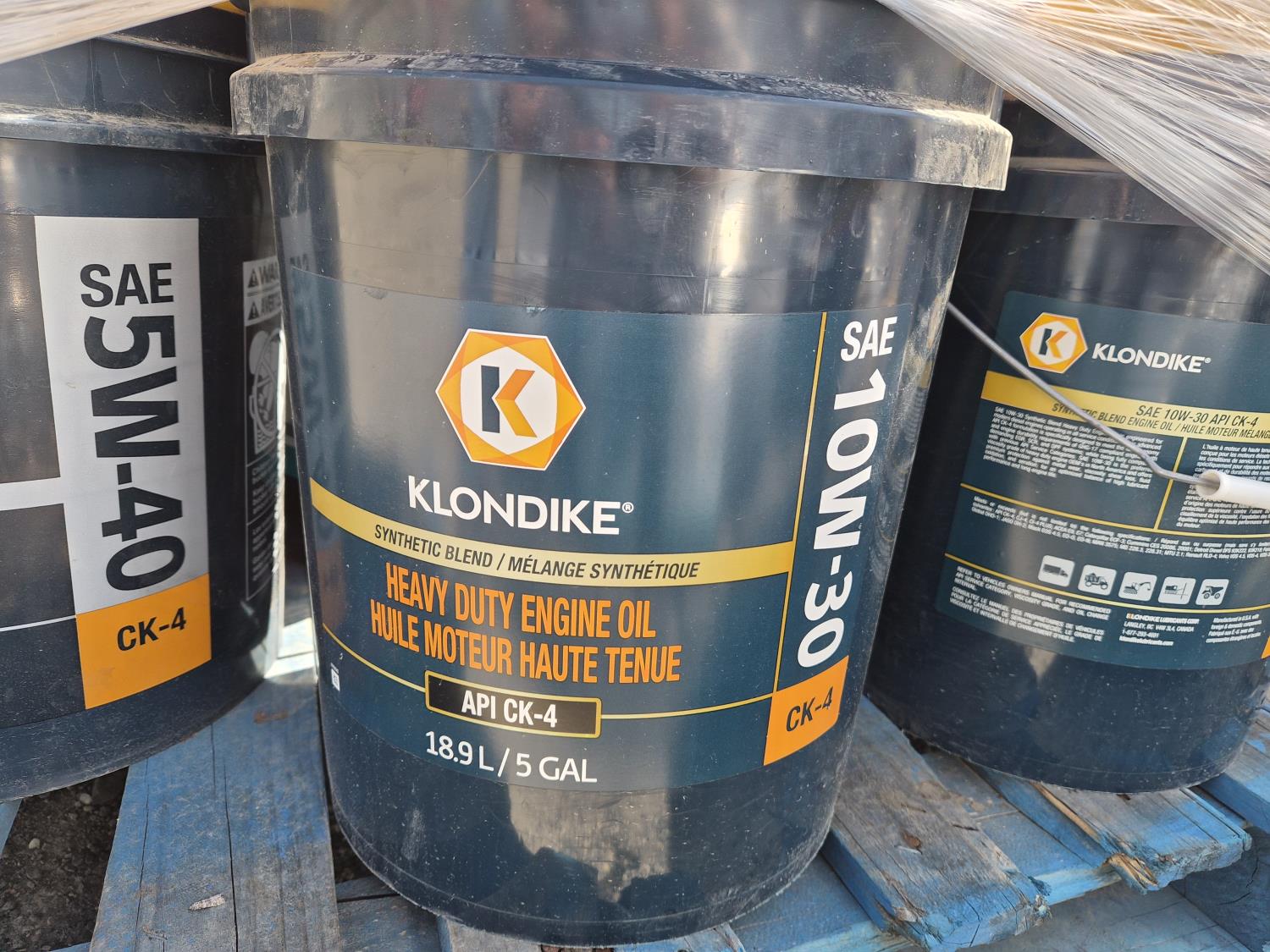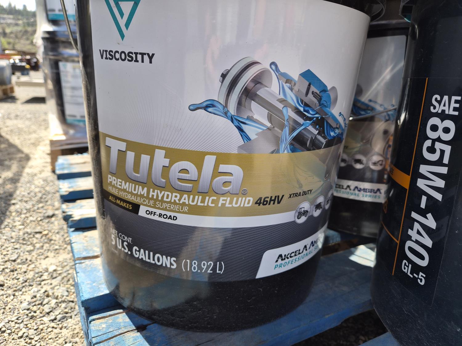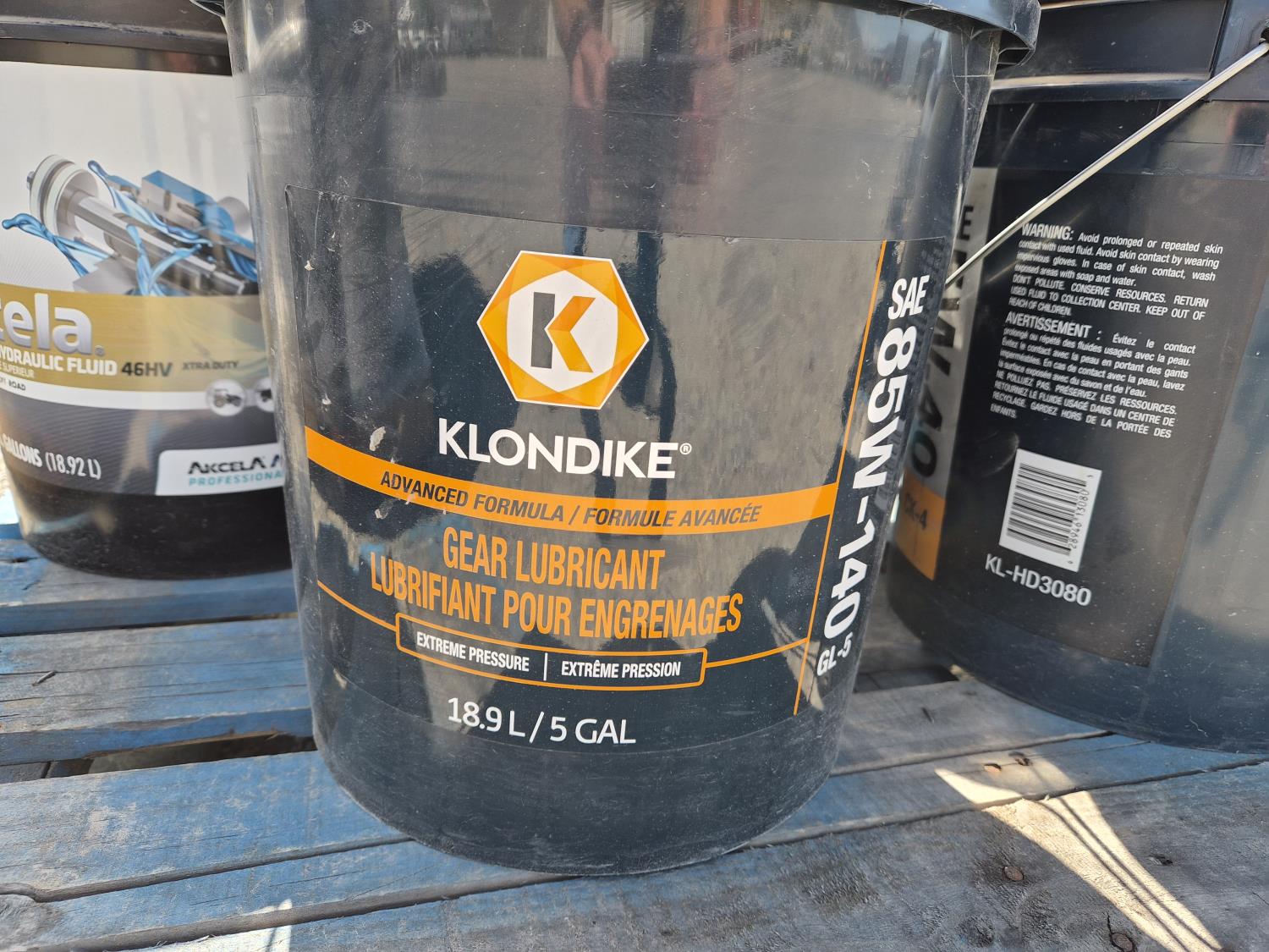 (1) 18.92lt pail of Tutela 75W-90 gear lube, (3) 18.92lt pails of Klondike 10W-30 synthetic h/d engine oil, (2) 18.92lt pails of Tutela 46HV premium hydraulic fluid, (1) 18.92lt pail of Klondike 85W-140 gear lube, (1) 18.92lt pail of Klondike 5W-40 synthetic engine oil