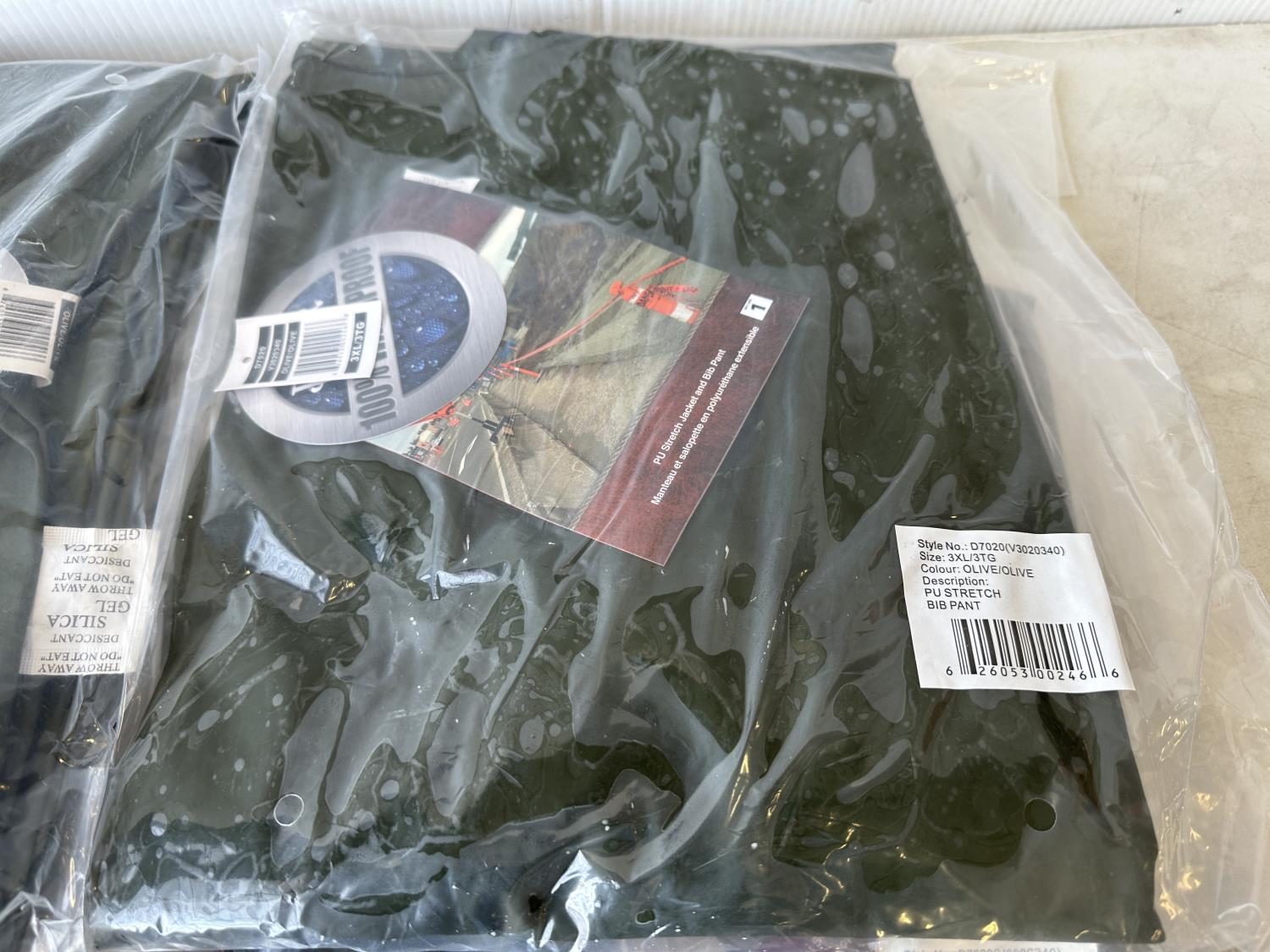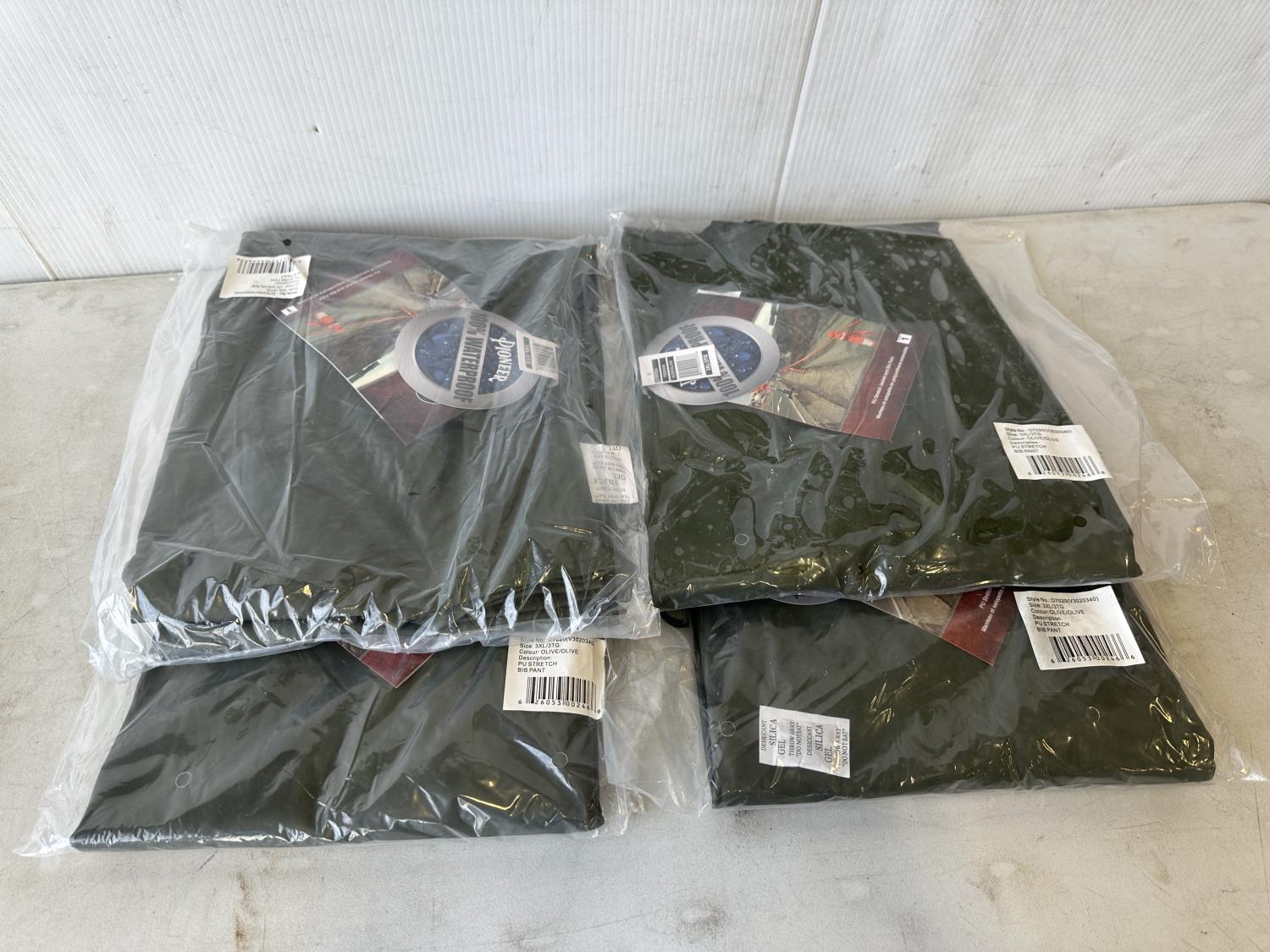 5080 (4) Size 3XL (1) 2XL Pioneer PU Stretch Waterproof Rain Bibs All Water Damaged