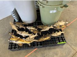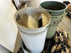 5277 (5) Poly Garbage Cans, (3) Metal Window Wells and Metal Fish Wall Art
