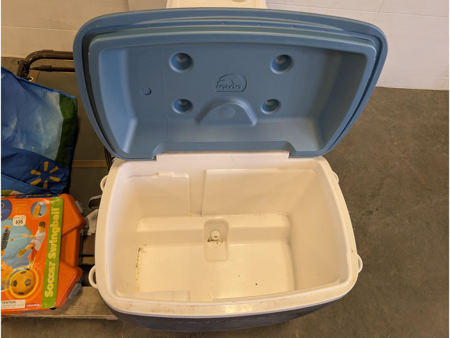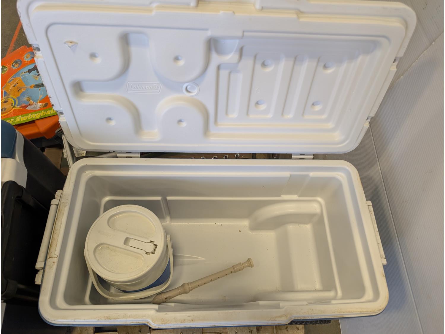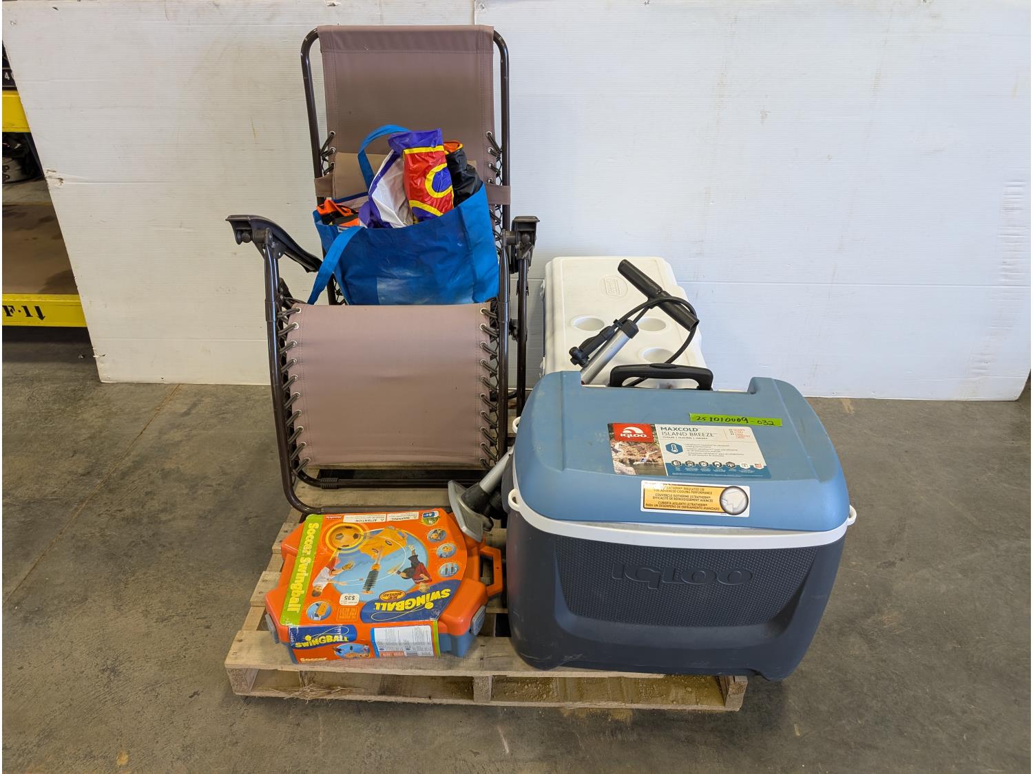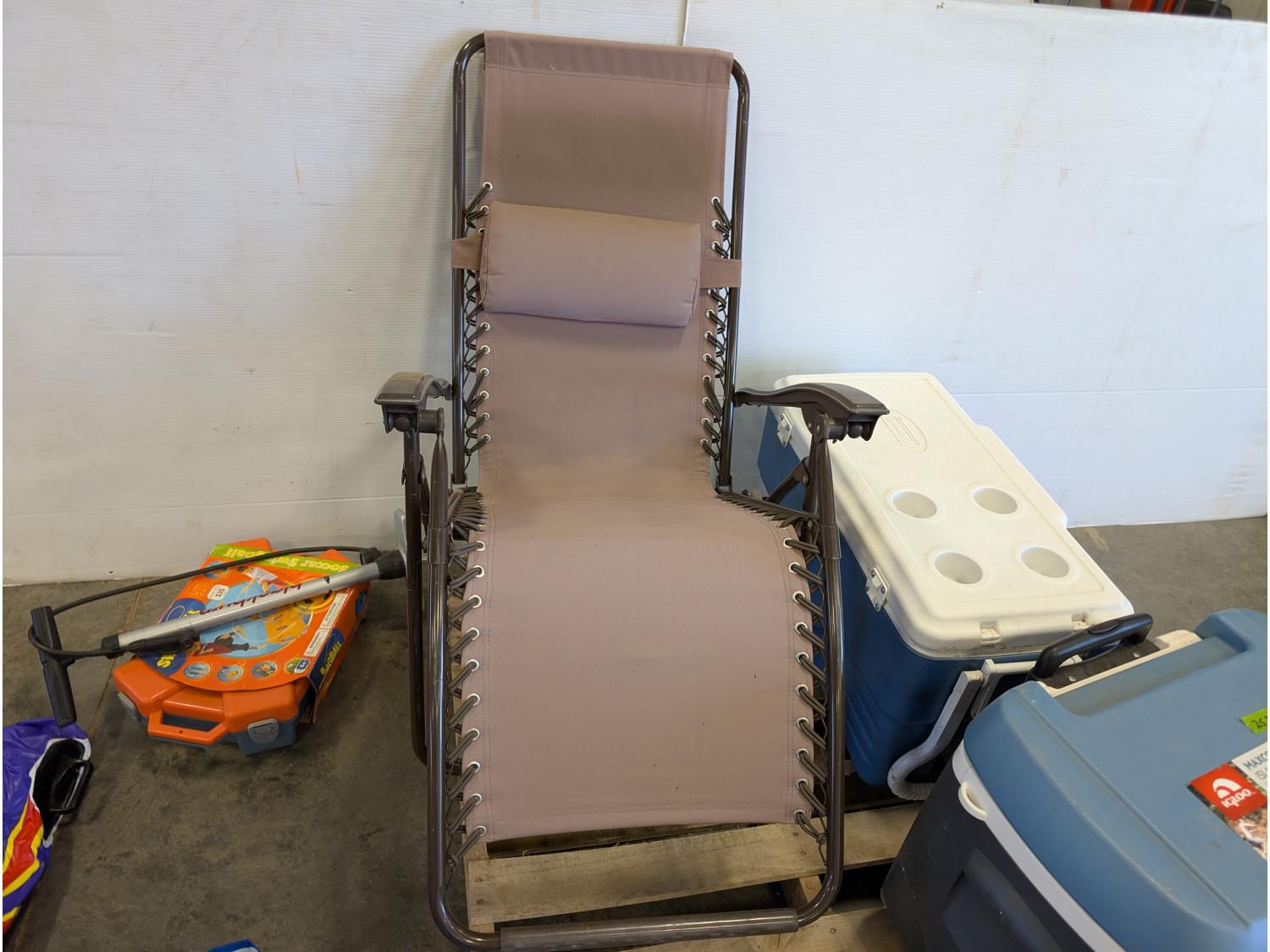 (2) coolers, soccer swingball game, pool float, inflatable boat, folding lounge chair