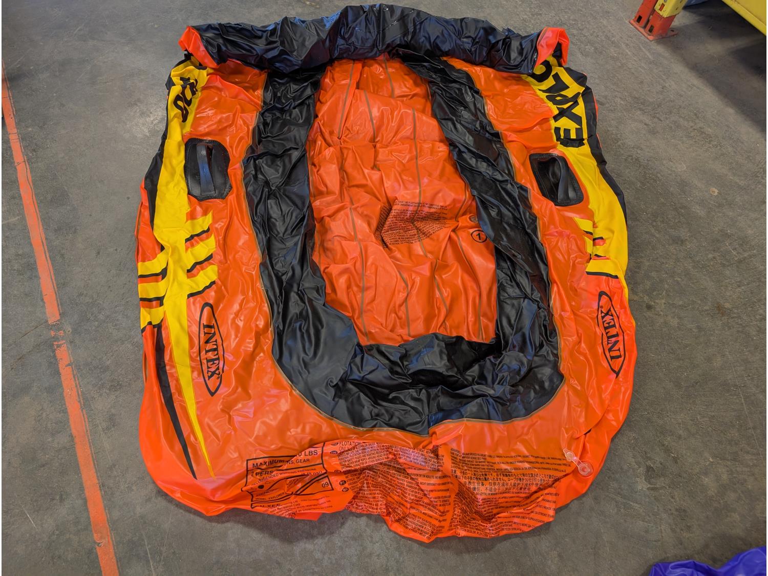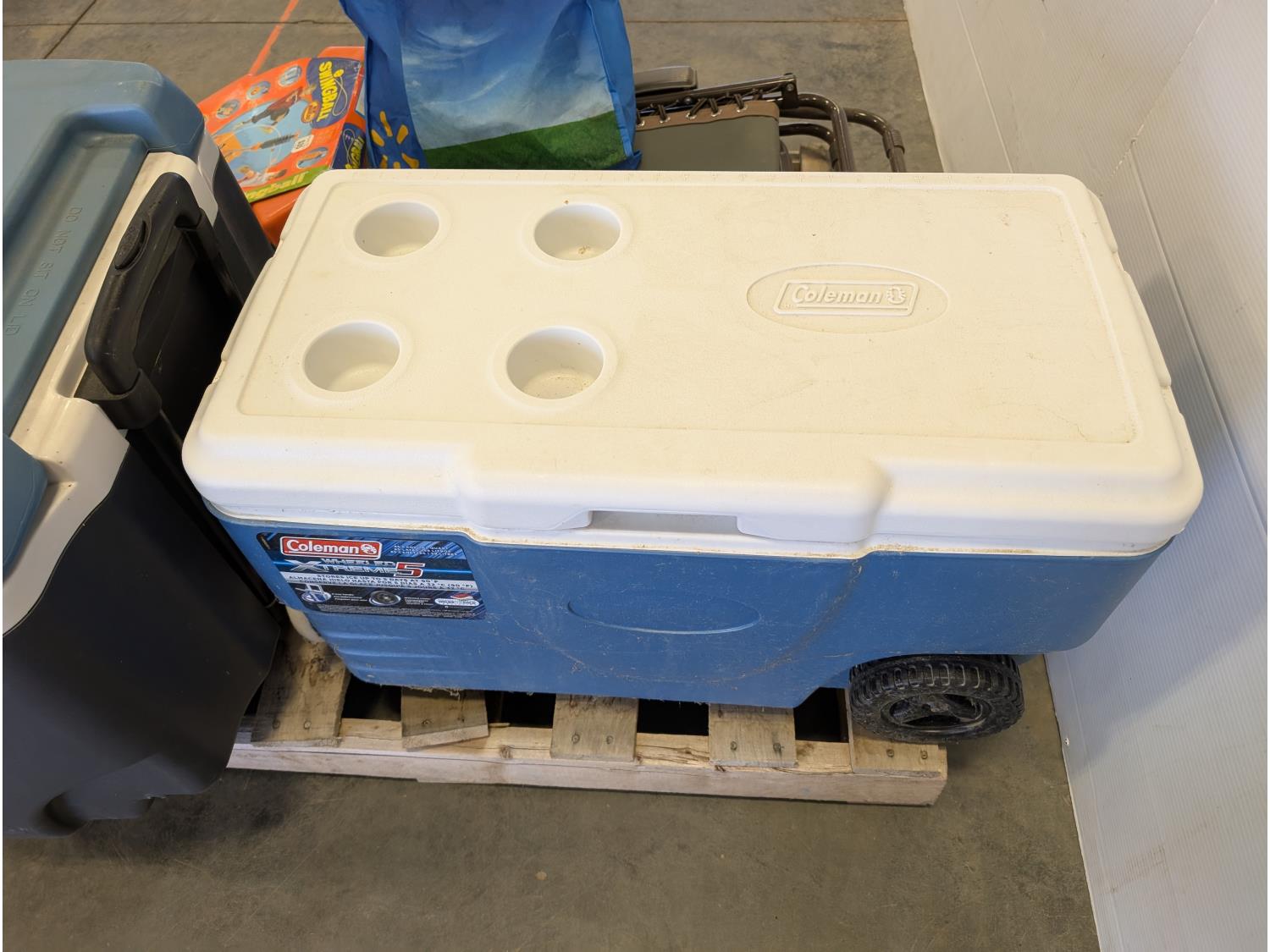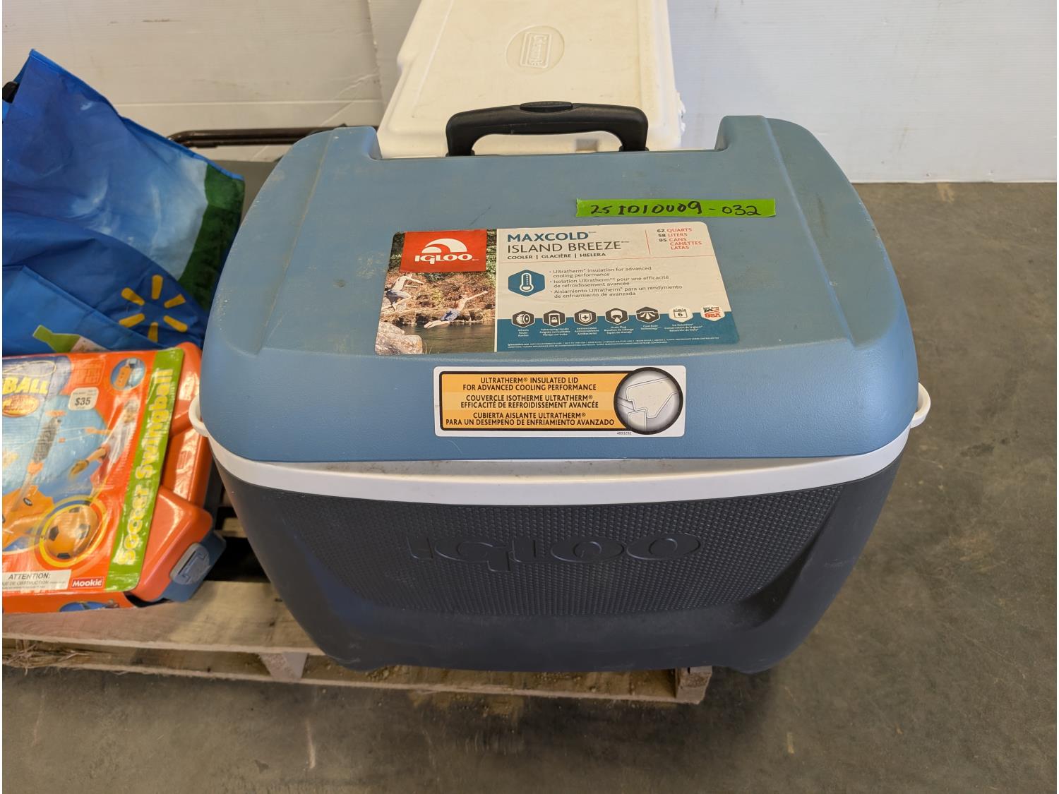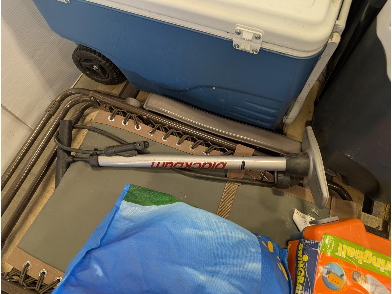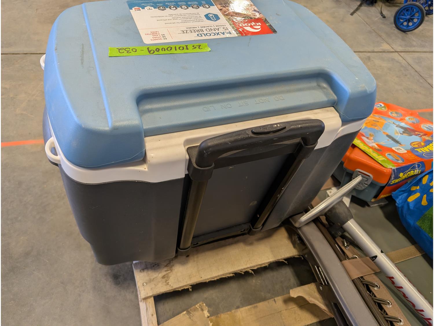 (2) coolers, soccer swingball game, pool float, inflatable boat, folding lounge chair