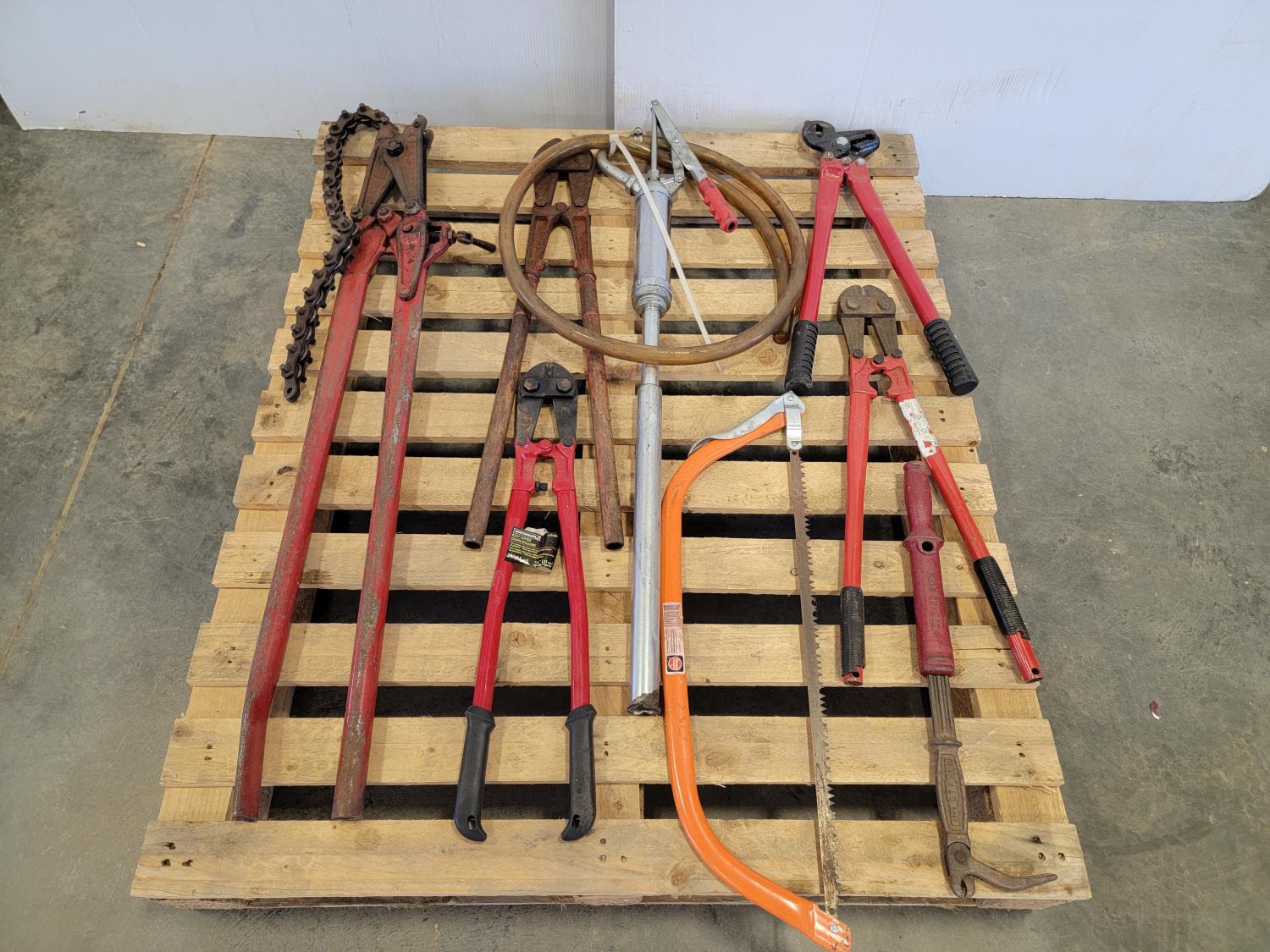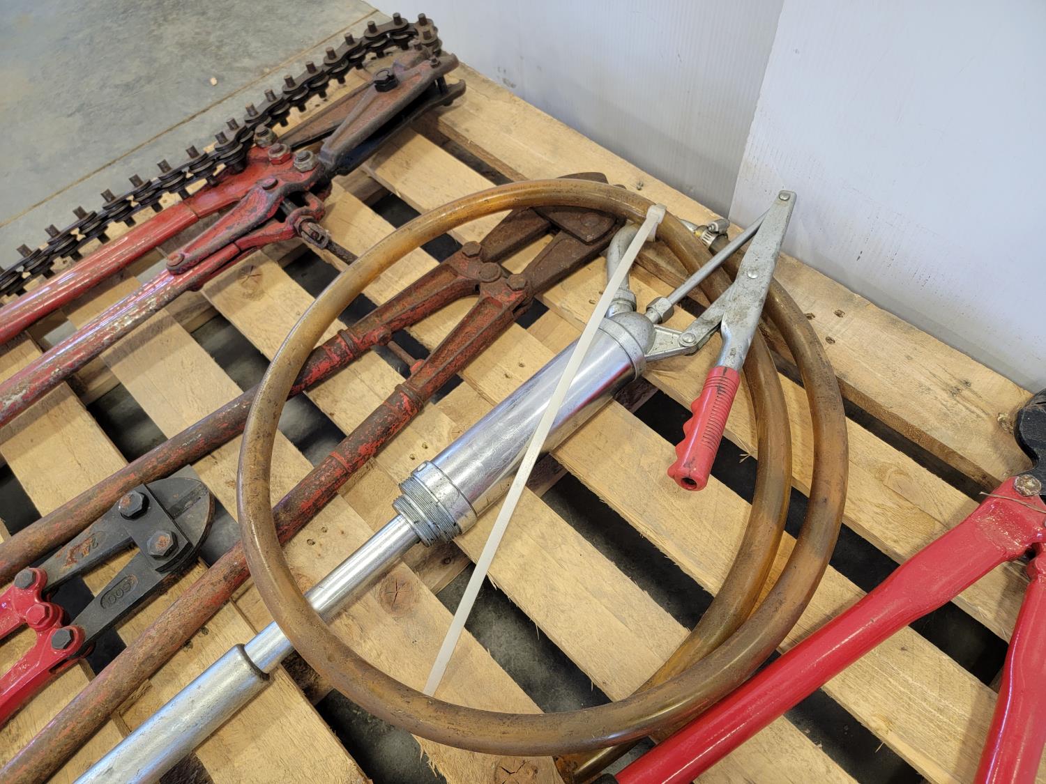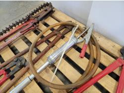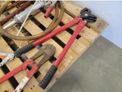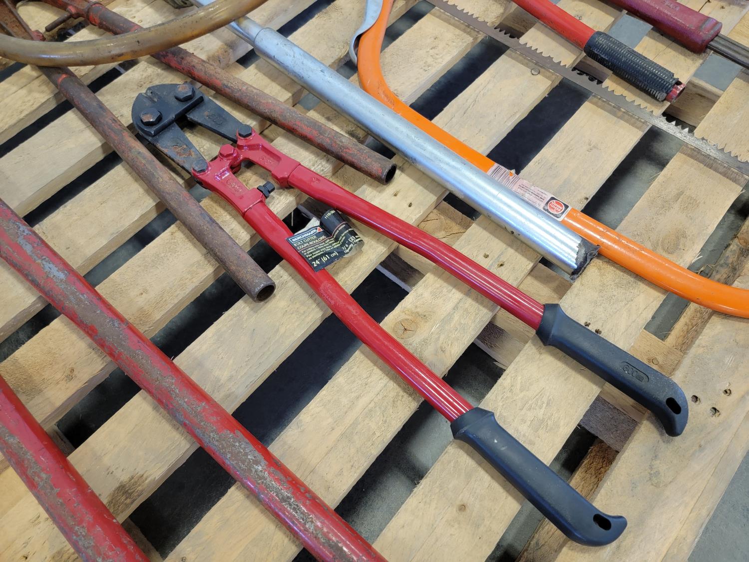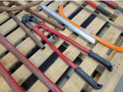Bolt cutters, manual barrel pump, bow saw