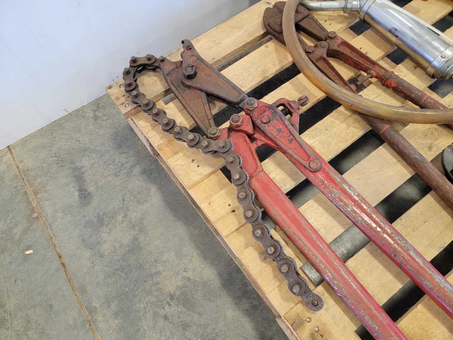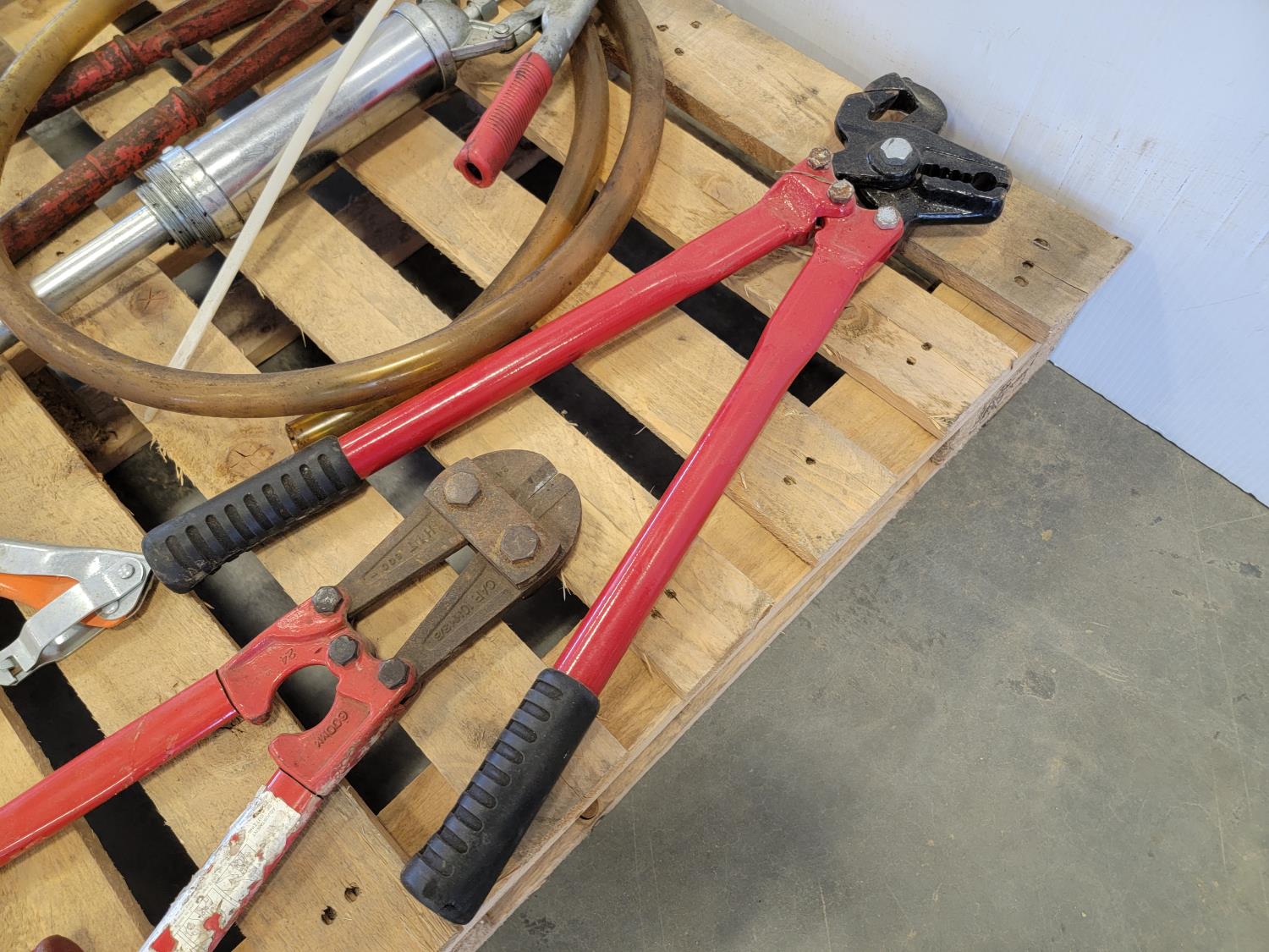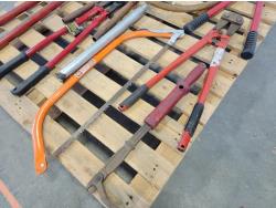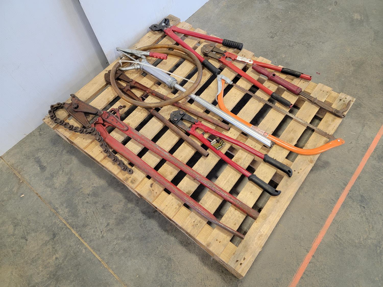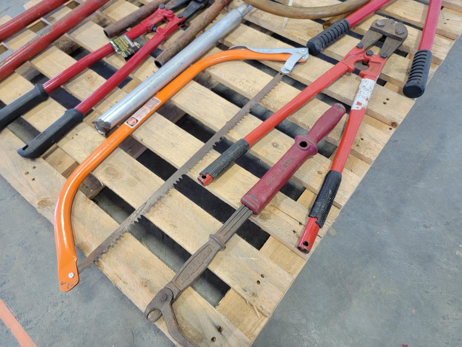 Bolt cutters, manual barrel pump, bow saw