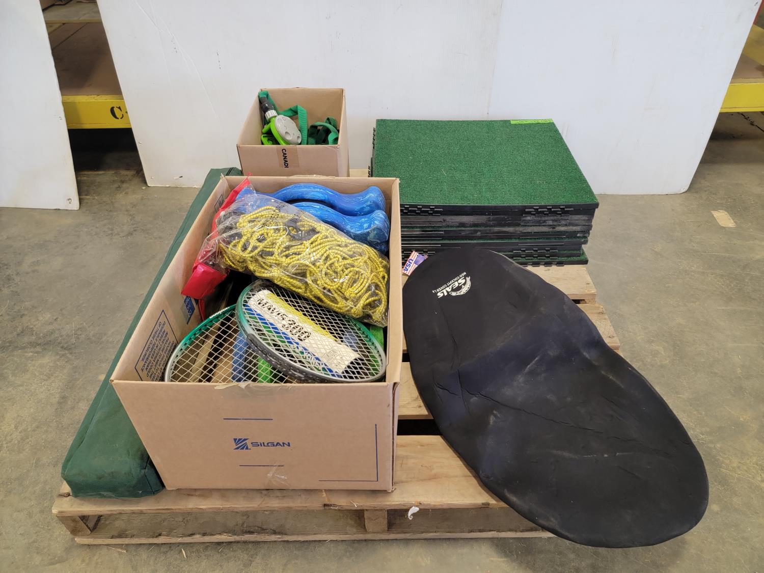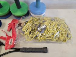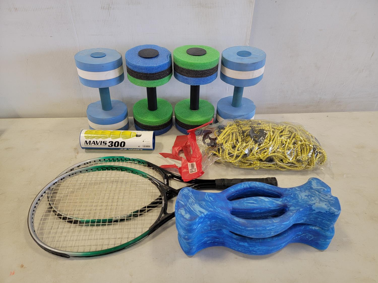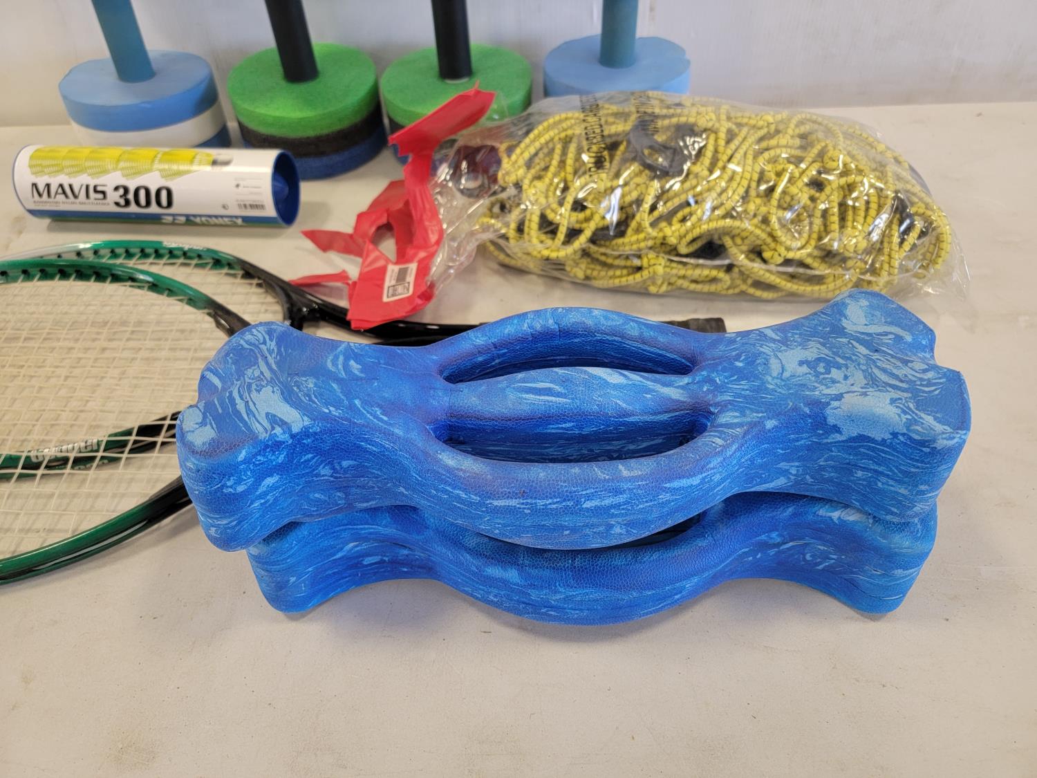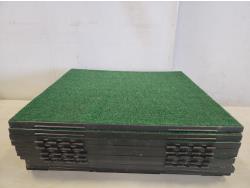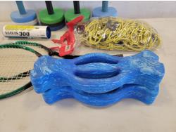 (10) 22 inch x 20 inch artificial turf tiles, water barbells, (2) badminton rackets, ladder golf game