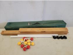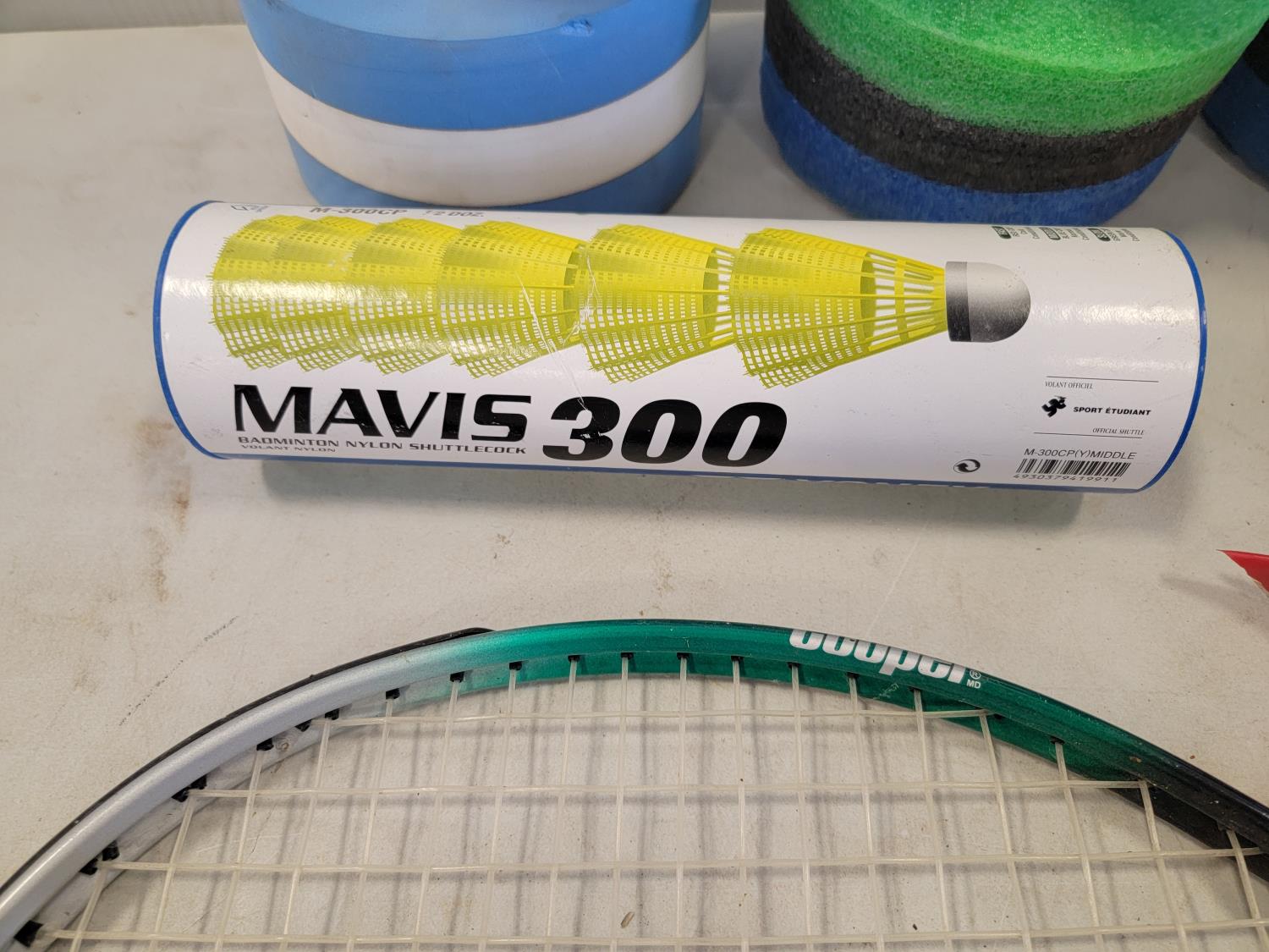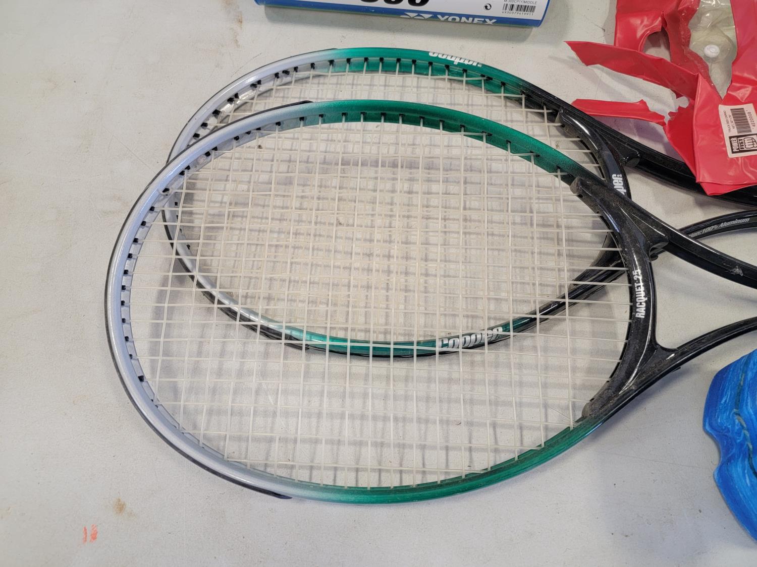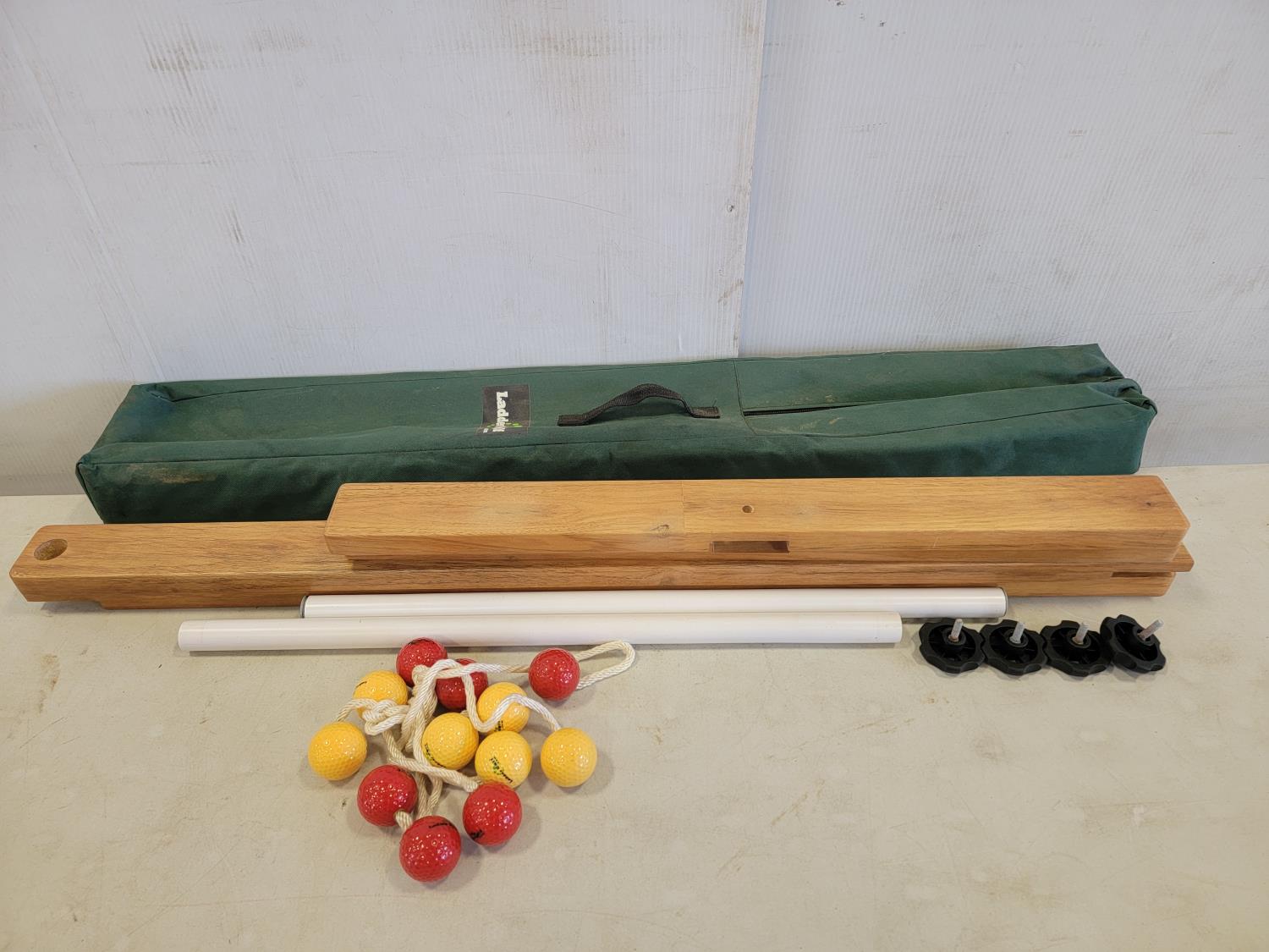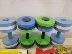 (10) 22 inch x 20 inch artificial turf tiles, water barbells, (2) badminton rackets, ladder golf game