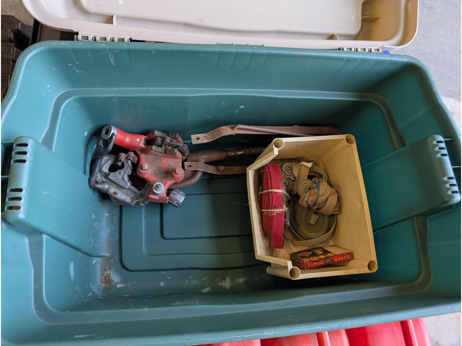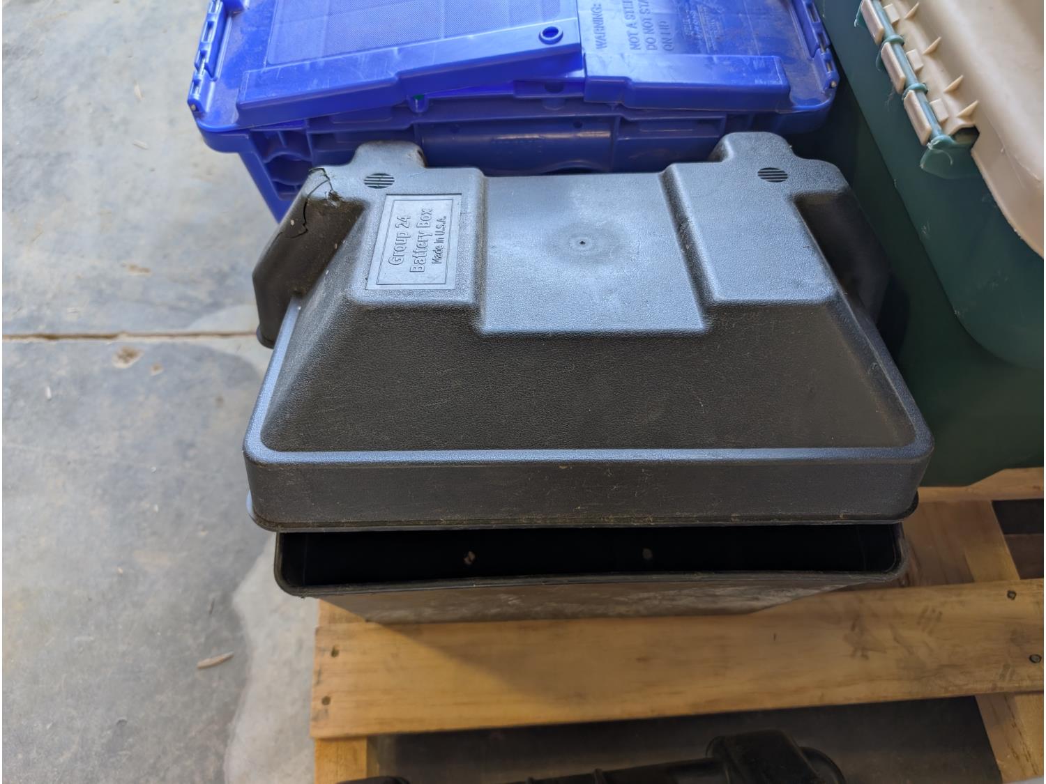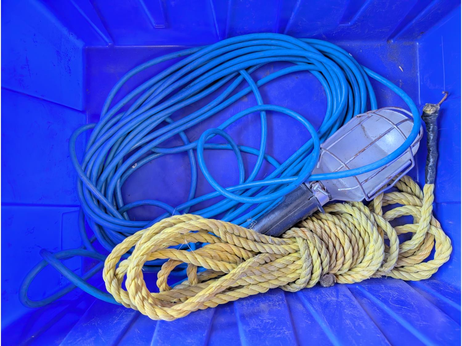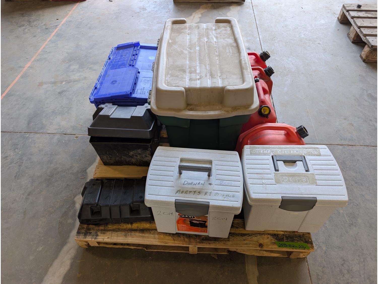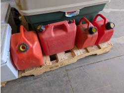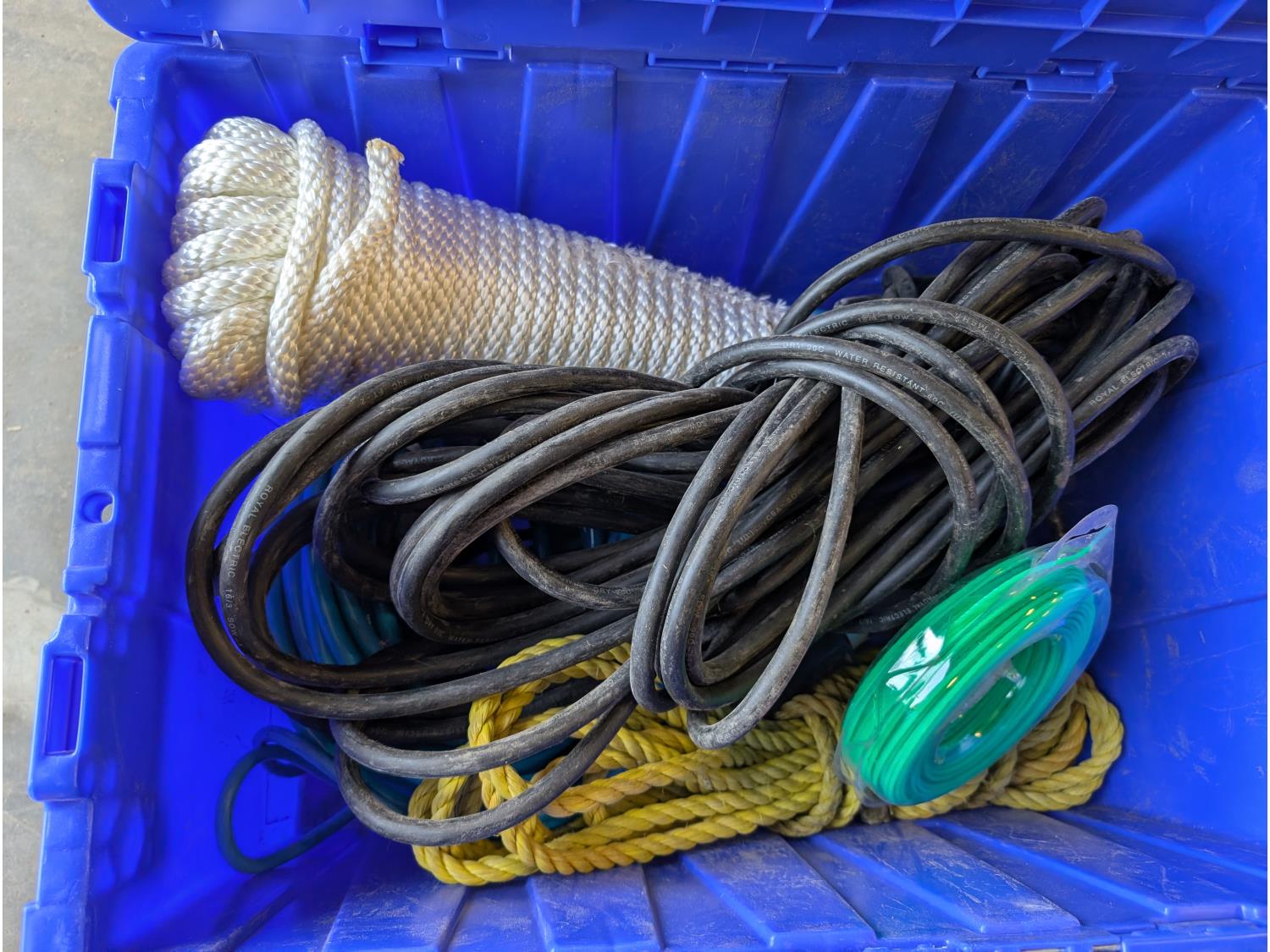 Battery box, hardware, (4) jerry cans, pipe cutters, rope, extension cords, trimmer line,