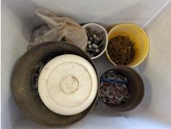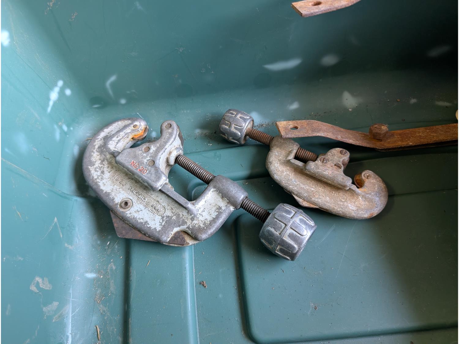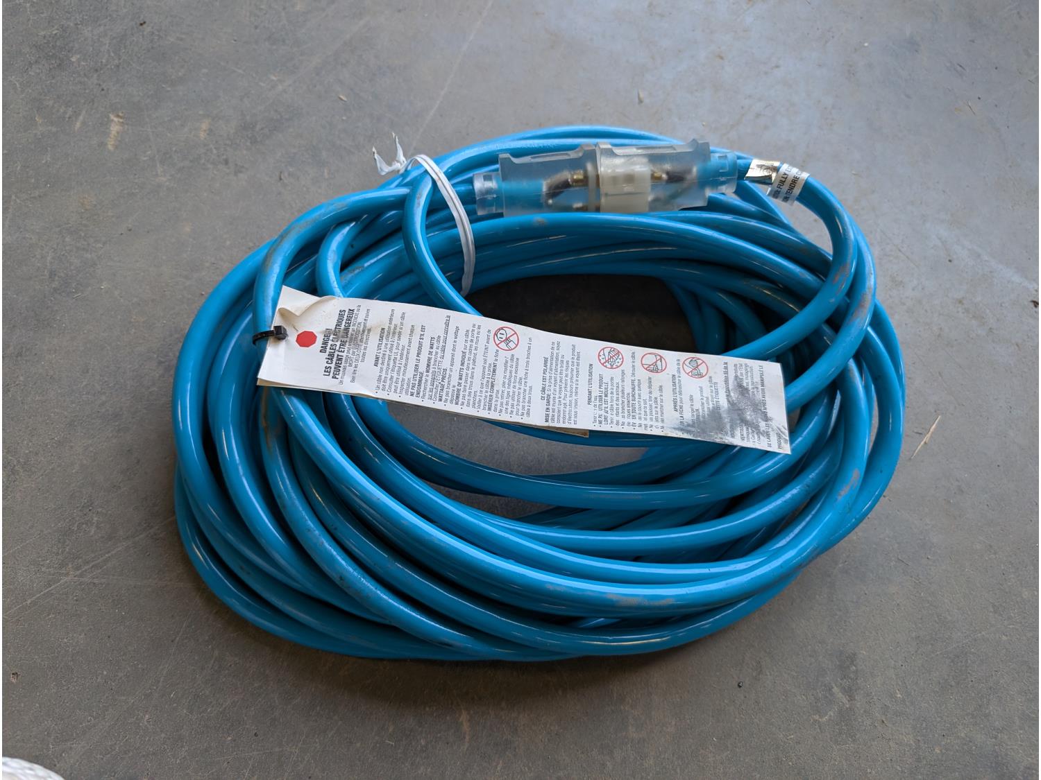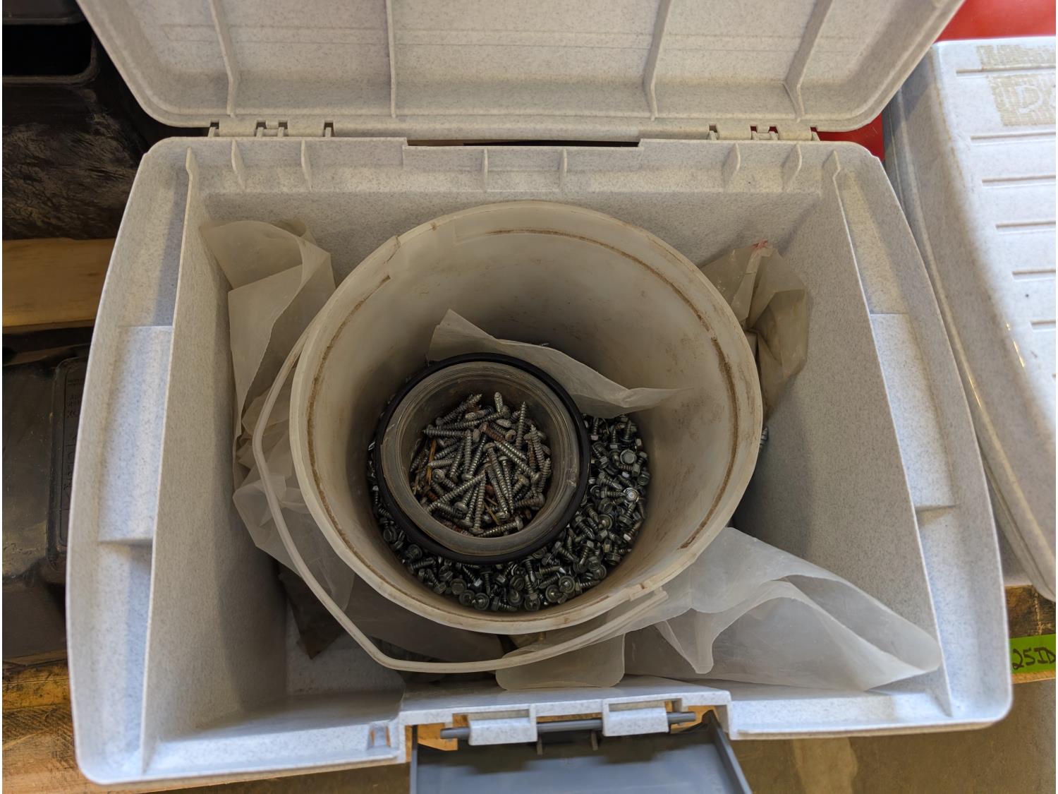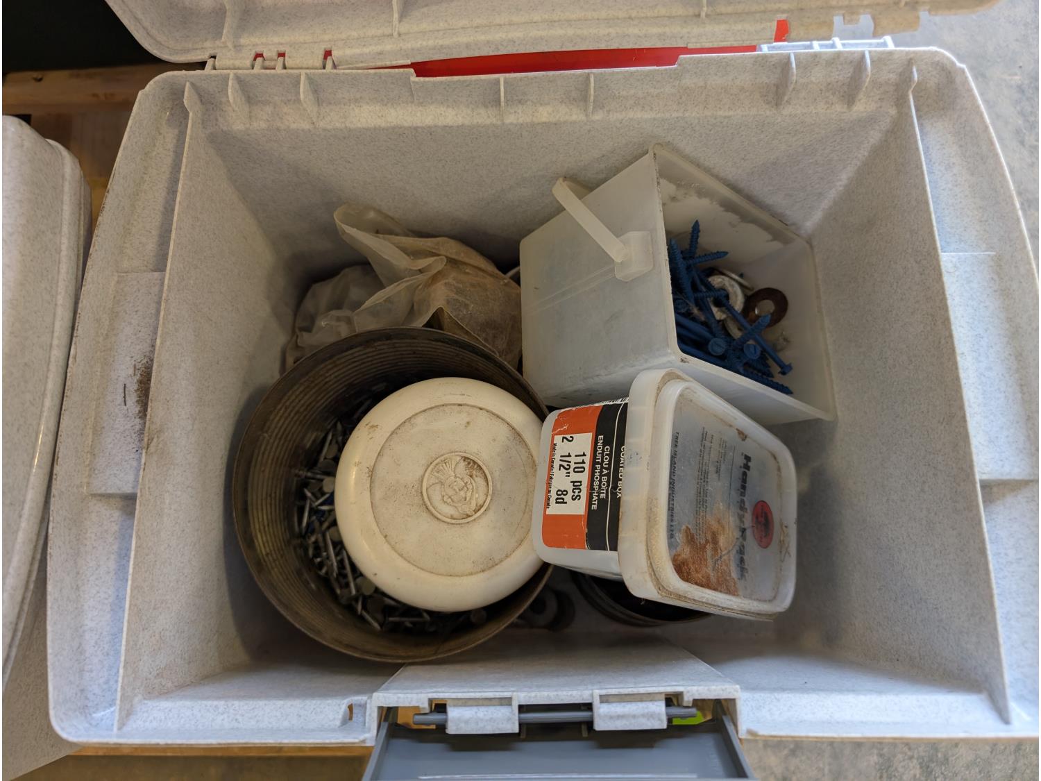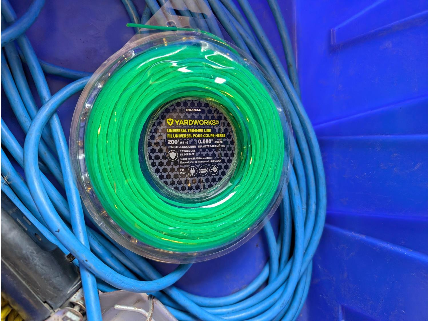 Battery box, hardware, (4) jerry cans, pipe cutters, rope, extension cords, trimmer line,
